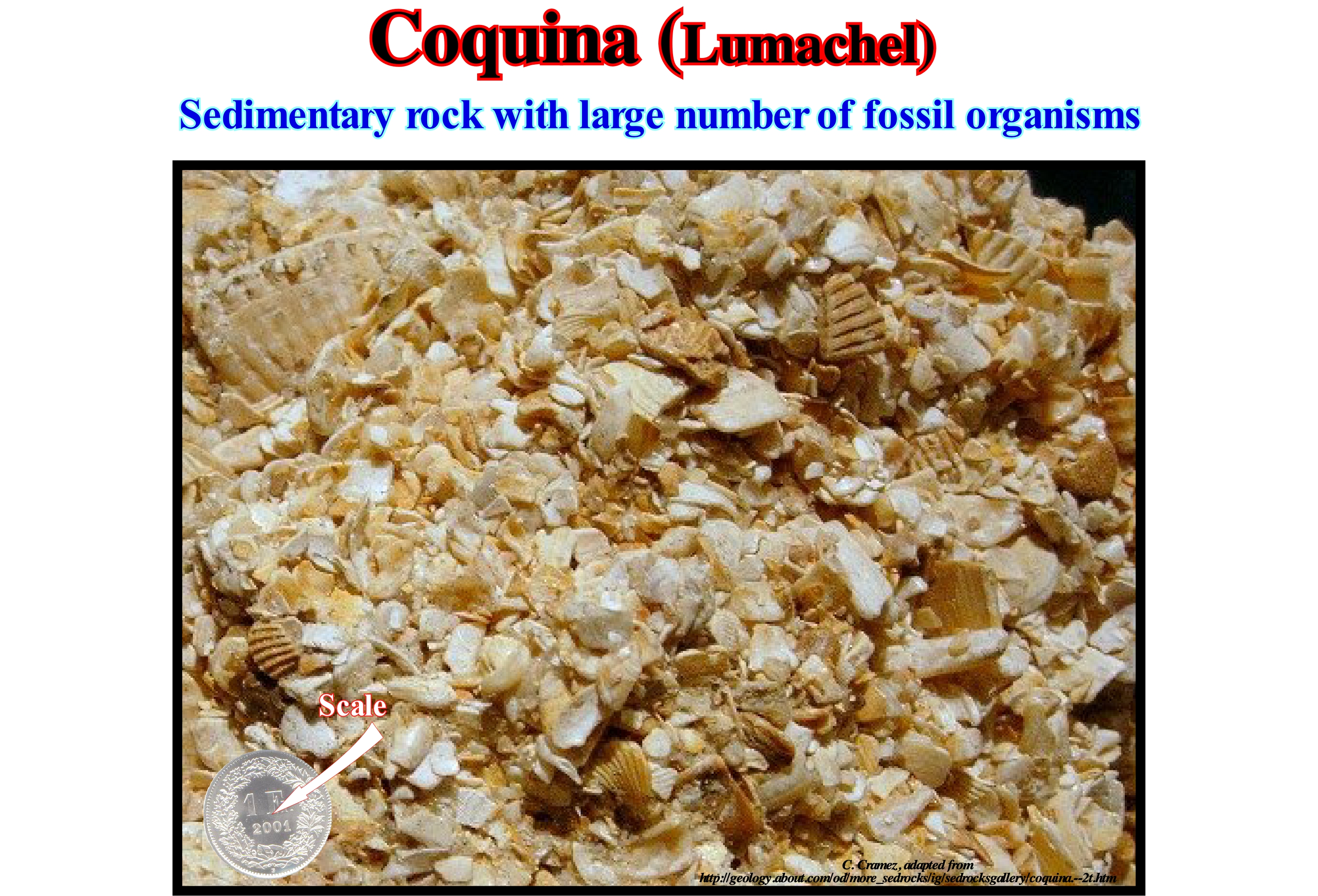 As illustrated in this photograph, a lumachel, sometimes called coquina (Spanish term meaning shell) or calcarenite, is an endogenous rock constituted by deuterogenic sediments, mainly fragments of shells. Because the shells are made of calcium carbonate, lumachels can be considered as endogenous limestones (formed by debris), but not protogeneous (formed by precipitation of calcium carbonate). The lumachels are formed near the shoreline, where the wave action is strong and able to select the sediments, as suggested by the broken but polished particles (by the abrasion of the sea-waves) that constitute them. Many limestone rocks have fossils, but the lumachels are, exclusively, fossils, as can be seen in the lumachel illustrated in this figure. A very cemented lumachel or coquina is, often, referred to as a coquinite, as well as a limestone consisting mainly of shell fossils, which lived where they were deposited (in situ or in situ), sometimes, is called conchoidal limestone. Some geoscientists go further and differentiate the lumachels and allochthonous conchoidal limestones (formed by fragments that were not transported) from the native lymphocytes and conchoidal limestones (formed by fragments that were transported from other sites). Many lumachels are formed from reef and sub-reefal material. This facies is, mainly, represented near reefs and often contains green algae of the genera Gymnocodium, Macroporella and Mizzia. Also fusilins and gastropods can be very frequent. The lumachels were used as a paving material, since being little cemented, they easily split into their components (fragments of coral reefs) and thus can replace the gravel obtained by rock fragmentation, which is much more expensive to obtain. On the other hand, since lumachels, often, contain phosphorus-rich compounds, they are used in some countries as fertilizers.