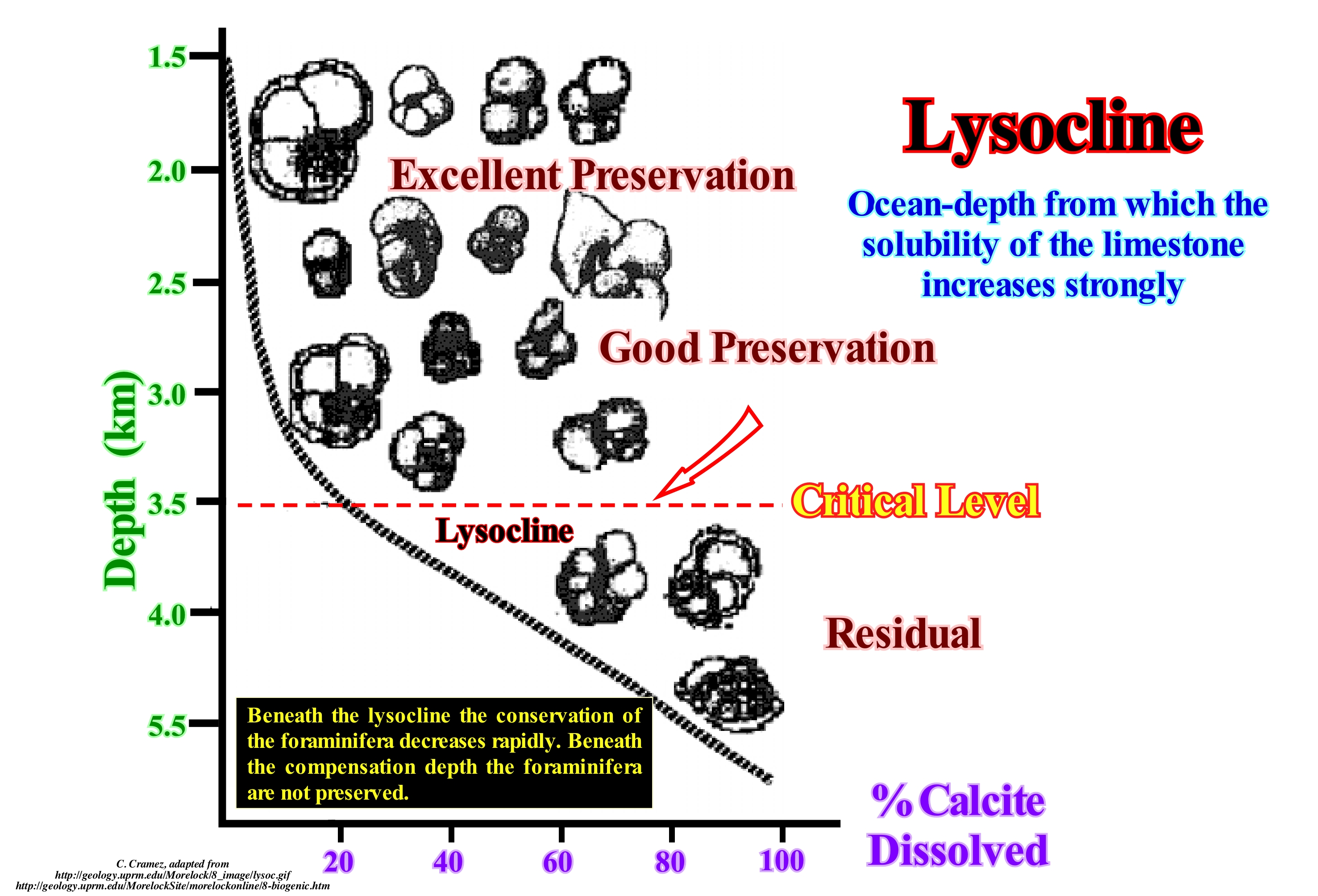 The lysocline is the depth under which most of the sediment carbonates in the ocean floor dissolve. At this level only the most resistant carbonates, such as limestone foraminifera, remain, without dissolving, whereby sediments still contain carbonate remains. There is a second level, the so-called "calcite compensation level" or "calcite compensation depth" (NCC/PCC, or CCD, meaning "Calcite Compensation Depth"), under which the totality of the carbonates dissolves. The chemical reaction can be translated as: CaCO3 + H2O + CO2 → Ca2+ + 2HCO3-. The lysocline is, currently, between 3,000 and 5,000 meters deep, corresponding, more or less, to the average depth of the oceans. Lysocline can vary according to multiple factors, including CO2 concentration, water acidity level, or latitude, reaching places like Antarctica just a few hundred meters below the surface. The necessity of a certain depth for the dissolution of carbonates is due to the solubility of the same increase with the decrease of the temperature and with the increase of the pressure. It is precisely this temperature dependence that causes lysocline and PCC not to be parallel in the ocean, with the CCD being, generally, farthest from lysocline in the centre of the ocean basin and near the banks. At other times lysocline has undergone important variations, for example 55 million years ago during the Paleocene / Eocene Thermal Maximum (MTPE), where it rose, drastically, all over the planet due to the increase in temperature and CO2 (http: //fr.wikipedia.org/wiki/Lysocline). This transient global warming interval (± 55 Ma) is associated with ecosystem transformation and changes in the carbon cycle and, probably, caused by the entry of large amounts of CO2 and CH4 into the ocean / atmosphere system.