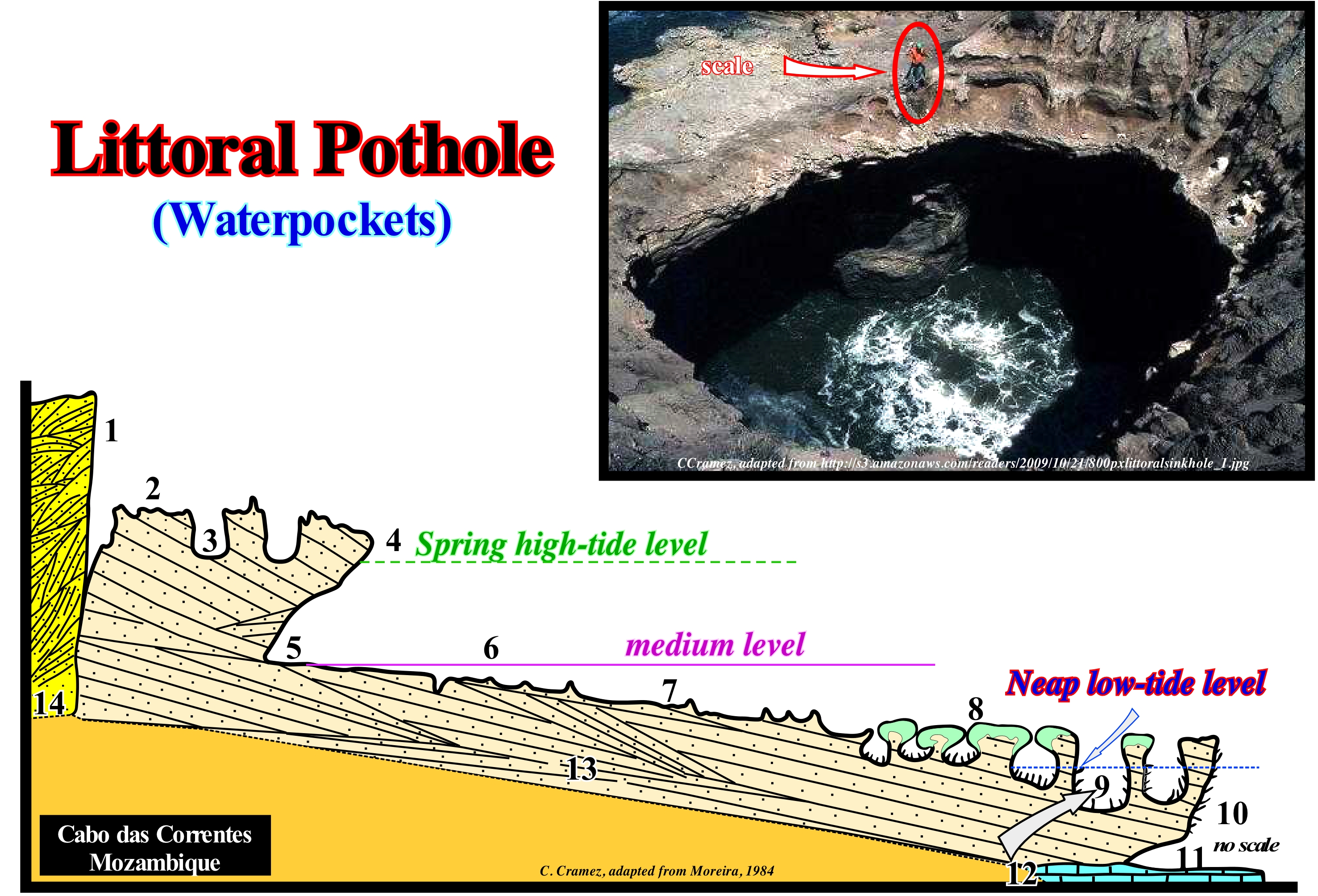 In certain Central American islands, the broader forms of the littoral potholes are called water-pockets. As illustrated in this sketch, the geometry of the littoral potholes suggests a mechanical, swirling reinforcement similar to that produced by the giant kettles and drilling kettles. Littoral potholes may have a border or not, which may be elliptical or even lobed, when the water-pockets result from the coalescence of simple forms. Sometimes they retain, among them, remains of the coalescing walls, made up of rocky septa. The depth of the littoral potholes varies between 5-6 and 10 meters, being the deepest ones in the lower part of the strand. The dissolution processes are, essentially, biochemical and each water-pocket corresponds to an ecological niche. The geological section of the Cabo das Correntes (Mozambique), illustrated above, shows a characteristic zoneography of the main types of micro-forms of the coastal karst in aeolianites and sandstones. From the mainland to the sea, the following micro-forms are recognized: (1) Alveolized dead cliff ; (2) Platform with pointed littoral clints; (3) Upper littoral potholes, i.e., located above the spring high-tide level ; (4) Visor cliff ; (5) Undercut (notch, groove) ; (6) Platform with solution benches and embryonic water-pockets (below middle sea level) ; (7) Platform with solution benches encrusted by calcareous algae ; (8) Tubicolous bioconstructed platform (above spring low-tide level) ; (9) Lower littoral potholes, more or less, located at the spring low-tide level ; (10) Overhanging surface cornice due to wave surfing ; (11) Submerged undercut (notch, groove) ; (12) Dead coral reef. Sandstones (13) and aeolianites (14) are the rocks that make up this coast. The levels of high-tide and low-tide, which correspond to the tides during the syzygies (full moon and novilunium), are characterized by large amplitudes. The equinoctial tides, which occur on the equinoxes, have maximum amplitudes.