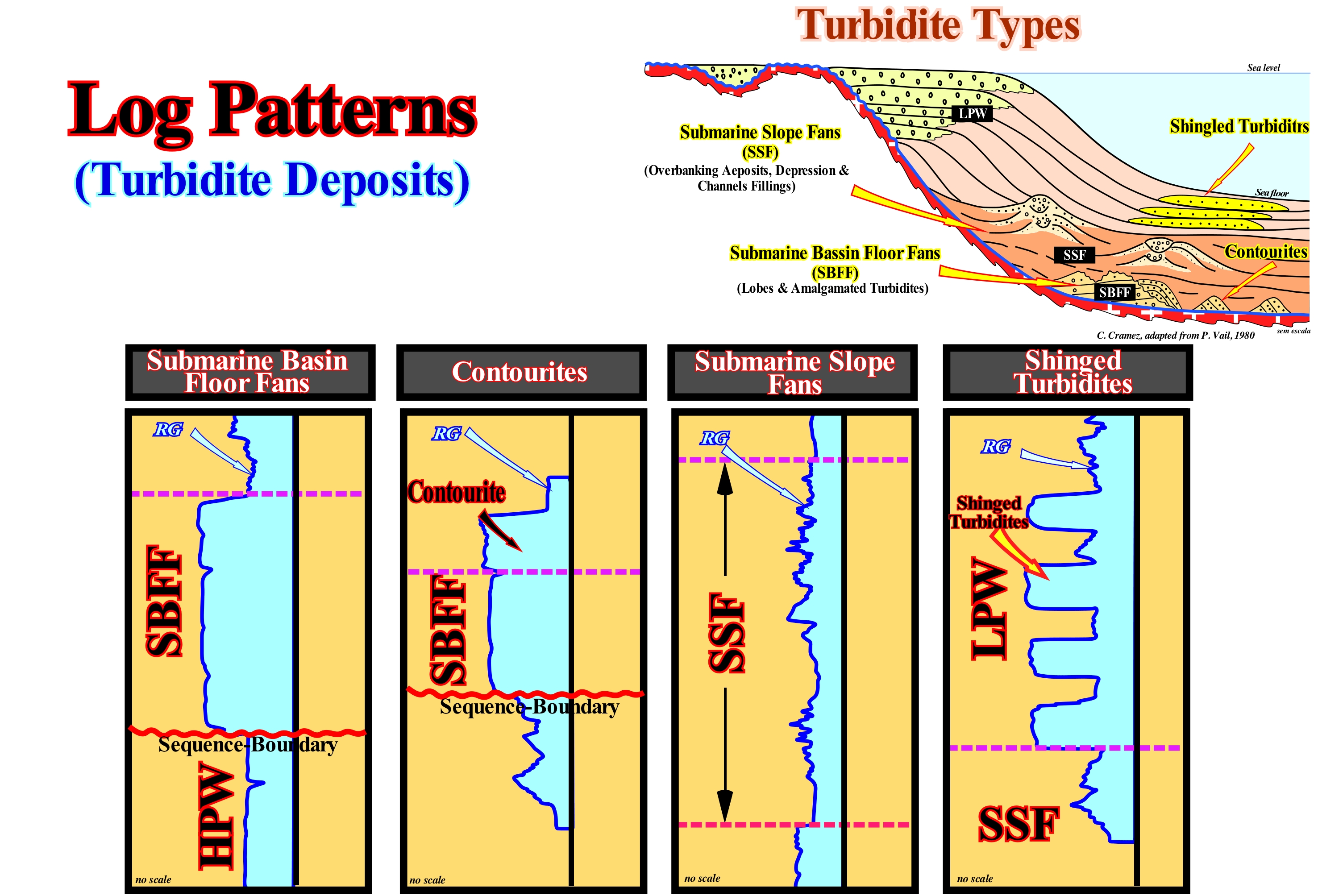 In this sketch, the most frequent morphologies of the gamma ray (RG) log of the main turbidite deposits of the lowstand systems tracts group group (LSTG), that is to say, of the (i) Submarine Basin Floor Fans (SBFF) ; (ii) Submarine Slope Fans (SSF) and (iii) Submarine fans cones associated with the lowstand prograding wedge ( LPW), i.e., "shingled turbidites". As shown in this figure, the lowstand systems tracts group (LSTG) of a sequence-cycle, when complete, is composed of three sedimentary systems tracts subgroups, which from bottom to top, are: A) Submarine basin floor fans (SBFF), sometimes with associated contourites* ; B) Submarine slope fans (SSF), with their characteristic "gull-wings" structures and (iii) Lowstand prograding wedge (LPW), sometimes, with shingled turbidites associated. In each of these subgroups can be deposited reservoir-rocks, generally. of sandy facies, either in the form of lobes or in the form of channel fills or elongated depression fills between the turbiditic levees (natural marginal dykes). The morphologies of the spontaneous potential (PS) and gamma ray (RG) logs of lowstand systems tracts subgroups are the most characteristic. From this figure, it can be said gamma ray log of the submarine basin floor fans (SBFF) are, generally, cylindrical in shape and the lower and upper limits are abrupt. The lower limit corresponds to the lower unconformity (erosional surface) of the sequence-cycle to which the submarine basin floor fans belong. The upper limit corresponds to the downlap surface of the of the submarine slope fans (SSF), whose progradations have almost always opposite vergence (gull-wings structures induced by de deposition of turbiditic natural marginal dikes, i.e., levees). The morphology of these logs in the contourites is similar to that of the submarine basin floor fans. The internal configuration of the contourites is parallel. However, the seaward depositional slope of the contourites, which has no influence on these logs, except in the "dipmeter"**, may be greater than 10°, which contrasts sharply with the horizontal behaviour of the submarine basin floor fans. In the submarine slope fans (SSF), the log morphology is characterized by a succession of increasing and decreasing upward intervals, which are typical of the overbanking deposits (natural turbiditic marginal dykes) and the depression fillings, between them, that sometimes, correspond to turbidite channels, when there is erosion. The lower limit may correspond to an unconformity (in the absence of submarine basin floor fans), but the upper limit almost always corresponds to the downlap surface of the progradations of lowstand prograding wedge (LPW). Finally, in shingle turbidites, which are, generally, deposited on the base of the progradations of the lowstand prograding wedge (LPW), above the submarine slope fans (SSF), the logs correspond to a repetitive vertical successions of cylindrical morphologies, i.e., with abrupt limits, like that of the submarine basin floor fans (SBFF). However, the limits of each of these lobes do not correspond to unconformities, but to simple nondepositional hiatus. Under certain conditions, submarine shingle turbidites at the base of progradations of the highstand prograding wedge (HPW), without any unconformity between them and the deep shales of the progradations associated with instabilities of the continental edge or to repeated flooding periods of coastal plain water-courses (landward of the depositional coastal break of the depositional surface).