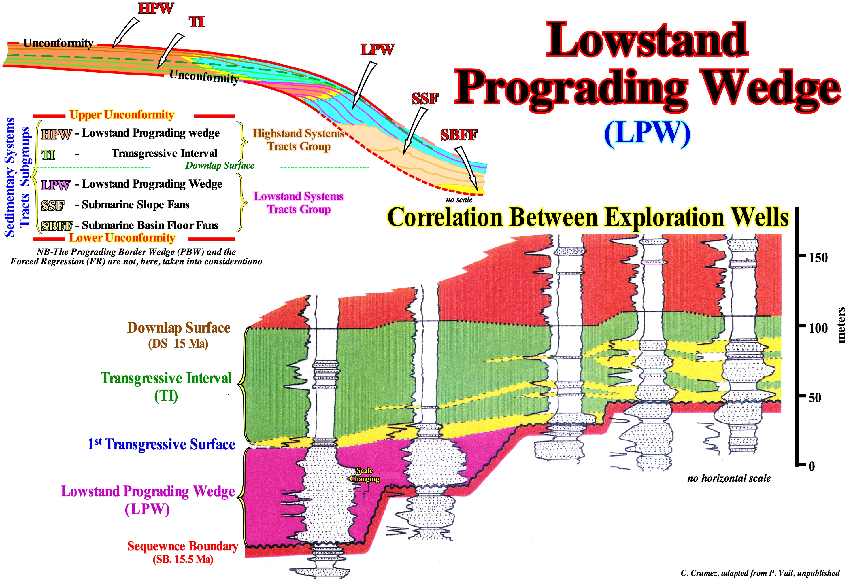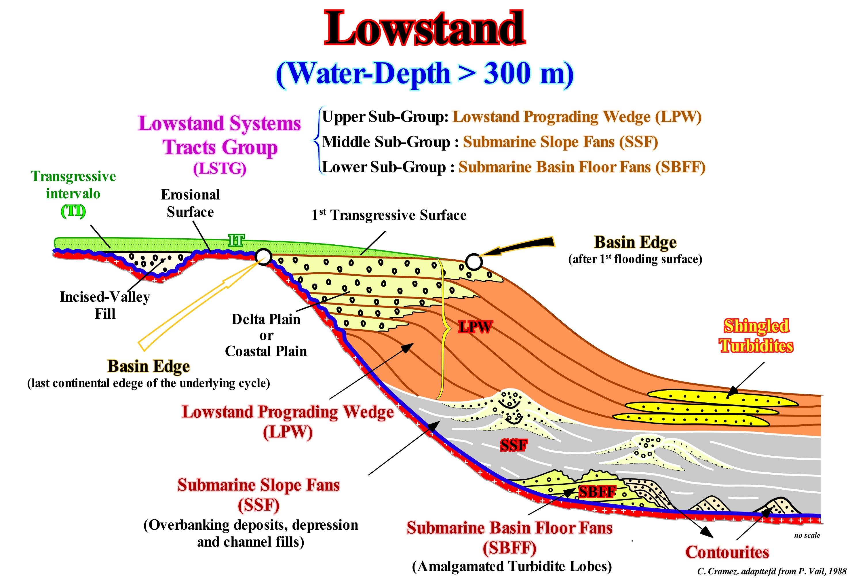 (*) This terminology has nothing to do with the depositional water-depth depth of the intervals forming the lowstand systems tracts group. The sedimentary intervals forming this group of systems tracts do not necessarily deposit under a great water-depth, although this is the case of the submarine fans. The depositional water-depth of the sediments forming the lowstand prograding wedge (LPW) is very weak in the proximal area and, relatively, important in the distal area, since the lowstand prograding wedge geometry is progradational.