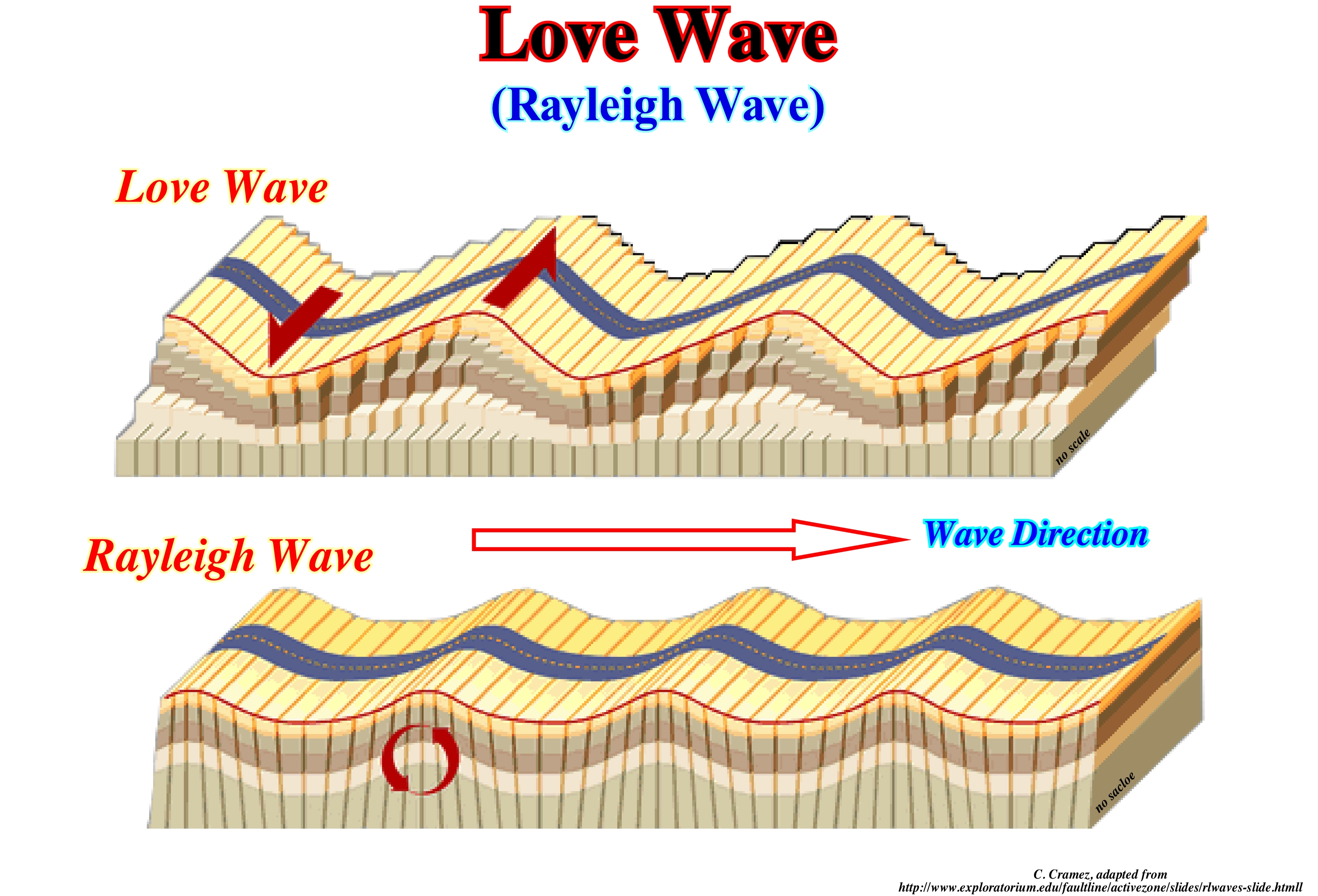 Love waves are easily differentiated from Rayleigh waves. Rayleigh waves have a vertical and horizontal component, which is not the case with Love waves that have only one horizontal component. During earthquakes, certain seismic waves move, exclusively, along the Earth's surface. They are called surface waves by contrast to body or volume waves. Surface waves can be either Love or Rayleigh. Above, Love waves move sideways, and Rayleigh waves move in a circle (orbital motion), that is, forward, down, and then back and up like the sea-waves. The surface waves decrease in depth. Miners who work a few tens of meters deep, rarely, feel them during earthquakes. As Love waves travel to the surface, their amplitude decreases, exponentially, with the depth of the earthquake. Given its confinement to the surface, the amplitude decreases by 1/√r, where r represents the distance the wave travelled from the epicentre*, which means that surface waves slow down more, slowly, than P or S body waves. Large earthquakes can generate waves of Love that give the return to Earth before dissipating. They take a long time to dissipate because it contains a lot of energy. That is why the waves of Love are very destructive near the epicentre (vertical hypocenter).