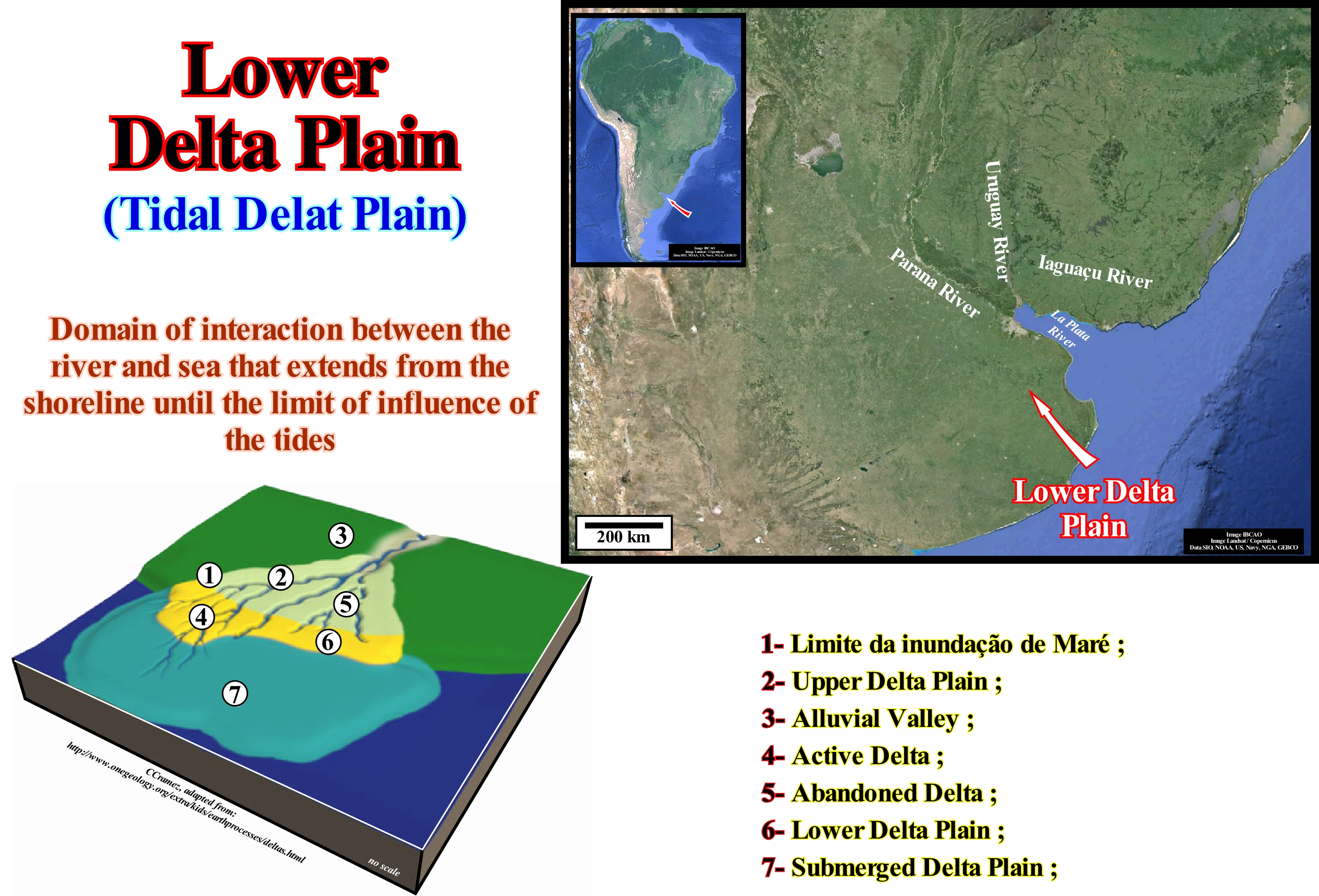From upstream downstream, the physiographic elements of a delta are: (i) Upper or Sub-aerial Delta Plain, which can be divided into high upper delta plain (active or abandoned) and low upper delta plain (active or abandoned) ; (ii) Lower or Subaqueous Delta Plain ; (iii) Delta Front ; (iv) Prodelta and (v) Bottom of the Delta (corresponds to the sub-horizontal lower layers that are, sometimes, present in certain types of deltas and in which turbidite sandy horizons, i.e., proximal turbidites can be found. These physiographic elements, characterized by typical depositional systems, are synchronous and genetically associated. They form a sequence-paracycle and are deposited during the stability period of relative sea level that occurs after each relative sea level increment (eustatic paracycle) of a marine ingression. In fact, a significant marine ingression (relative sea level rise) is not done in continuity, but by increments separated by stability periods of relative sea level*, i.e. the relative sea level rises, stabilizes, and then rises again, etc. A vertical stacking of sequence-paracycles of this type, i.e., of deltas of the same sedimentary systems tract or systems tracts belonging to sequence-cycles, forms what the geoscientists call delta building. The lower delta plain of the Paraná Delta Building (province of Buenos Aires, Argentina) covers about 2,999 km2. This area, as illustrated in this figure, at present time, it corresponds to the downstream sector of the De La Plata river, up-build and out-build into the estuary of the river. The hydrology of this lower delta plain is, mainly, determined by the estuaries of the Paraná and la Plata rivers. In reality, la Plata river is not a river, but rather the estuary created by the Paraná and Uruguay rivers that form, on the Atlantic coast of South America, a triangular indentation of about 290 km in length. The la Plata river, which, as said before, is more an estuary than a river, flows from the Northwest to the southeast and is about 48 km wide at the confluence of the Paraná and Uruguay rivers. It corresponds to a large estuary that is about 220 km wide at its mouth in the Argentine Sea (which forms part of the Atlantic Ocean). Approximately 57 million cubic meters of sedimentary particles are transported annually to the estuary of the provinces of northern Argentina and southern Brazil. As a result, the navigation channel between the Atlantic and Buenos Aires is, continuously, dredged in order to be maintained open to navigation. In this area, it appears that fissures (ruptures) in the bed of the water-courses are more frequent than the formation of the natural marginal dykes (levees), since these are, generally, poorly developed. The vegetation tolerates salt and is confined to plants that can survive prolonged flooding. In arid climatic contexts, the lower delta plain may be a zone of saliferous plains and dunes. In the lower delta plain, the distributive are influenced by marine processes, such as tidal fluctuation. Abandoned distributive channels can develop in estuaries and be filled by marginal marine deposits. Many old coal deposits are interpreted as having been formed in a context of a lower delta plain. Peat bogs (soil type made of peat) can be formed anywhere, either on the deltaic plain (lower or upper). The marshes of brackish water and salt water form on the lower deltaic plain and tend to form muds rich in organic matter or very rich in sulfur peat due to the mixture of salt-water and terrigeneous matter (climatic conditions are, also, a very important factor). Theoretically, in the lower delta plain, fluvial forms (lagoons, wooded islets, marshes and more or less anastomosed channels) are predominant in the innermost sector, while in the outermost sector, predominate the barrier-bars, spits, beaches and dunes.