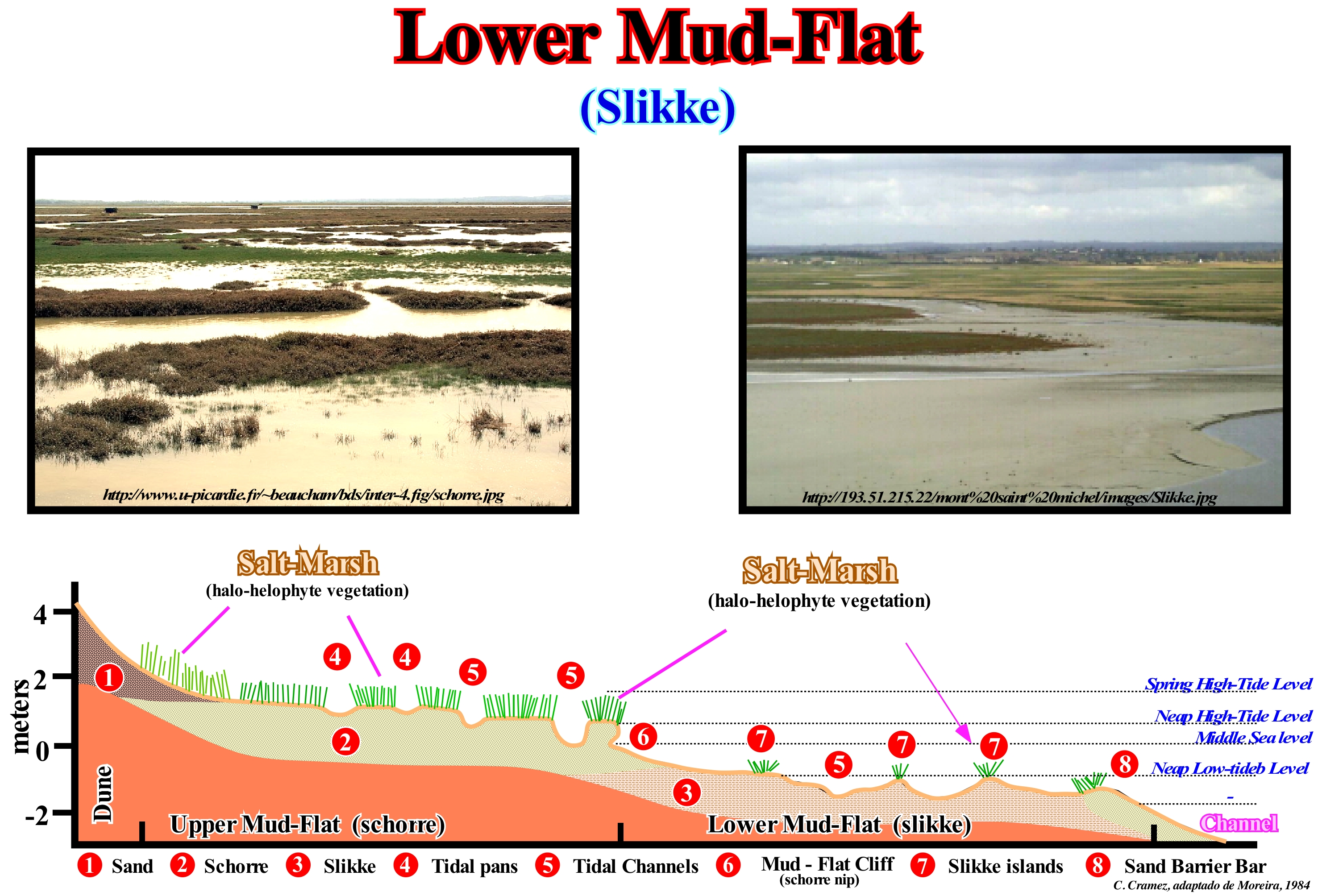 In the morphology of the upper mud-flat (schorre) and the lower mud-flat (slikke) of an estuary (downstream of the dunes, shown in this sketch), from the bottom to the top, it is, relatively, easy to recognized: (i) The slikke, on the low-tide platform ; (ii) The schorre on the high-tide platform and (iii) The sandy dunes. On the other hand, in the low tide platform, which is limited upstream by mud-flat cliff (schorre nip) the and downstream by a canal, we recognize: (a) Tidal channels and (b) Tidal islands, while in slikke, between the islands, tidal pans are recognized. The lower mud-flat (slikke) is, with upper mud-flat (schorre) one of the characteristic areas of the mud-flats of the strand (coastal zone between high tide and low tide levels). These two areas of marshes and bogs are characterized by many different biological environments downstream from the coastal marshes. The lower mud-flat (slikke) is the lower part the strand, i.e, the part that is most often flooded in each high-tide. The sediments are of marine origin (marine erosion) and terrestrial (mainly of the material transported by water-courses). They are relatively fine: muds, clays, shaly sands, etc. The structure and thickness of the lower-mud flat (slikke) vary with the seasons of the year. They depend, mainly, on the abiotic context, namely, on the rheological characteristics, on the terrigeneous influx carried by the floods and on the importance of the tides. The lower mud-flat, also exposed to external conditions (currents, salinity, exposure to solar ultraviolet radiation during low tide, etc.), depends on the biotic context (bioturbation activity of organisms, especially the perforating organisms). The lower mud-flat is poor in vegetation but contains a large amount of bacterial biomass, which plays a key role in the auto-depuration and recycling processes of the dead matter. It also houses a wide variety of species of molluscs (mussels, cockles, etc.), herbivorous molluscs, green crabs, herbivores or fish catchers (mullet, bars, etc.), many worms and molluscs that live in the mud salty, and are a much appreciated food of birds coming to feed themselves during low tide. In the lower mud-flat, biomass is abundant (up to several thousand organisms per square meter during low tide in temperate zones, at least 60 species of fish and crustaceans feeding all or part of their life there). During low-tide, there are thousands of birds that come there looking for molluscs or macro-zoobentos. In general, all geoscientists admit (http://www.ecosociosystemes.fr/schorre.html) that the coastal waters of Europe are characterized by a very marked dichotomy downstream of the schorre and upstream of the slikke. On the other hand, they are almost all agreed that: 1) Slikke is characterized by a halophyte vegetation (adapted to salt) that is distributed in different floors ; (2) The lower part of the slikke is covered at every tide, except during the neap tides, and it is colonized by plants, such as soda (maritime swede) and sea aster (Aster tripolium) ; 3) The middle part of slikke has a thick vegetation due to the obione (Portulacoides Obione) ; 4) The high part of the slikke is composed of fennel (Salicornia sp.), Spartina (Spartina) and (Atropis), sea lavender (Limonium) or artemisia (Artemisia vulgaris) ; 5) The schorre is the part of the mud that is covered only when the great tides ; (6) the salty water is, mainly, composed of soft, smooth-looking, non-vegetated muds containing a large number of bacteria which enable it to play an essential role in the processes of assimilation and recycling of dead organic matter ; 7) The schorre shelters a variety of bivalve species (clams, cockles, etc.), small gastropods, green crabs and (mullet, squares, bars) ; 8) The schorre is frequented by species of shorebirds living in the mud (torches, knights, snipe, tailor), herons and other black-headed gulls and seagulls, chestnuts or mariners, but also by many terrestrial invertebrates and such as spiders, which since the tide is installed run on the water surface, to hunt prey, but also to find partners.