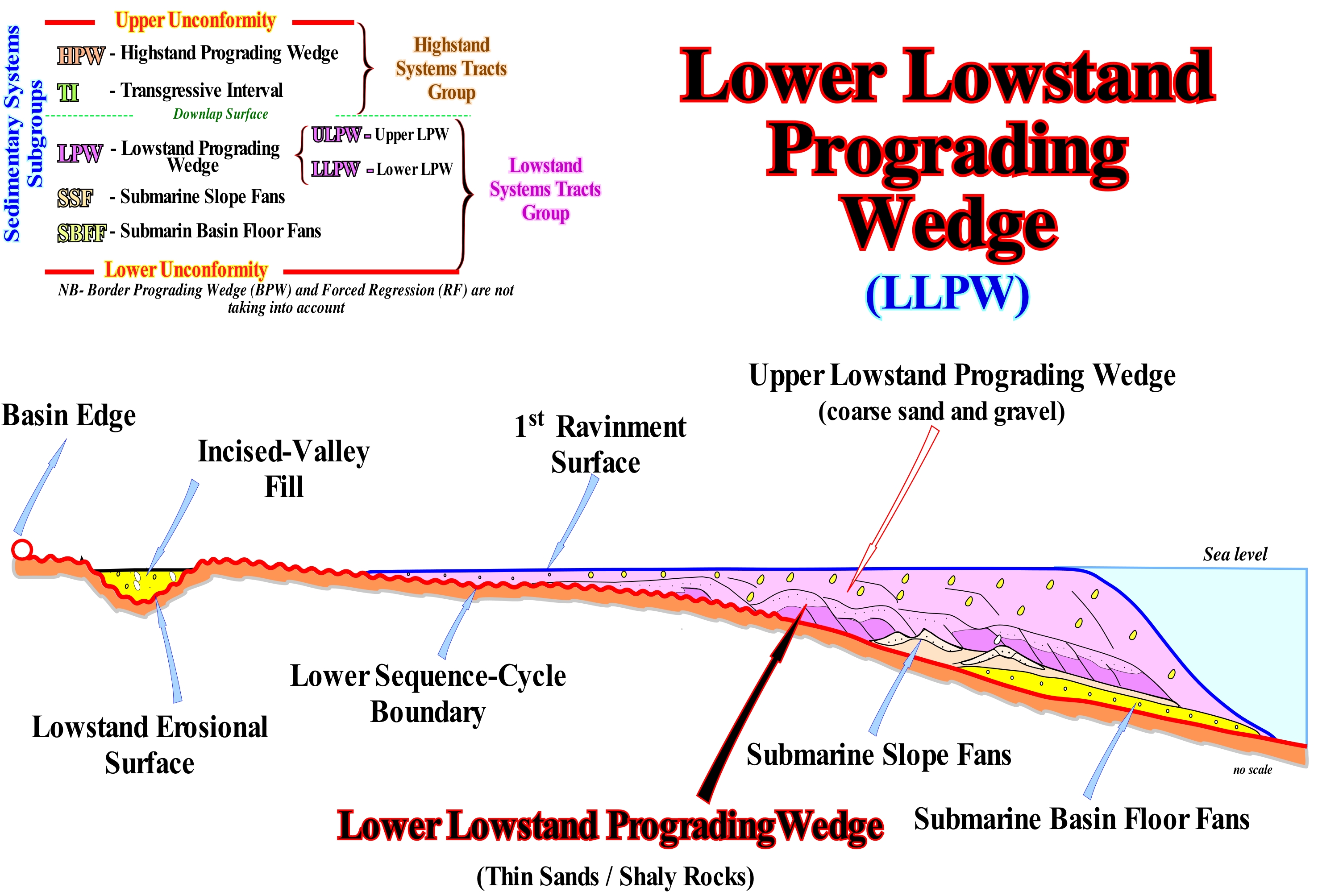 In this sketch, within a sequence-cycle (stratigraphic cycle induced by a 3rd order eustatic cycle, that is, with a time-duration between 3 and 5 My), under the first flooding surface, which emphasizes the end of the deposition of the lowstand prograding wedge (LPW) and above a type I unconformity, which put the relative sea level* underneath the basin edge, are represented the three sub-groups that form the lowstand systems tracts group (LSTG). From bottom to top, they are: (i) Submarine Basin Floor Fans (SBFF), with which, contourites are, often, associated ; (ii) Submarine Slope Fans (SSF) and (iii) Lowstand Prograding Wedge (LPW), with shingled turbidites deposited at the base of progradations of the lowstand prograding wedge. The contourites** are deposits induced by the contour currents*** that erode, locally, the submarine basin floor fans, depositing the sediments not very far with an important depositional dip. Shingled turbidites are, often, associated with instabilities of the continental edge of the lowstand prograding wedge. With the exception of sediments deposited during the first flooding of the coastal plain (or delta plain of the lowstand prograding wedge), all other sedimentary intervals were deposited under lowstand geological conditions. The unconformity, which limits the base of these deposits (including the incised-valley fills), was created by a significant relative sea level fall, which put the relative sea level lower than the basin edge. During this period, the basin edge corresponds to the last continental edge of the highstand prograding wedge (HPW) of the preceding sequence-cycle (if complete, i.e., composed of all sedimentary systems tracts sub-groups), since at the end of the highstand prograding wedge (HPW), in general (second stage of development of the HPW) the basin has no shelf (the shoreline is, more or less, coincident with the continental edge). Except for tectonically enhanced unconformities, the erosion accompanying such a relative sea level fall is insufficient to destroy the morphology of the highstand prograding wedge of the previous sequence-cycle (by definition the time of action of erosive agents is less than 3-5 My). The incised-valley fill, although located upstream of the basin edge, was done under lowstand geological conditions during the last stages of lowstand prograding wedge deposition (early highstand of certain geoscientists). The shift from low to highstand geological conditions corresponds to an acceleration of the relative sea level rise. During lowstand geological conditions, the basin does not have a shelf, which means that, practically and mainly, on seismic lines (taking into account the seismic resolution) the shoreline coincides with the continental edge. All this means that the basin edge during the deposition of the lowstand systems tracts group group (LSTG) corresponds, as illustrated in this sketch to the last continental edge of the preceding sequence-cycle. Within a sequence-cycle, the first transgressive surface, which marks the beginning of the highstand geological conditions, the basin starts to have a continental shelf, the new basin edge is the last continental edge of the lowstand prograding wedge. The first transgressive surface fossilizes the top of the incised valley-fills.