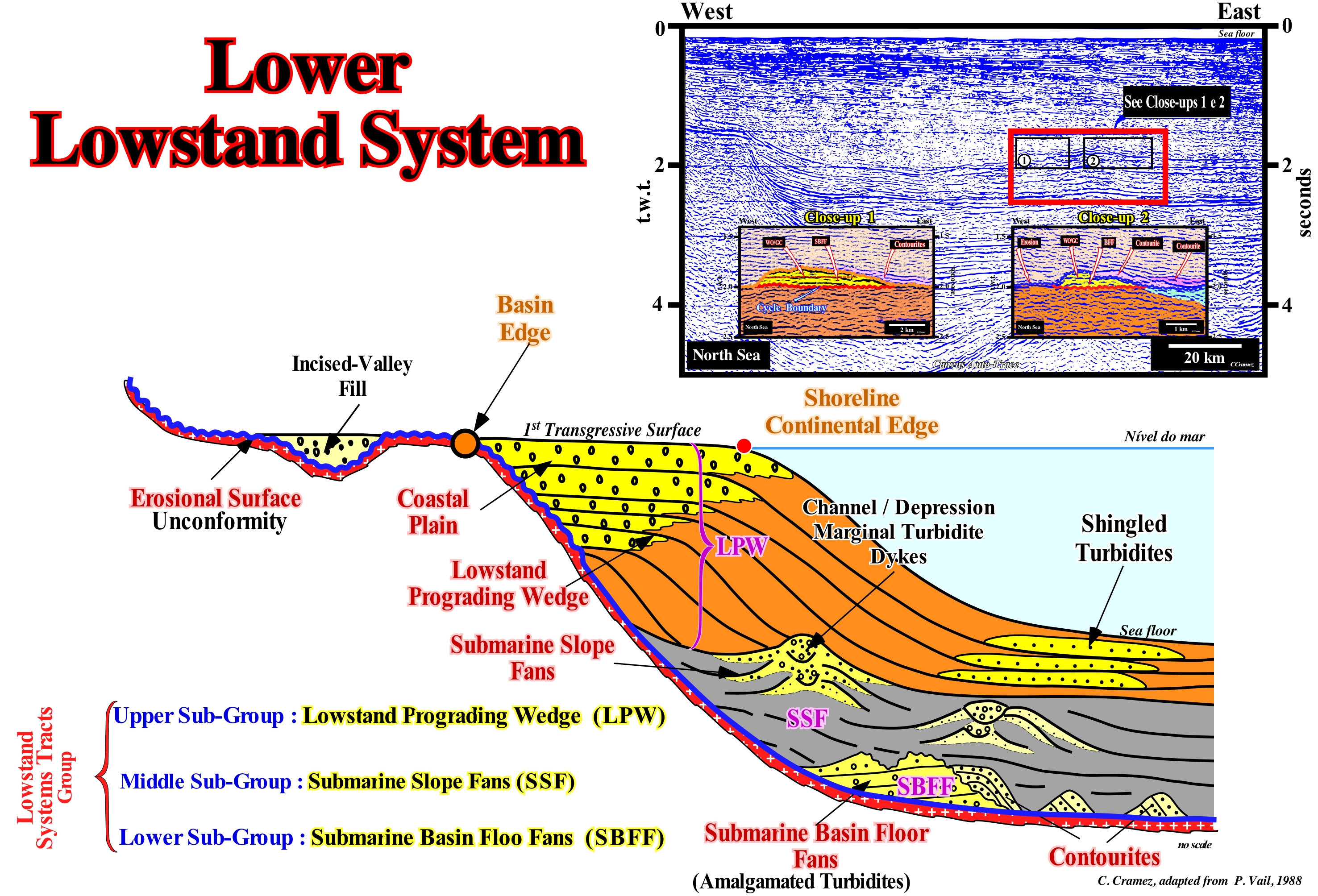 The lowstand systems tracts group (LSTG), which makes the lower part of sequence-cycle, is formed by three sub-groups. From bottom to top, they are: (i) Submarine Basin Floor Fans (SBFF), characterized by having an aggradational geometry and abrupt boundaries, with which contourites* can often be associated, as illustrated in this sketch ; (ii) Submarine Slope Fans (SSF), which have a wavy geometry ("gull-wings" structures of P. Vail), characterized by opposing downlaps, which is, often, well visible when natural marginal dykes turbidites (levees) are well developed and (iii) Lowstand Prograding Wedges (LPW), which consists of a set of sedimentary systems tracts with a prograding geometry and onlaps and toplaps (or truncation) at the top. Submarine basin floor fans (SBFF) deposit during significant falls of the relative sea level. They belong to the only sedimentary systems tracts sub-group that settle without increasing accommodation, i.e., without increasing the available space for the sediments (relative sea level** rise). Submarine slope fans (SSF) are deposited when the relative sea level, after reaching the lowest point of the curve of relative sea level changes, begins to rise. Sedimentary systems tracts forming the lowstand prograding wedge (LPW) deposit when relative sea level rises (in acceleration) before reaching the inflection point of the relative sea level changes curve. Within a sequence-cycle, under lowstand geological conditions, the sedimentary basin has no shelf (continental platform). The sea level is lower than the basin edge, which is the last continental edge of the basin in the underlying sequence-cycle. During the deposition of the lowstand prograding wedge (LPW), the shoreline corresponds, more or less, to the continental edge, as illustrated above, but this edge is not the basin edge. The depositional systems that form the lowstand prograding wedge are shallow-water (coastal plain) and deep-water (prodelta clay or continental slope). Large delta buildings can be deposited under lowstand geological conditions (sea level lower than the basin edge), which means that the geological conditions (highstand or lowstand) have nothing to do with the depositional water-depth. The outer edge of the lowstand prograding wedge coincides, more or less, depositional coastal break of the depositional surface, which is not far from the continental edge, since the basin, at the level of the sequence-cycle, does not have a shelf. All lowstand systems are located downstream of the basin edge (the last continental edge of the preceding sequence-cycle), except the incised valley fills, which deposit during the terminal phase of the lowstand prograding wedge. The formation of an incised valley is contemporaneous with the formation of the lower unconformity of the sequence-cycle (its age is, roughly, the age of submarine basin floor fans). Since an accelerating (more important than the preceding) marine ingression floods the coastal plain of the lowstand prograding wedge and displaces landward the shoreline, it develops a ravinment surface in the pre-existing topography. The basin has shelf and the lowstand prograding edge becomes the new basin edge. During the stability period of relative sea level that follows the marine ingression, the coastline begins to move seaward as the transgressive interval (TI) start to deposit. In the close-ups of the Canvas auto-trace of the North Sea seismic line, shown in this figure, the submarine basin floor fans (SBFF) and the associated contourites, which are the result of the erosion of the submarine basin floor fans by contour currents, can be, easily, recognized.