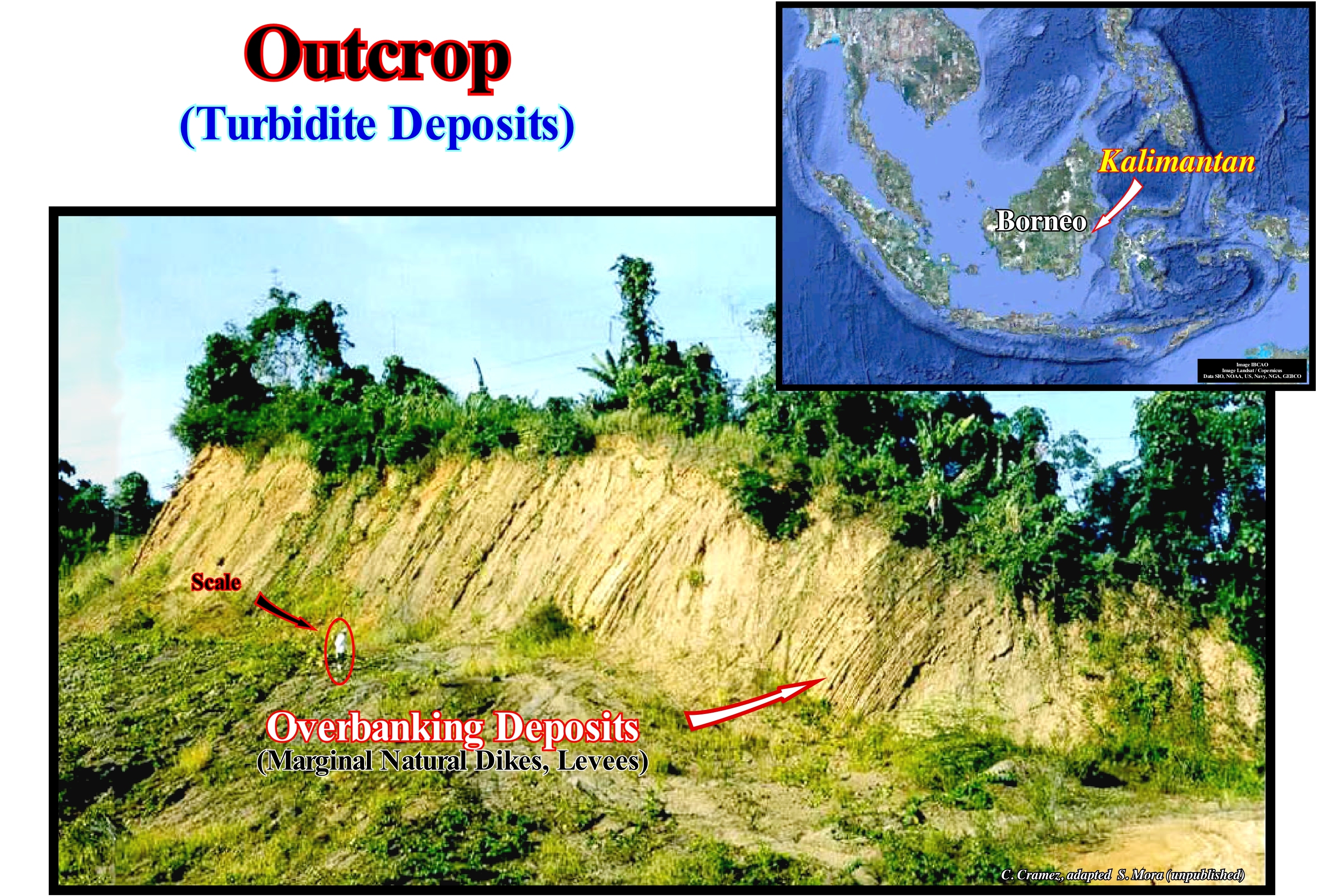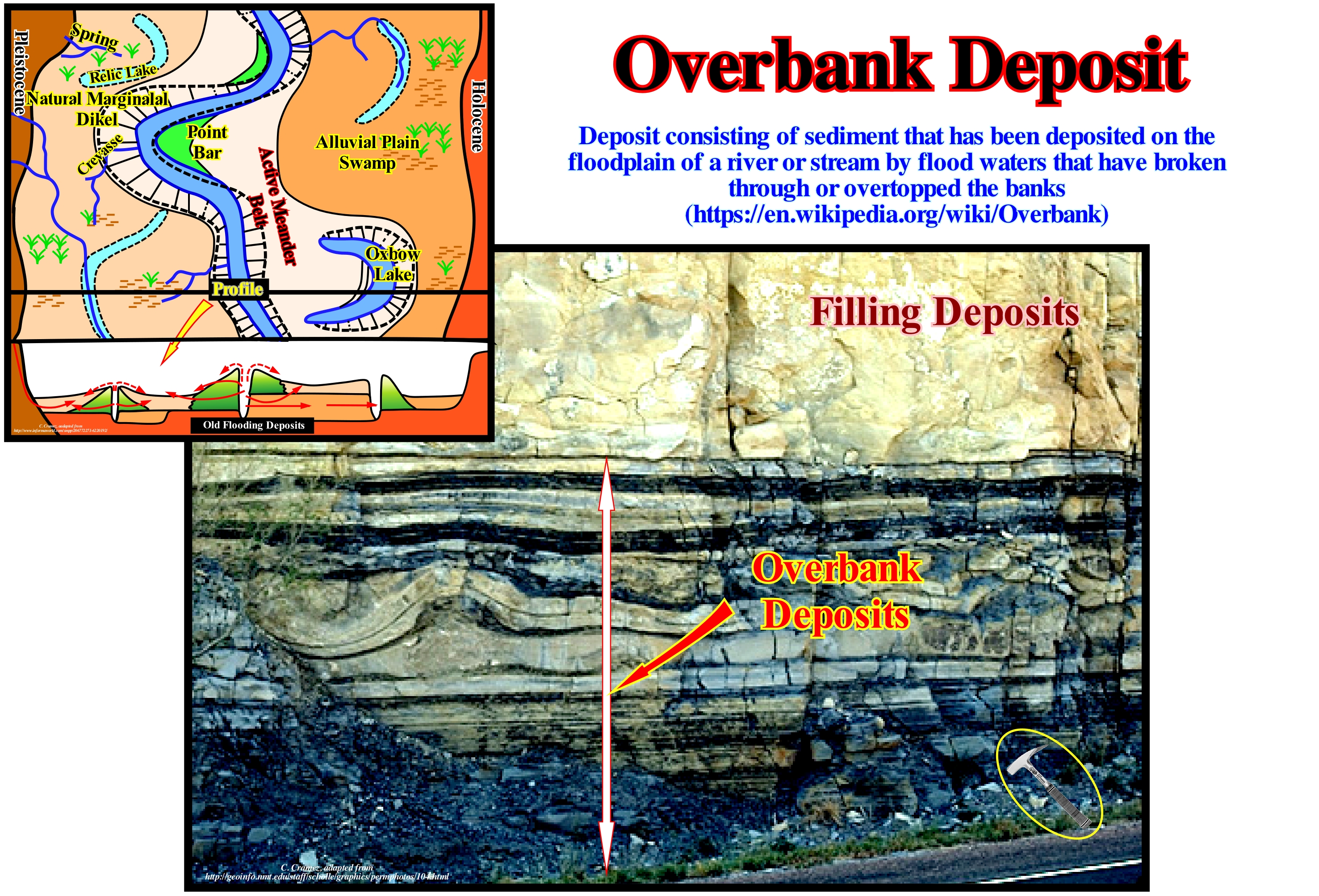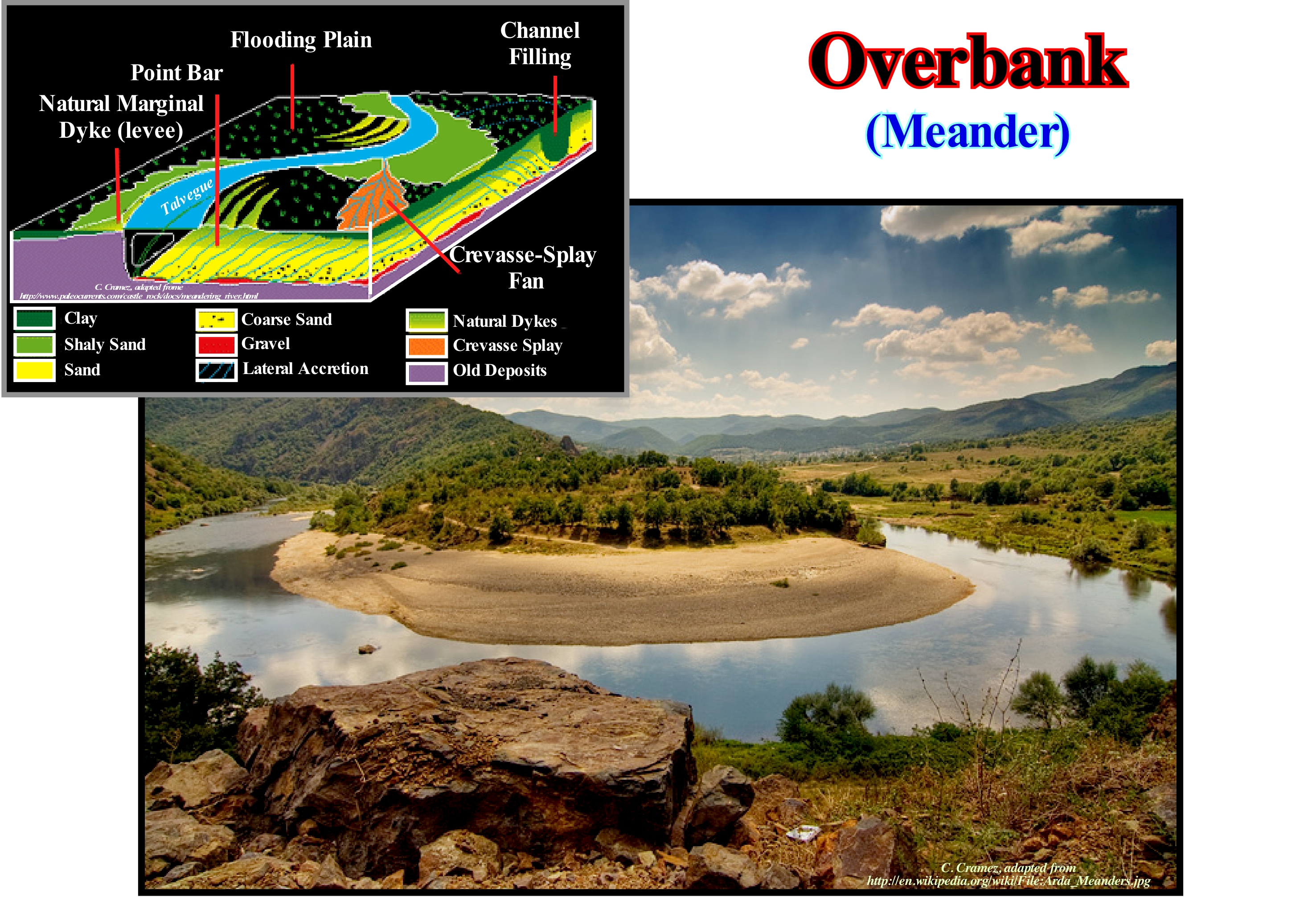 Overbanking deposits may occur either in turbidite depositional or in the coastal plain systems, in particular, in association with a meander belts. The turbiditic overbanking deposits and the filling of the depressions, through which turbidite currents have passed, are always associated with the submarine slope fans (SSF). Since a turbidite current encounters a major slope break in its path to the abyssal plain, it slows down, loses competence and begins by depositing two more or less parallel elongated lobes separated by an area in which nothing has been deposited. The area without deposition corresponds to the zone where the turbidite current passed with more speed and carried the other sediments further. Later, if a new turbidite current passes in the same place, it will probably be channelled through the area of nondeposition (lower energy law). If the current is sufficiently (thick) in relation to the depression between the deposited lobes, new overbank deposits are deposited on each side over existing ones, which exaggerates the relative negative morphology of the passage area. The greater the depression (if there is erosion it is minimal) between the overbanking deposits plus the future currents will be channelled. If for any reason the turbidity currents take another path, the depressions between the overbanking deposits will later be filled (in retrogradation), usually, by sandy sediments. On this photograph taken by Peter A. Scholle (1999), overbanking deposits visible in the lower part contrast with the filling of sand of a channelling depression. There is no obvious erosion between them. In overbanking deposits associated with a meandering belts the deposition mechanism is slightly the same. As illustrated in the geological sketch of this figure, precipitation water is concentrated in the riverbeds of the drainage basin after a surface and underground runoff. As the flow velocity of a stream depends on the slope of its bed the greater the slope, the greater the flow velocity. An important difference with turbiditic overbanking deposits is the presence of a bed where the fluvial stream flows. Here, fluvial overbanking deposits correspond to alluvial deposits formed by the sediments deposited in the floodplain of a river by the flood-waters that have passed through or passed over the natural marginal fluvial dikes (levees). As sediments, which are, largely, transported in suspension, have been displaced out of the main channel, away from the faster flow, they are, usually, fine-grained. The most frequently encountered facies in this environment are fine sand, silt and clay. The detailed sedimentological and lithological study of three subenvironments of overflow in the meandering valley valley of the Mississippi River* led to the following conclusions: 1) Marsh deposits, natural marginal dikes and rupture fans can be subdivided into units in association with development waist of meanders ; (2) The cycles of avulsion, the development of marginal dikes, the development and abandonment of rupture fans and flood blades are preserved in flood basin deposits ; 3) Flood basin facies progradate basinward as the natural levees accumulate, vertically, along the meandering belts. The development of a meandering belt is divided into four phases: A) Pre-avulsion phase ; B) Avulsion phase; C) Early meander belts and D) Late meander belt. In the studied area, the flood-basin sequence associated with avulsion and meandering belt development (30 meters) has a maximum thickness of about 10 m. The avulsion is, probably, recorded in the sedimentary sequence by a lithological change of blue clay, with organic debris deposited in stationary waters, to floods and sands associated with the development of dykes and ruptures during the incipient formation of the meandering belts. Surface dykes (silt sand) exhibit a coarsening upward stratification (2.5 m) reflecting the migration of the meander curve from the sampling site during the late stage of the meandering belt development. The surface deposits of the crevasse splay (silty sand), initially, coarsening upward, during the progradational phase are then thinning upwards when the crevasse splay fan is abandoned (3 m).