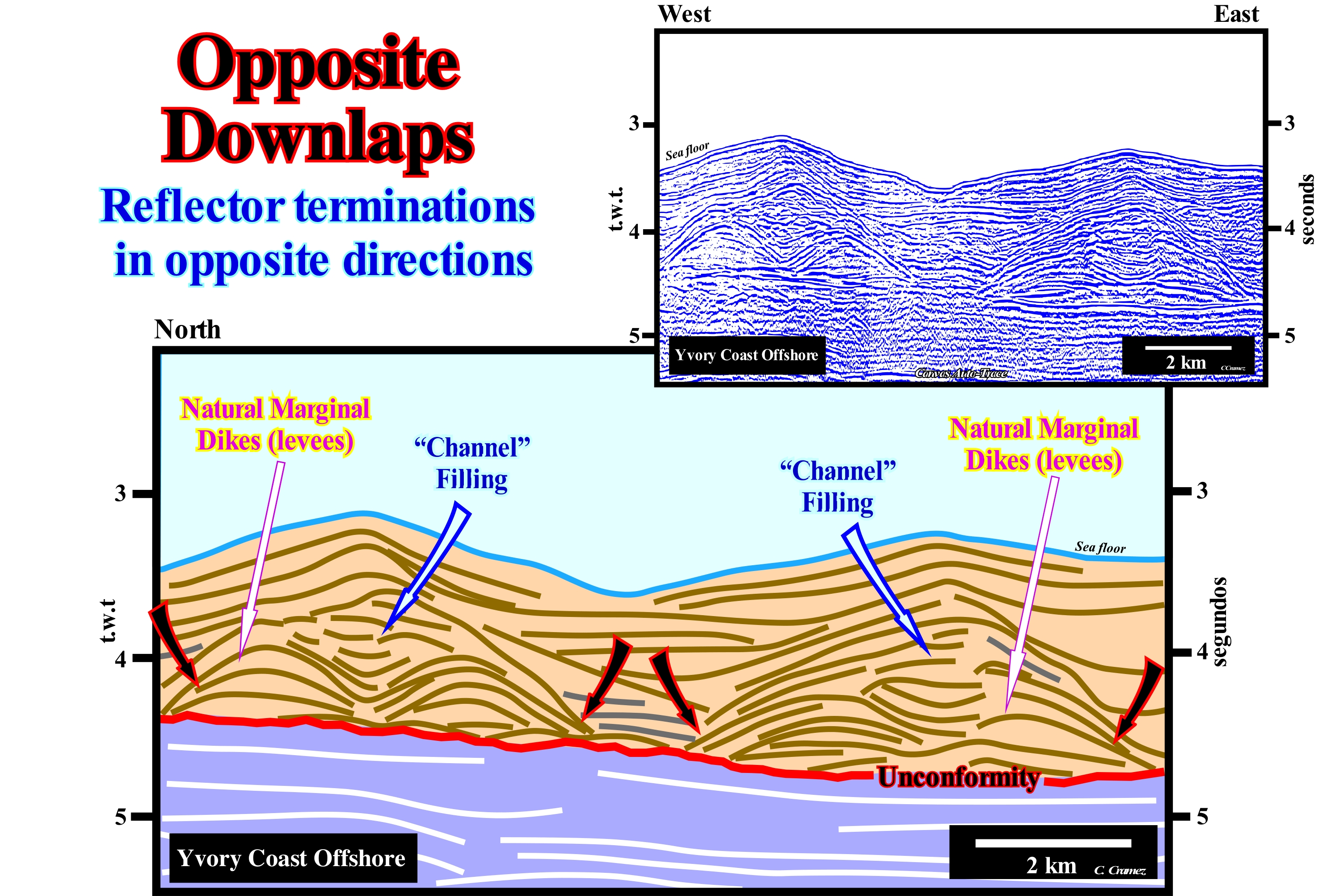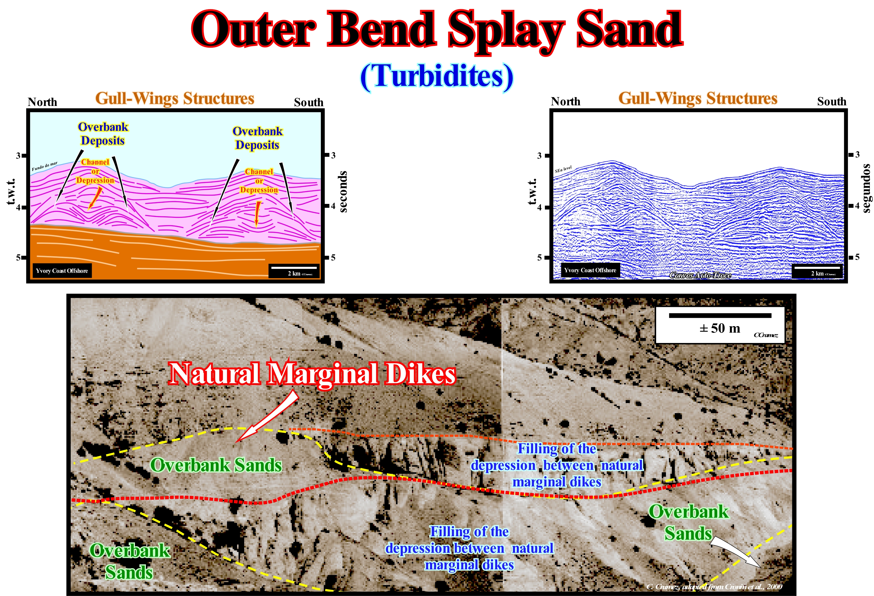 This photograph illustrates a detail of an Eocene turbidite depositional system in eastern Turkey. These deposits are part of the middle subgroup of the lowstand systems tracts group (LSTG). The lower subgroups corresponds to the submarine fans (SBFF and SSF), while the lowstand prograding wedge (LPW) forms the upper subgroup. The lowstand systems tracts group (LSTG) with the highstand systems tracts group (HSTG) form a complete sequence-cycle that was deposited during a 3rd order eustatic cycle, characterized by its time-duration between 0.5 M and 3-5 My. Within the eustatic cycle, the subgroup of the submarine slope fans (SSF) deposits when the relative sea level fall in deceleration (relative sea level curve changes decreasing with concave geometry) and, probably also, in the beginning of the rise in acceleration (bottom sector of the crescent curve). From the geometric relations of the terminations of the bedding planes, it is easily to recognize on this photograph: (i) The depressions fillings between turbidite natural marginal dikes, which sometimes, but not in this case, correspond to turbiditic channel fillings (when there is erosion) ; (ii) Turbidite natural marginal dikes and (iii) Other overbanking deposits. In the field, the spatial relationships between the different sedimentary bodies, which constitute the submarine slope fans (SSF) are easier to determine than on the seismic lines, due to the seismic resolution. However, even in the field (natural scale or scale 1:1), the differentiation between natural marginal dikes and other overbank deposits is, sometimes, subtle, since it is poorly defined and based, in most cases, just on the sand content. Of all overbank deposits, turbidite natural marginal dikes are those with higher sand content, which, however, is, often, lower than the sand content of filling depressions between the marginal dykes or turbiditic channels (although, in certain cases, they may be entirely filled with shaly sediments). In North Angola's deep offshore, most Tertiary reservoir-rocks in the oil fields correspond to the filling of depressions between turbidite natural marginal dikes. The turbidite channels of certain geoscientists, which most, often, correspond to the filling of the depressions created by the absence of deposition, between the turbiditic natural marginal dikes and not to the filling of channels produced by the erosive action of the turbidite currents, are always posterior to the overbank deposits. The vast majority of these fills are made in retrogradational (thickening continentward) when the relative sea level begins to rise. As illustrated on this tentative interpretation of Canvas auto-trace of a detail of an Ivory Coast offshore seismic line, the morphology of gull-wings structures and the formation of the natural marginal dikes of turbidite systems is very different from of the river's natural marginal dikes. A river stream, unlike a turbidite current (flow of a mixture of water and sediments that moves due to gravity, without significant influence of the medium in which it flows), needs a bed (i.e., it needs a depression on the ground in which it flows toward the coast, while a turbiditic current does not. The basal surface of natural fluvial marginal dikes is underlined by downlaps on either side of the bed which have an opposite vergence, It is always higher than the bed of the water-course. The turbidite natural marginal dikes, and in particular the first ones to be deposited, are at the same level of flow. As turbidite natural dykes settle down, as there is no deposition between them, the later turbidite currents are. generally, more or less channelled and will overflow if their height is greater than the height of the depression where they flow.
