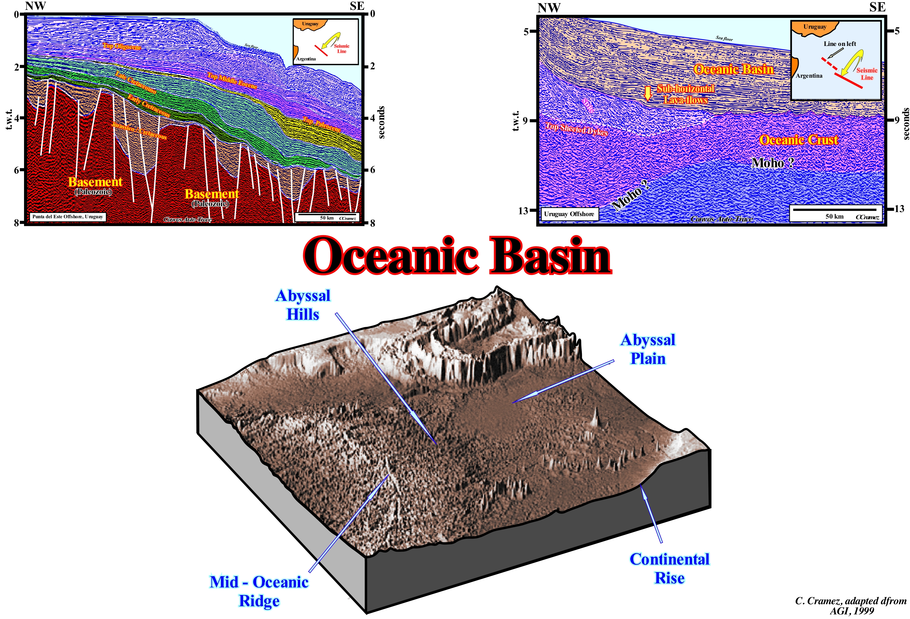 An ocean basin corresponds, more or less, to what certain oceanographers call the abyssal plain, which is located downstream of the continental slope foothills or more simply, downstream from the continental rise. Its substrate is, basically, formed by volcanic rocks deposited under a significant water-depth, although in some cases it may, also, be constituted by subaerial volcanic rocks. In fact, particularly, in the Atlantic-type divergent margins (as illustrated in this figure by tentative interpretation of Canvas auto-traces of the Uruguay offshore seismic lines), which today are considered by most geoscientists as volcanic margins, the. substrate is volcanic. It is formed by SDRs (Seaward-Dipping Reflectors) deposited, immediately, after the break-up of the Gondwana lithosphere, as well as expansion centres (sea floor spreading centres), the volcanoes and volcanic dykes not yet covered by water. Under these conditions volcanic material, when it reached the surface, by sheeted dykes* (each injection of a dyke, which intrudes on the older dykes, represents an increase of sea floor spreading), flows continentward (on each side of the expansion centre) in the form of lavas, which thin as they move away from expansion centres. The sedimentary interval that is deposited in the oceanic basins is, generally, not very thick, reason why the oceanic basins are not considered in the classification of the sedimentary basins of Bally and Snelson (1980). It consists,, basically of pelagic sediments (depositional water-depth more than 1000 m), deposited by decantation (slow sedimentary particles fall to the sea floor, which may take several decades). The morphology of (i) Abyssal Hills (a set of small, topographically well-defined oceanic elevations with a height of up to 1,000 m in height, with extensions between 100 and 100 km, occurring either in the middle of the abyssal plains, or along the continental ramps) ; (ii) Mid-oceanic ridge and (iii) Oceanic ridges associated with the former mid-oceanic ridges, which depends, basically, on the degree of maturation and the speed of oceanic spreading, is very important in sequential stratigraphy. It controls, particularly, the absolute (eustatic) sea level changes, i.e., it controls the eustatism or eustasy**. When the oceanic expansion is rapid, the morphology of the ocean floor is quite accentuated. The oceanic mountains are high, which diminishes the volume of the ocean basins. As the amount of water, in all its forms, is supposed to be constant, since the beginning of the Earth's formation (around 4.5 Ga), the absolute sea level rises. When ocean basin volume increases, due to the activity of the subduction zones, particularly, along the B-type subduction zones (crust zone, associated with negative gravity anomalies, where the convective currents of the Earth's mantle push lithosphere downward), or because the oceanic expansion velocity is slow (allowing cooling and increasing density of the newly formed oceanic crust, which causes a partial collapse of the ridges), the absolute sea level falls. First order (time-duration higher than 50 My) and 2nd order eustatic cycles (time-duration between 3-5 and 5 My), associated with these types of sea level changes, are responsible for the deposition of continental encroachment stratigraphic cycles and continental encroachment subcycles, which form all the divergent continental margins.