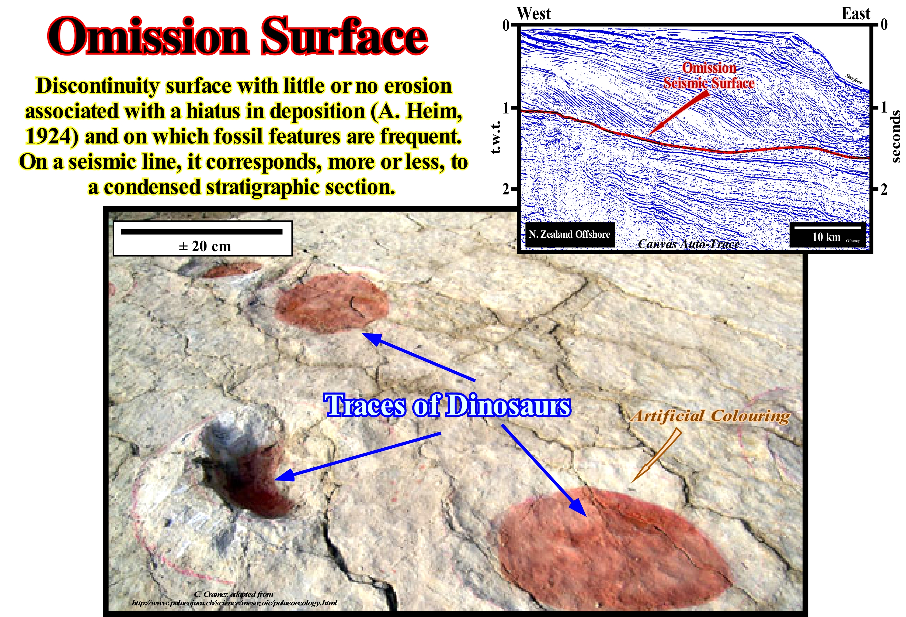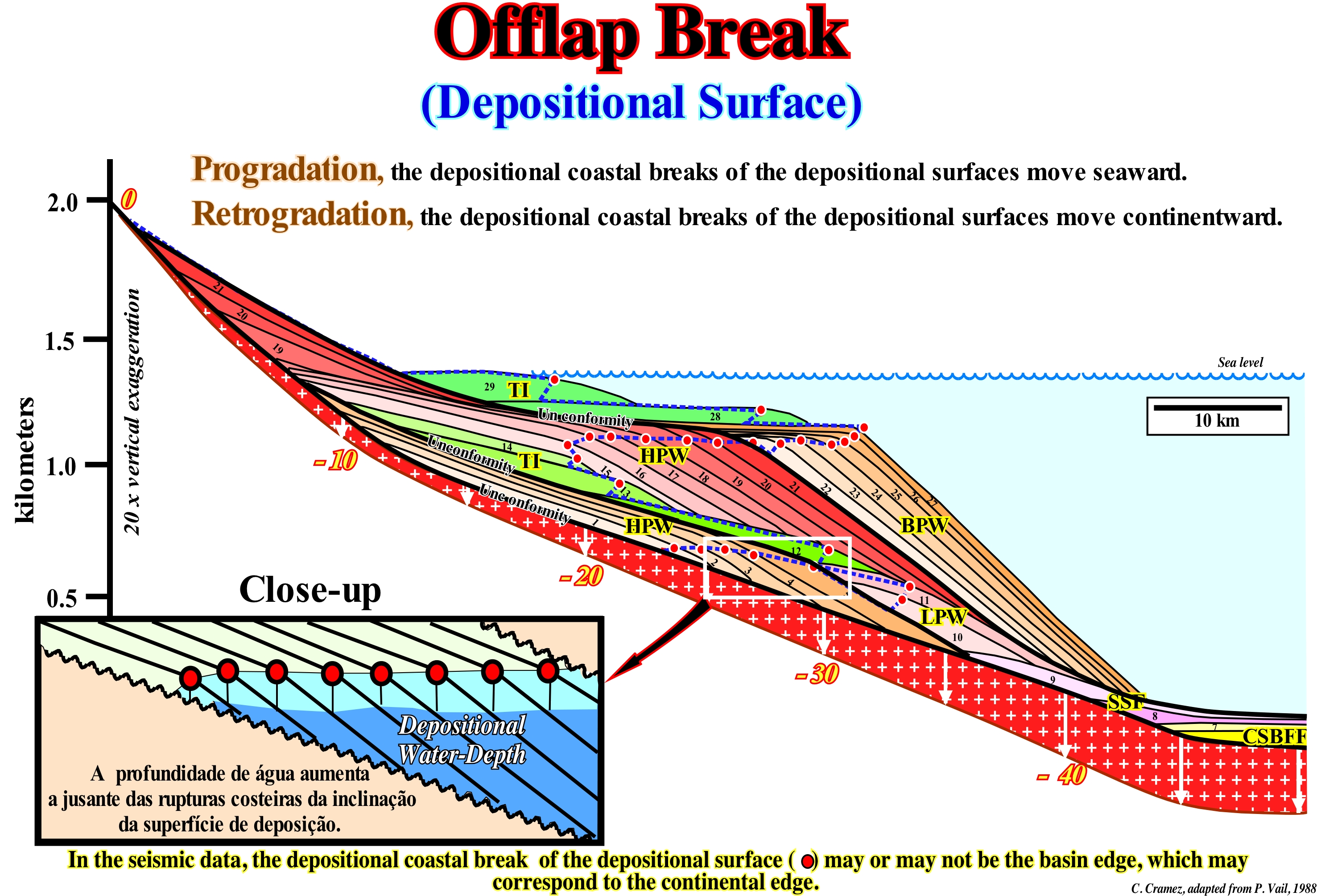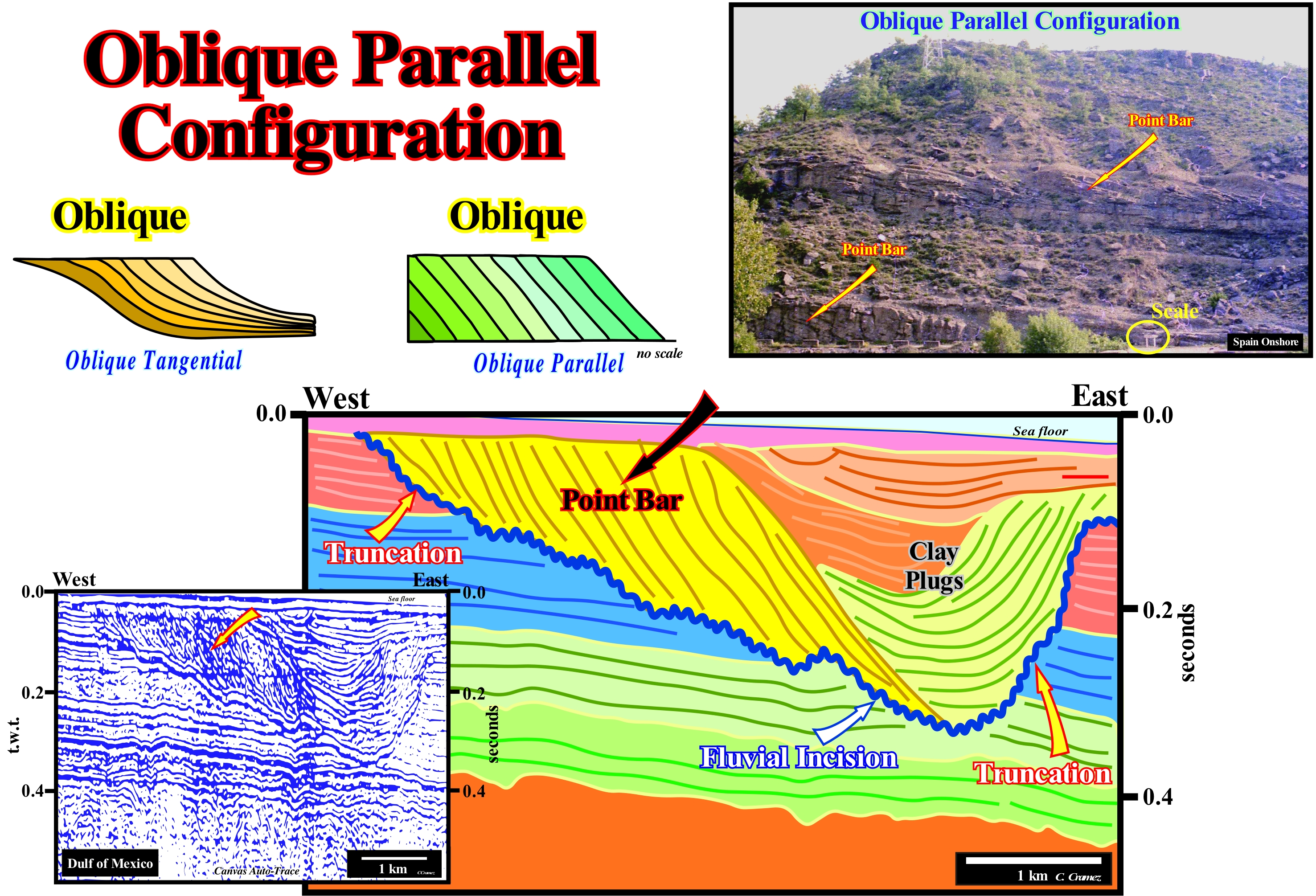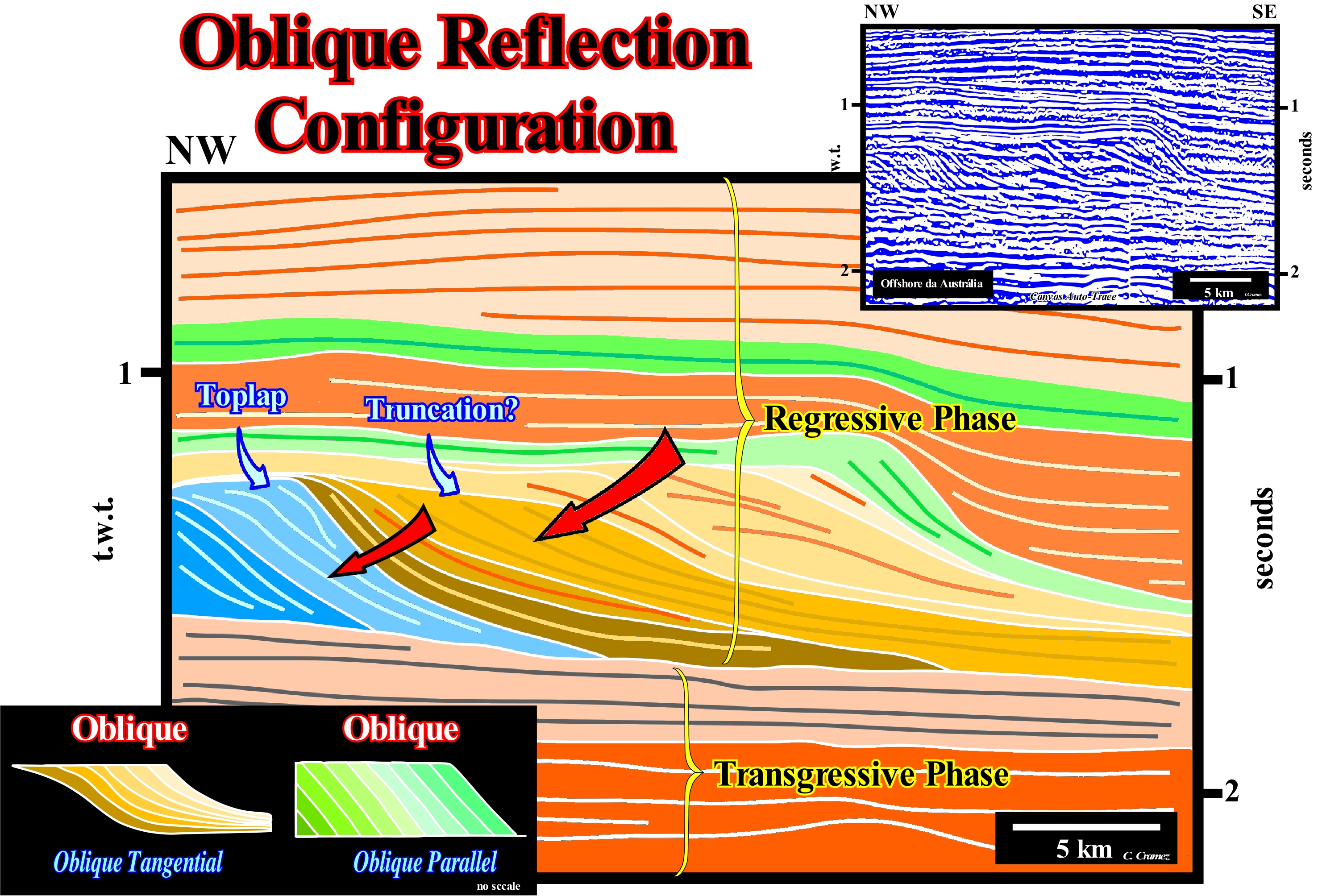 As suggested on this tentative geologically interpretation of a Canvas auto-trace of a detail of West of Australiaa offshore regional seismic line, the sedimentary intervals with an oblique internal configuration correspond to the continental slope progradations of the transgressive phase of the Atlantic-type margin divergent (post-Pangea continental encroachment cycle, induced by the second Phanerozoic 1st order eustatic cycle) covering the rift-type basins (not visible on this auto-étrace). Function of the scale, the slopes may be continental, as in this case, or deltaic when the height of the progradations does not exceed 50-60 m. Do not confuse a delta and delta building. A delta corresponds to a sedimentary systems tract, induced by eustatic paracycle, deposited during the stability period of relative sea level that occurs after marine ingression. A deltaic building is an progradation stacking of deltas, generally, from the same subgroup of sedimentary systems tracts, that may be associated with different sequence-cycles. There are false internal oblique configurations. If the upper part of a interval with an internal sigmoid configuration, i.e., with aggradation (vertical deposition or upbuilding) and progradation (lateral deposition or outbuilding) is eroded (more or less at the time of deposition), the upper reflection terminations are no longer toplaps (by non-deposition) and become toplaps by erosion, and the internal configuration becomes, apparently, oblique. When interpreting, in geological terms, an internal configuration, it has to be original (configuration at the deposition time) and not resulting from tectonics or erosion. In this tentative interpretation, if the progradational interval indicated by the large red arrow is interpreted as having an original oblique configuration (interpretation A) or a sigmoid configuration (interpretation B) in which the toplaps by non-deposition were eroded, these two interpretations imply different geological histories. In the first case, the interval was deposited during a period stabilization of the relative sea level (local sea level referenced to the base of the sediments or to the sea floor) and the terrigeneous influx was forced to deposit on the continental slope before, that in the following of another relative sea level rise, a new sequence-cycle (stratigraphic cycle induced by a 3rd order eustatic cycle, whose time-duration varies between 0.5 and 3-5 My), would be deposited on top of it. In the second case, the geological history can be summarized as follows: (i) In association with several marine ingressions (eustatic paracycles), during the period of stability of relative sea level, that occurs after each marine ingressions, sequence-paracycles with an internal sigmoid configuration (upbuilding and outbuilding) ; (ii) Subsequently, a significant relative sea level fall shifted seaward and downward the shoreline and coastal onlaps exhuming the platform (if any) and the coastal plain, which were, partially, eroded creating an erosional surface, that is to say, an unconformity ; (iii) Finally, a new marine ingression (significant relative sea level rise) flooded the coastal plain, which allowed the deposit of a new stratigraphic cycle, probably a sequence-cycle (note that the lower subgroups of the lowstand systems tracts group, i.e., the submarine basin floor fans (SBFF) and submarine slope fans (SSF), are deposited during relative sea level falls). The sketches (bottom left, of this figure) suggest that an oblique configuration (without significant aggradatio0n), can be: A) Tangential, when the downlaps are false (they become horizont and continue into the deep part of the basin as stratigraphic units that are, often, so thin that they are not visible on the seismic lines) and B) Parallel, when the downlaps are well marked and not thinned against the lower boundary. These two types of oblique configurations suggest that sandy facies are the base of the interval when they are tangential and at the top when the progradations are parallel oblique . This is particularly true at the delta slope scale (usually less than 60 meters in height) and it may be said that the proximal turbidites are associated with tangential oblique progradations, while the coastal strand lines are associated with parallel oblique progradtaions (e.g., Woodbine delta, East Texas Oil Field).