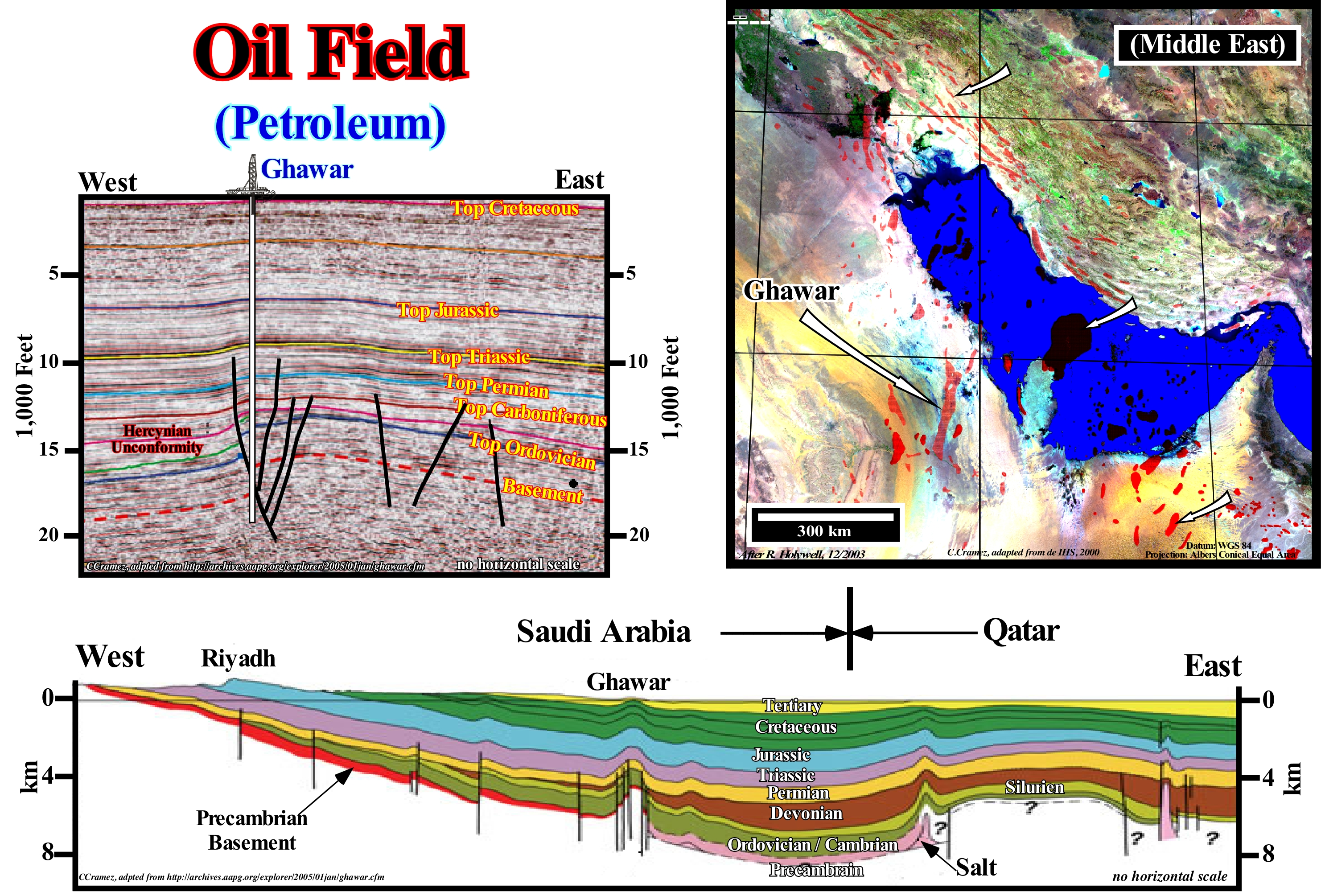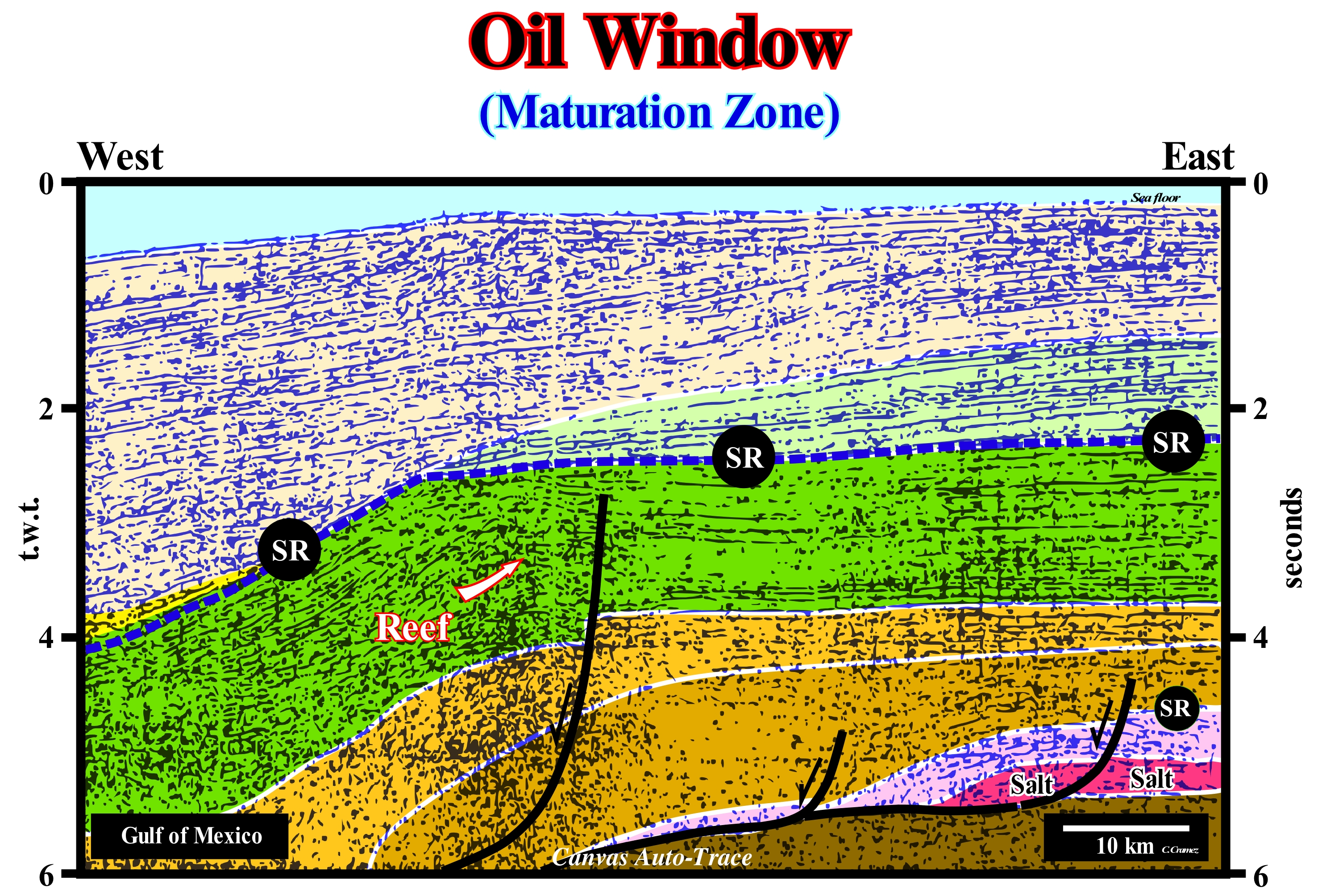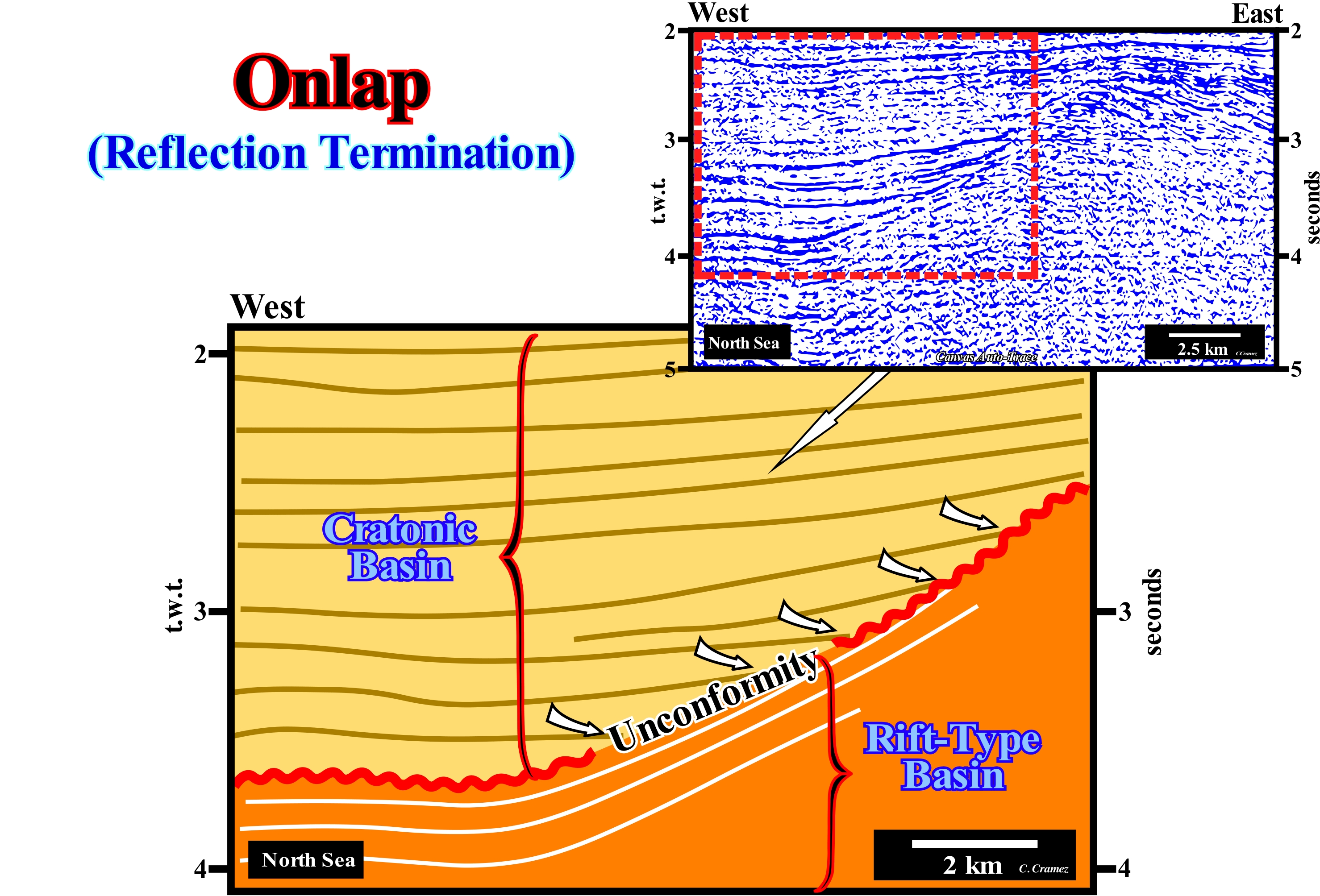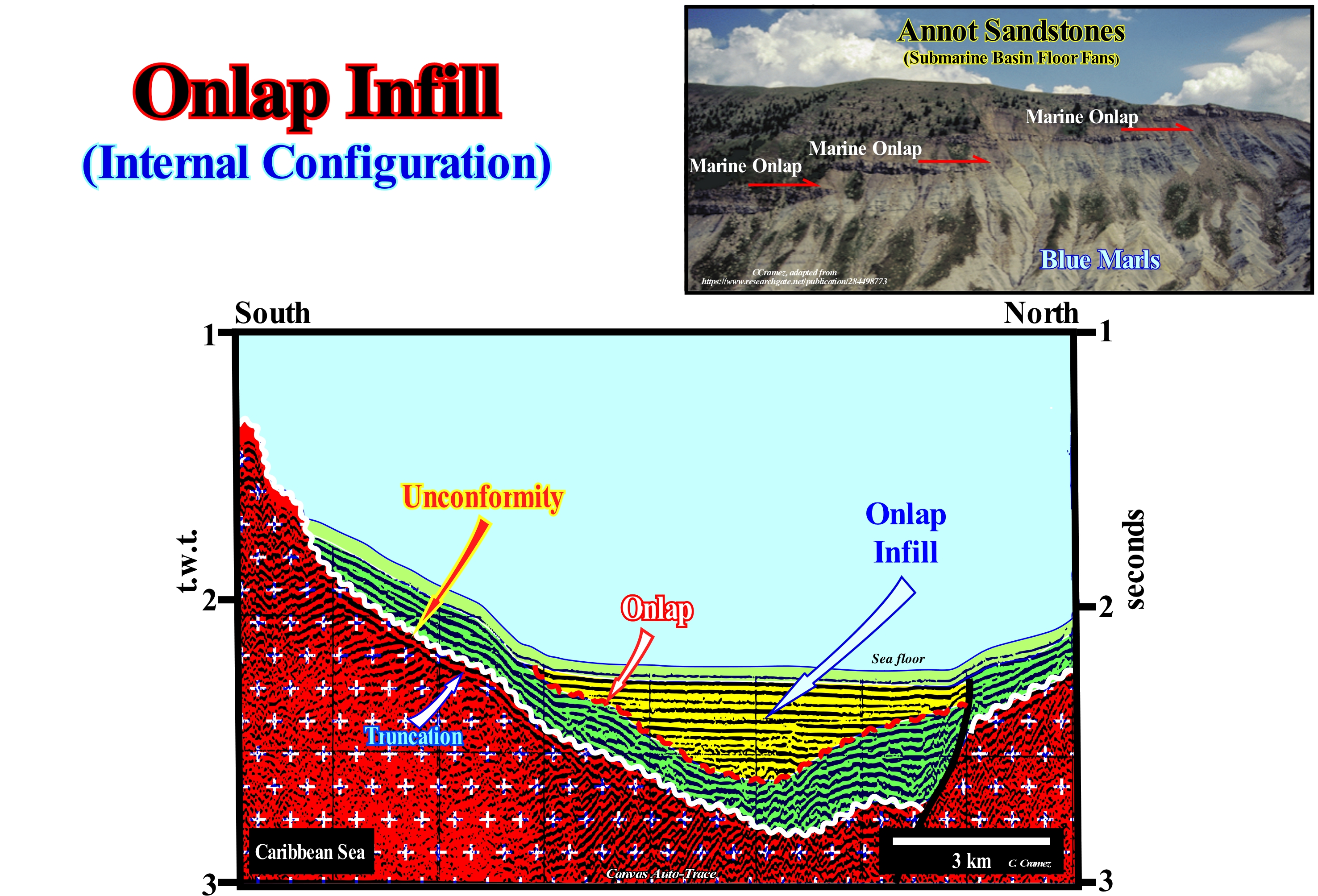 As suggested on this tentative geologically interpretation of a Canvas auto-trace of a detail of West of Australiaa offshore regional seismic line, the sedimentary intervals with an oblique internal configuration correspond to the continental slope progradations of the transgressive phase of the Atlantic-type margin divergent (post-Pangea continental encroachment cycle, induced by the second Phanerozoic 1st order eustatic cycle) covering the rift-type basins (not visible on this auto-étrace). Function of the scale, the slopes may be continental, as in this case, or deltaic when the height of the progradations does not exceed 50-60 m. Do not confuse a delta and delta building. A delta corresponds to a sedimentary systems tract, induced by eustatic paracycle, deposited during the stability period of relative sea level that occurs after marine ingression. A deltaic building is an progradation stacking of deltas, generally, from the same subgroup of sedimentary systems tracts, that may be associated with different sequence-cycles. There are false internal oblique configurations. If the upper part of a interval with an internal sigmoid configuration, i.e., with aggradation (vertical deposition or upbuilding) and progradation (lateral deposition or outbuilding) is eroded (more or less at the time of deposition), the upper reflection terminations are no longer toplaps (by non-deposition) and become toplaps by erosion, and the internal configuration becomes, apparently, oblique. When interpreting, in geological terms, an internal configuration, it has to be original (configuration at the deposition time) and not resulting from tectonics or erosion. In this tentative interpretation, if the progradational interval indicated by the large red arrow is interpreted as having an original oblique configuration (interpretation A) or a sigmoid configuration (interpretation B) in which the toplaps by non-deposition were eroded, these two interpretations imply different geological histories. In the first case, the interval was deposited during a period stabilization of the relative sea level (local sea level referenced to the base of the sediments or to the sea floor) and the terrigeneous influx was forced to deposit on the continental slope before, that in the following of another relative sea level rise, a new sequence-cycle (stratigraphic cycle induced by a 3rd order eustatic cycle, whose time-duration varies between 0.5 and 3-5 My), would be deposited on top of it. In the second case, the geological history can be summarized as follows: (i) In association with several marine ingressions (eustatic paracycles), during the period of stability of relative sea level, that occurs after each marine ingressions, sequence-paracycles with an internal sigmoid configuration (upbuilding and outbuilding) ; (ii) Subsequently, a significant relative sea level fall shifted seaward and downward the shoreline and coastal onlaps exhuming the platform (if any) and the coastal plain, which were, partially, eroded creating an erosional surface, that is to say, an unconformity ; (iii) Finally, a new marine ingression (significant relative sea level rise) flooded the coastal plain, which allowed the deposit of a new stratigraphic cycle, probably a sequence-cycle (note that the lower subgroups of the lowstand systems tracts group, i.e., the submarine basin floor fans (SBFF) and submarine slope fans (SSF), are deposited during relative sea level falls). The sketches (bottom left, of this figure) suggest that an oblique configuration (without significant aggradatio0n), can be: A) Tangential, when the downlaps are false (they become horizont and continue into the deep part of the basin as stratigraphic units that are, often, so thin that they are not visible on the seismic lines) and B) Parallel, when the downlaps are well marked and not thinned against the lower boundary. These two types of oblique configurations suggest that sandy facies are the base of the interval when they are tangential and at the top when the progradations are parallel oblique . This is particularly true at the delta slope scale (usually less than 60 meters in height) and it may be said that the proximal turbidites are associated with tangential oblique progradations, while the coastal strand lines are associated with parallel oblique progradtaions (e.g., Woodbine delta, East Texas Oil Field).