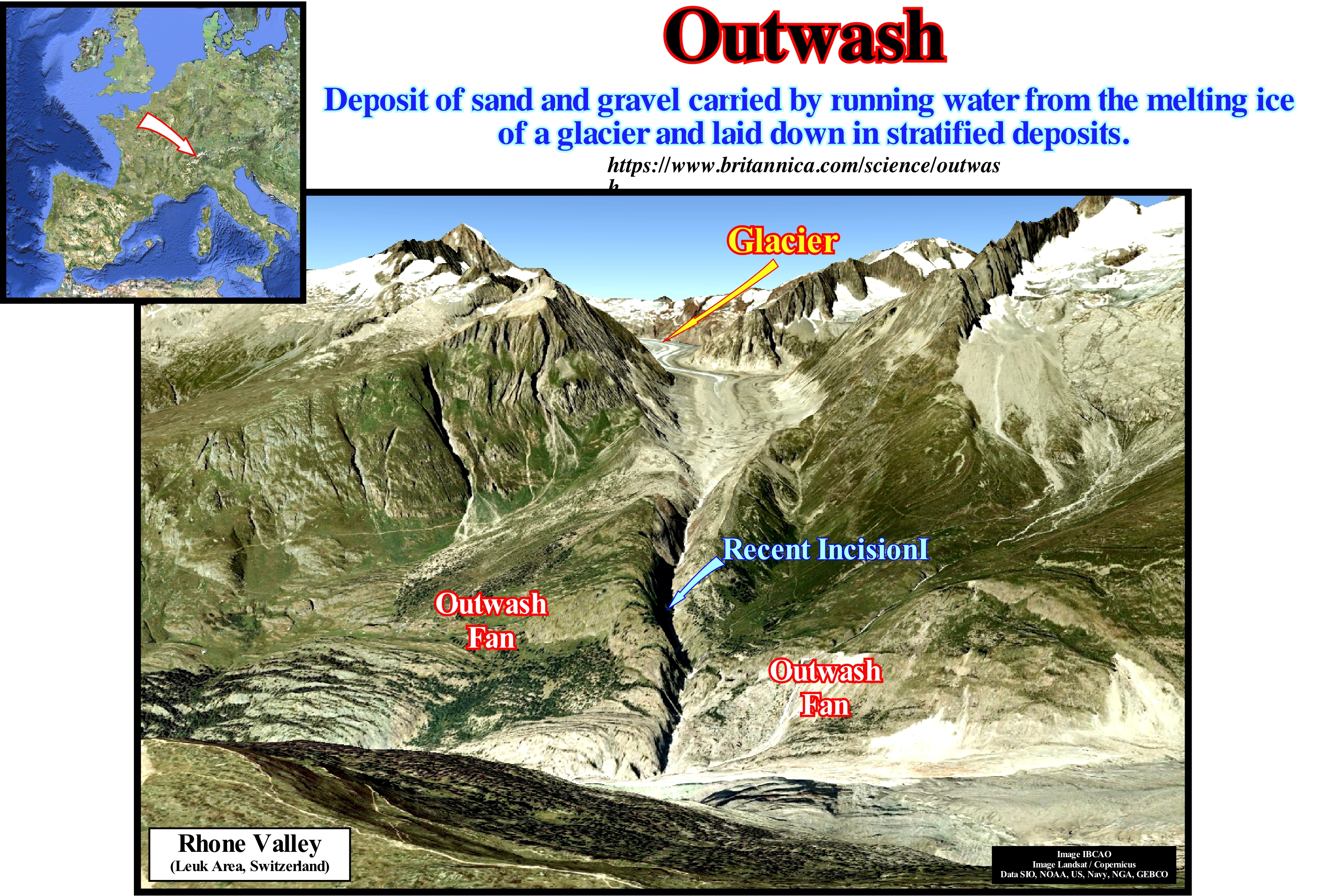 The outwash fans are the largest glacial deposits. They provide the largest amount of material to be carried by the wind. An outwash fan is characterized by: (i) Sediments deposited by the melting water of a glacier ; (ii) More or less, stratified beds of sand, gravel and finer particles, such as silt and clay ; (iii) Proglacial and glacial sedimentation (in contact with ice); (iv) Outwash plains ; (v) Eskers, i.e., long and narrow crest of sand and gravel, more or less, stratified, formed in tunnels under the glaciers (when in a retrogradational glacier, the materials it carries deposit in the tunnels at the base of the glacier where subglacier rivers flow) ; (vi) Kames, i.e., irregular low hills, isolated or not, formed of stratified sand or gravel, that are formed by sediments mobilized by braided rivers, that can be present in the surface of the glacier, and that deposit, in a depression on the surface of a glacier in the phase of retrogradation and lie on the ground after the complete melting of the glacier ; (vii) Drumlins, which are either small medial moraines deposited during a short period of glacial stagnation, during the retrogradational phase or the filling of a longitudinal incision of the glacier formed by a stream of water flowing to the surface of the glacier ; (viii) Deltas, etc. Adjacent to the glacier, the thickness of an outwash fan may be greater than 100 meters, while its length may reach more than 1,000 kilometers. A glacier is a stream of ice that flows downhill causing erosion and glacial sedimentation. When a glacier thickens, the front of the glacier progrades downhill. When a glacier thins the glacier front retrogrades. It is incorrect to say that a glacier retreats. A glacier does not have a reverse-gear like an automobile. It can only advance downhill by the gravity action, but it can, obviously, thin when ablation is higher than accumulation. Outwash fans induced by the melting of the Würm glaciation (between 1.6 Ma and 10,000 Ma) extend over 1,100 km. In the mountainous regions the outwash fans are elongated and the deposits are, more or less, planar, which many geoscientists call valley systems tracts. On the contrary, in the slightly rugged regions, outwash fans form wide plains, called outwash plains. The outwash fans can be excavated by erosional kettles or dissected by defrost currents. In outwash plains, where braided (or anastomosed) streams predominate, deposits with cross-bedding sedimentation and different grain-size (granulometry) are very common. In general, a more or less smooth slope allows the coarser material to deposit near the glacier and the finer material to be transported further downstream. Striated pebbles are relatively rare. The striae (slickensides) are worn during transport. On this picture, the outwash fan was deeply excavated by a consequent stream (a small stream of water, not permanent, which follows the ground slope, in this case, of the outwash fan) induced by the fusion of the small glacier visible slope above the outwash fans. The erosion induced by this small, nonpermanent water stream is, typically, fluvial. It is quite important when the dip of the current is high. It is largest in the upper part of the outwash fan. In the lower part, accumulation and sedimentation of the materials ripped and transported prevail. However, as this stream is a tributary of the Rhone River *, most of the accumulations associated with it were, largely, eroded by the main river. These nonpermanent small streams are very common on the Rhone banks. Its beds sometimes have important slopes, which in the period of snow melting, i.e., when the flow of the current is significant, give rise to the rapids and waterfalls that the local populations use for the electricity production.