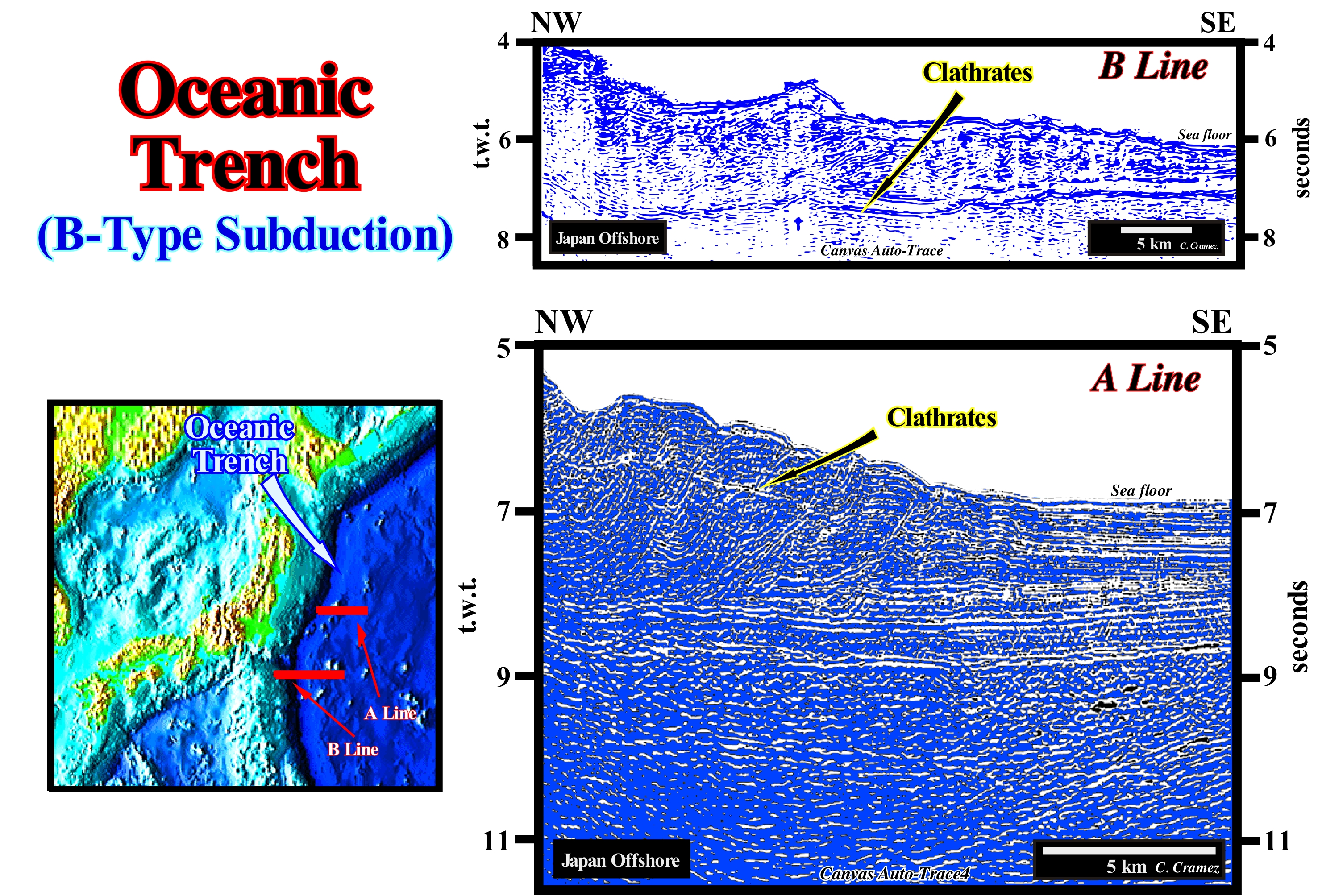 This oceanic or abyssal trench is, of course, associated with a B-type or Benioff subduction zone, in which the descending or plunging lithospheric plate is oceanic and the ascending or overriding plate is continental. It marks the beginning of the subduction zone that characterizes the East Japan offshore. In these details of Canvas auto-traces of two regional seismic lines that cross this region, one can see: (i) The great amplitude of the water-depth, which is between 5 and 7 second (double time, t.w.t.), that is more or less, 4-5 kilometers ; (ii) The probable absence of sediments rich in organic matter (absence of source-rocks) and (iii) The low sedimentary thickness. These elements are, largely, sufficient to consider this area, as indeed most of the oceanic trenches, with very weak oil potential. In such a geological context, the petroleum parameters: (a) Trap and (b) Rock-reservoir may be excellent, but they are simple geological curiosities, since the main parameters, i.e., the source-rocks and maturation parameters are always absent. In the oceanic trenches there may be good turbidite reservoir-rocks and magnificent structural traps, particularly, in the accretionary prism created by the compressive tectonic regime induced by the B-type subduction. It may be said that oceanic trenches have no oil potential. They have a total absence of source-rocks, that is to say, that even when sediments rich in organic matter are present, the organic matter remains immature, since it has not been buried sufficiently. The water-depth is, by definition quite important, often exceeding 5 seconds (double time). This point of view is not followed by a small number of geoscientists who think that certain oceanic trenches have significant potential in methane clathrate or gas hydrate* (mineral association between hydrocarbons and water). This conjecture is based on the presence of seismic reflectors of strong amplitude that mimic the sea floor. These reflectors interpreted in association with hydrates are visible on these seismic lines at about 6-8 seconds (t.w.t.) from the sea floor.
