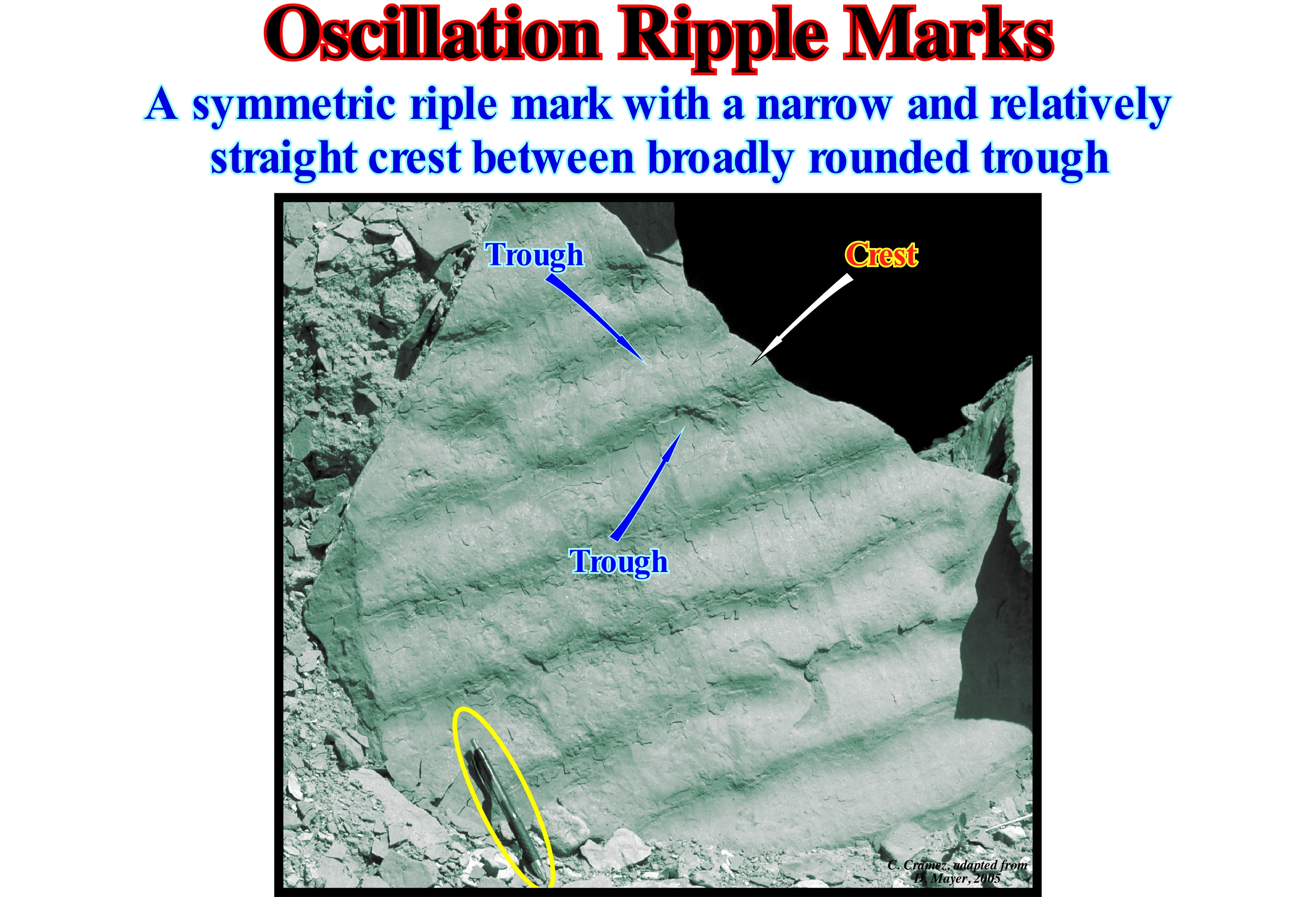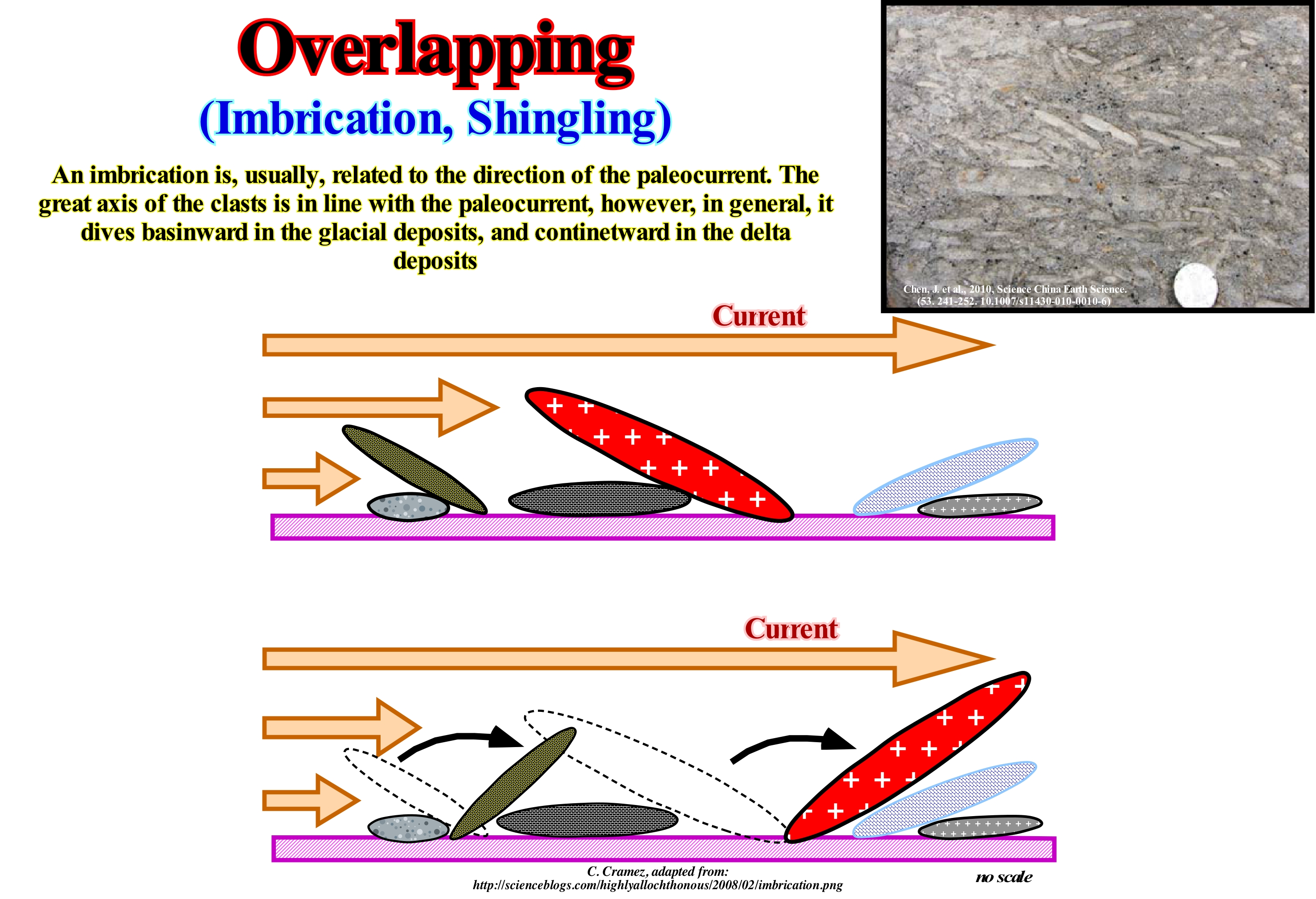 In sedimentology, as suggested in this figure, imbrication refers to a primary deposition pattern constituted by a preferential orientation of the clasts so that they overlap one another in a manner, more or less, consistently, somewhat like a series of overturned dominoes. This type of clast orientation allows geoscientists to determine the direction of the original chains. The imbrication of clasts is mainly observed in conglomerates and, in certain cases, vulcano-clastic deposits. It can also be observed in certain aeolian deposits. As in conglomerates the shape of many clasts is, approximately, that of an ellipsoid. Three main axes can be seen: (i) The main axis, also called the major axis or A axis ; (ii) Intermediate axis or B axis and (iii) Small axis or C axis. Many geoscientists consider two main types of imbrication: (A) Imbrication along A axis, in which the main (longer) axes of the clasts are oriented parallel to the direction of current flow ; (B) Imbrication according to the plane AB, in which the major axes of the clasts are oriented perpendicular to the direction of flow and (C) Imbrication supported in plane AB, with the intermediate axes of the clasts in the direction of flow of the current. The imbrication along A axis is characteristic of clasts transported in suspension and, therefore, it is just preserved in the case of a fast flow in which the clasts are deposited without any significant bearing. This pattern is typical of conglomerates of the basin floor fan (layer A), but is also, occasionally, observed in alluvial fan reworked by floods. The imbrication according to the AB plane is characteristic of entrainment clasts. This imbrication is formed, for example, when the clasts roll at the base of a channel. As shown in the diagram below, the flattened clasts roll over the downstream clasts and deposit against them with their downstream end resting against the lower clasp, which may be used to diagnose the original flow directions.