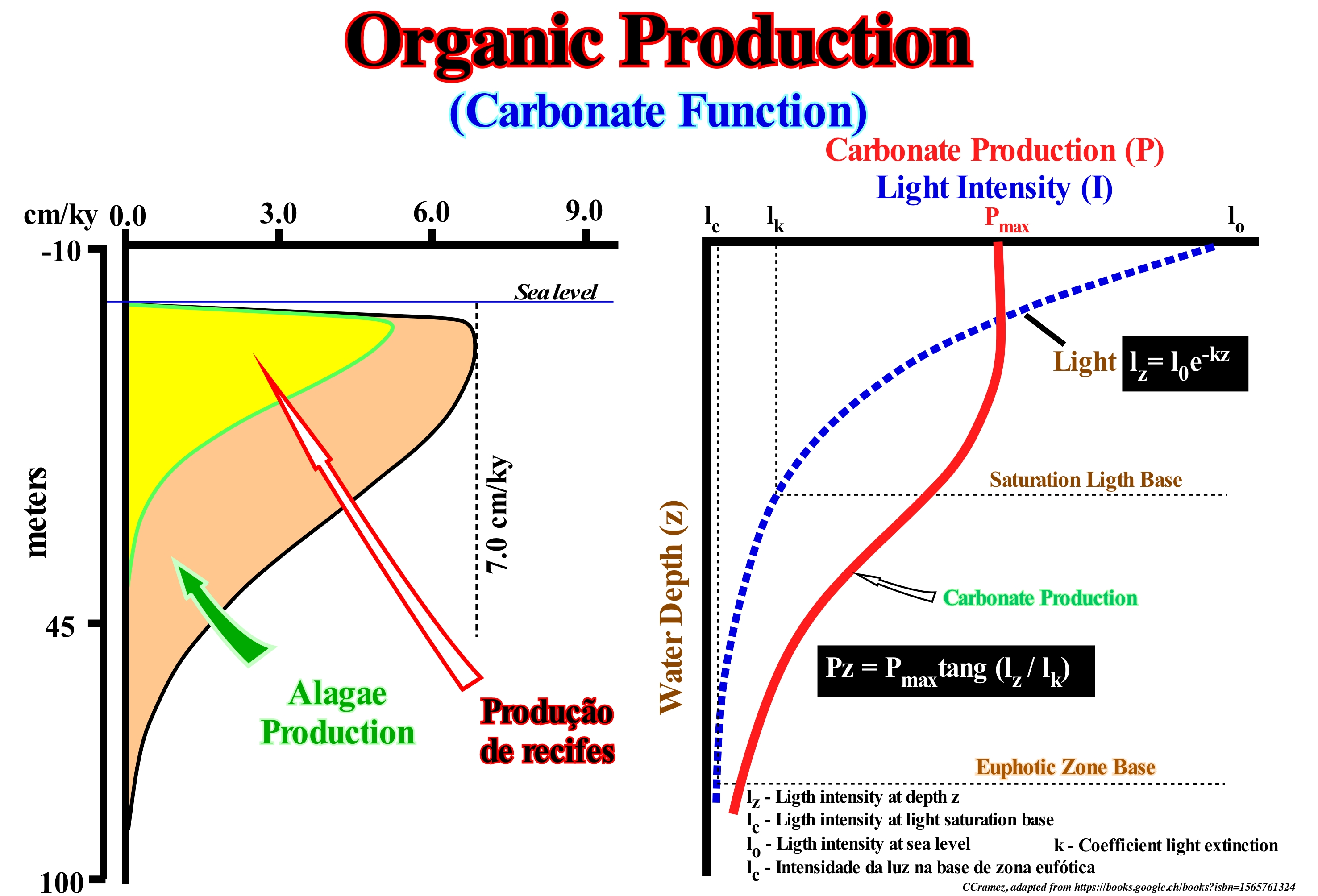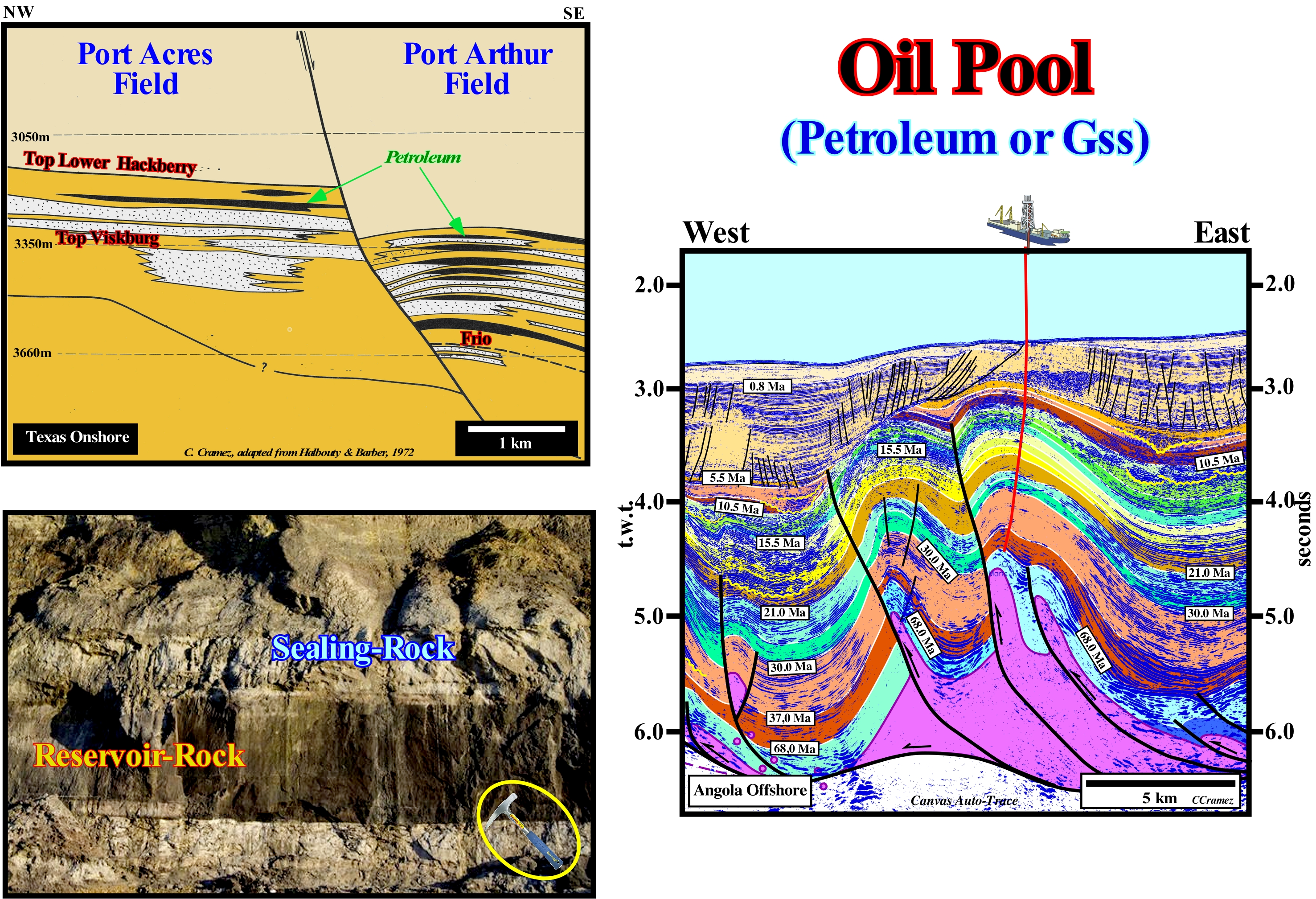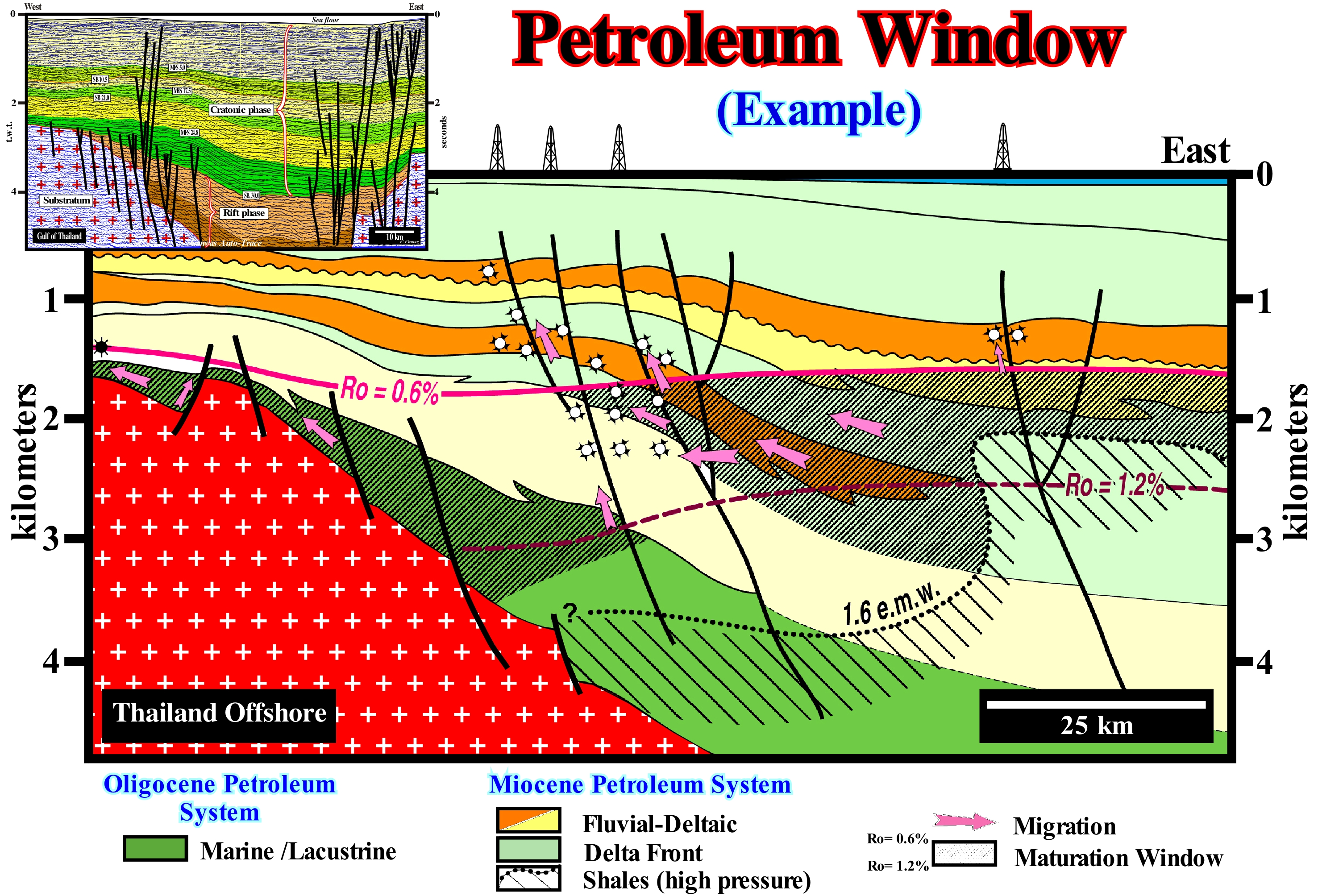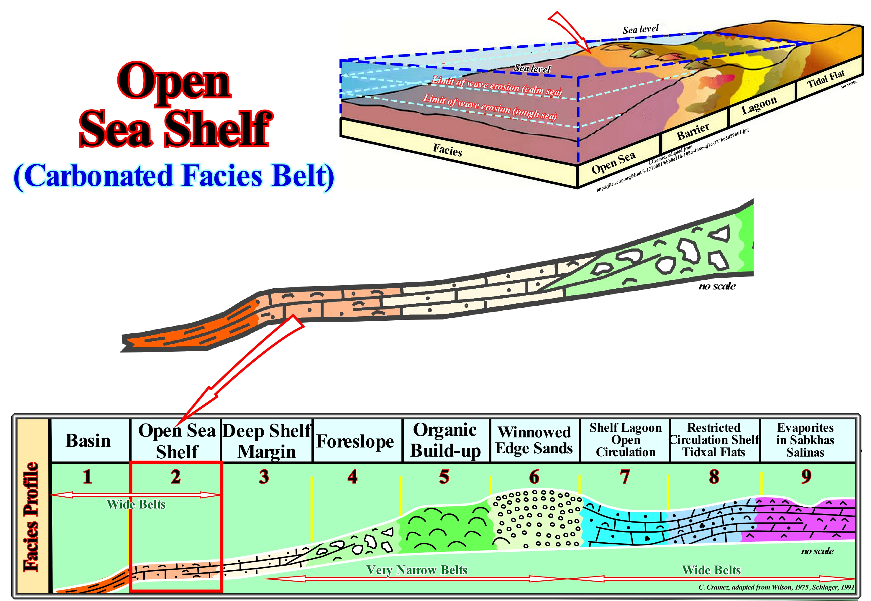On this block diagram are distinguished the neritic province (water-depth between 0 and 200 meters) and the oceanic province or blue sea. The first corresponds, more or less, to the continental shelf (between the shoreline and the basin edge, which may or may not coincide with the continental edge) and the surface zone of the blue sea, i.e., until 200 meters deep. In certain geological conditions (lowstand conditions), when the basin does not have a shelf (shoreline coinciding, practically, with the continental edge), the neritic zone corresponds just to the surface horizon of the blue sea. The neritic zone is, generally, divided into three subenvironments: (i) Outer Neritic Zone, characterized by a water-depth between 100 and 200 meters ; (ii) Middle Neritic Zone, with a water-depth between 20 and 100 meters and (iii) Inner Neritic Zone which is characterized by a water-depth between 0 and 30 meters. In the neritic zone, some geoscientists distinguish a transitional zone between 0 and 5 meters depth, which corresponds to the brackish-water domain (bays, lagoons, etc.) and the zone of nonmarine deposition (continental, fluvial, etc). The outer neritic zone is, in general, a sector of low sedimentation rate. The upper part belongs to the photic zone, but in the lower part, the penetration of sunlight is insufficient for life to develop from photosynthesis (life that uses solar energy to convert carbon dioxide, CO2 and water into food). The outer neritic zone, where sandstones alternate with shales, is an environment that is very conducive to the development of nonstructural traps for hydrocarbons, especially, in the transgressive interval (retrogradational geometry) o a sequence-cycle. The petrophysical characteristics (porosity and permeability) of clastic reservoir-rocks formed there are, generally, good. The relatively large thickness of the shaly horizons alternating with the reservoir-rocks increases the likelihood of vertical and lateral seal in the morphological traps and, above all, in the morphological traps by juxtaposition.