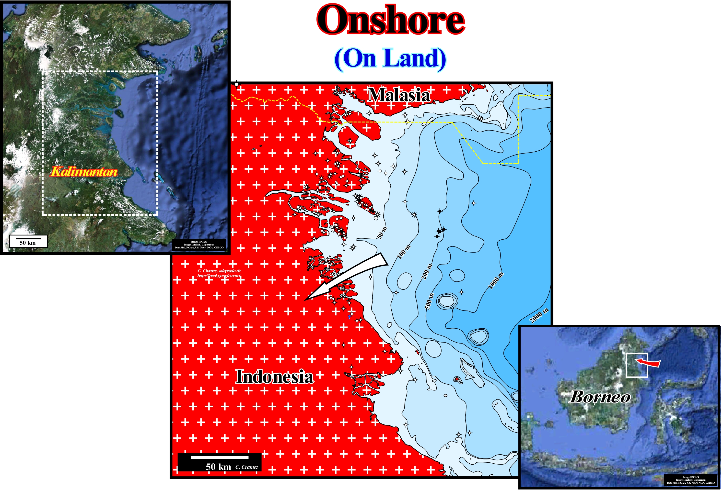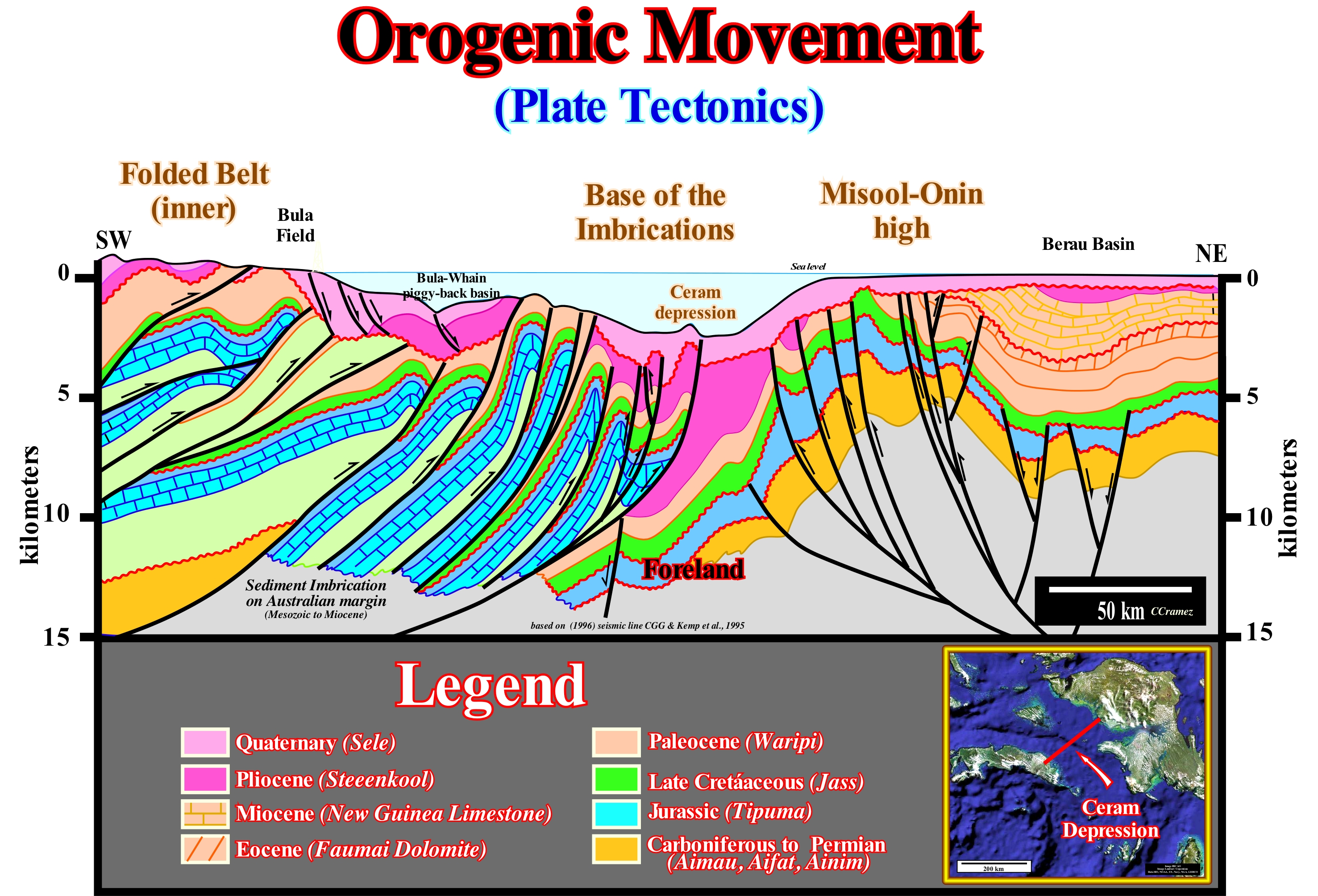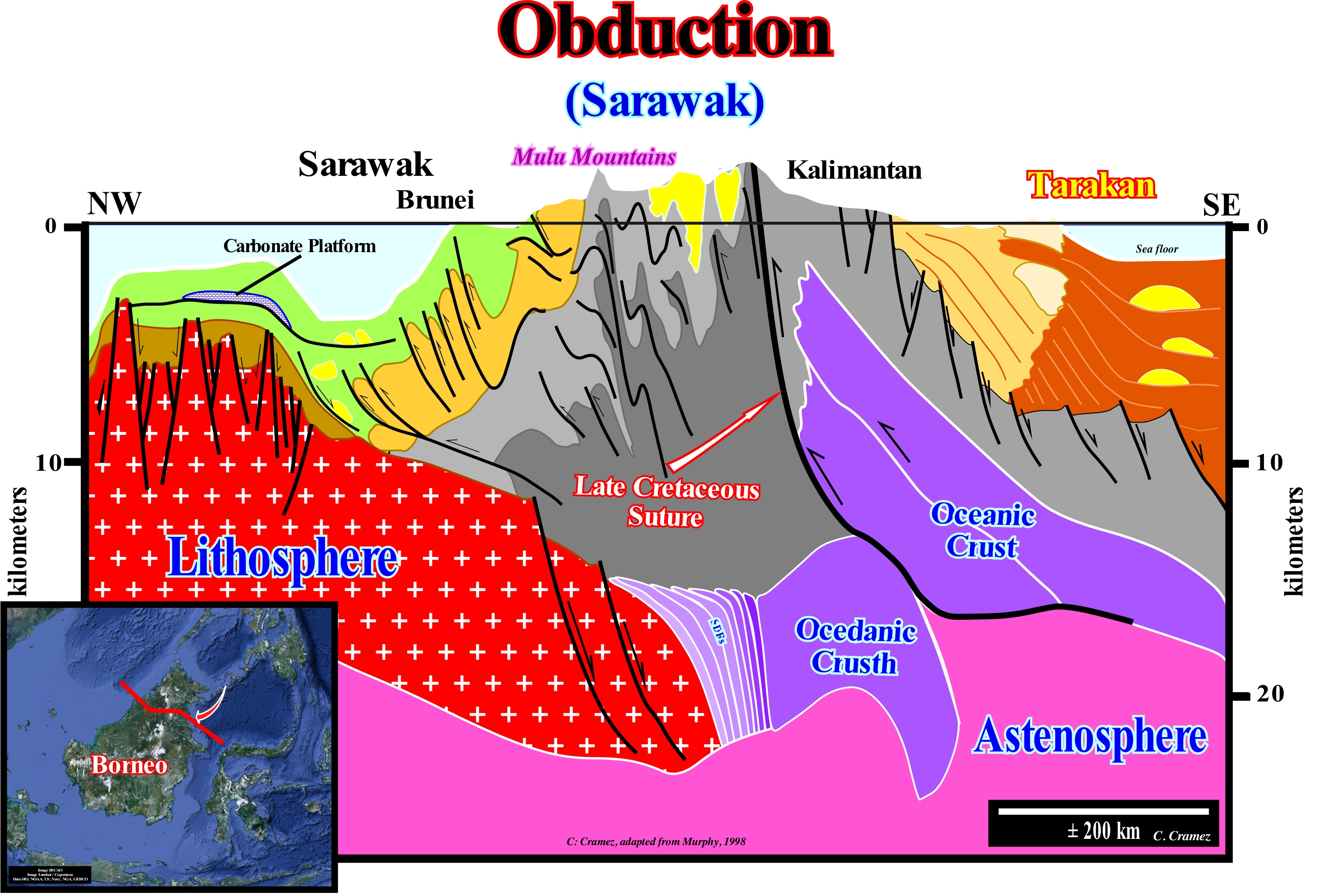 There are two types of subduction zones: (i) B-type or Benioff subduction zones in which a volcanic lithospheric plate sinks under a continental or volcanic lithospheric plate and (ii) A-type or Ampferer subduction zones, in which a continental lithospheric plate dives beneath a plate continental or volcanic lithospheric. The mechanism of these two subduction zones is not the same. In the former, it is a cold and dense lithospheric plate, which dips under a less dense plate, whereas in the second, i.e., in the A-type subduction zones, in general, the two plates (plunging and overriding) have, roughly, the same density. In B-type subduction zones, in the overriding plate (upper plate) a volcanic arc forms, whose distance, measured from the oceanic trench, is function, mainly, of the subduction angle. The greater the subduction angle, the closer the volcanic arc, on the overriding or ascending plate, will be from the oceanic trench. Often, as illustrated in this geological section through the north of the island of Borneo (Indonesia), due to the total subduction of the oceanic crust under the continental crust, the upper plate can enter into obduction, i.e., it can strongly ride the descending plate. In this example, the old continental lithospheric plate of Kalimantan and Tarakan (a non-Atlantic divergent margin, that is, developed in a, globally, compressional geological context within the Meso-Cenozoic megasuture) rode the old Brunei plate, which corresponds, also, to an old non-Atlantic divergent margin, that uplifted strongly. It may be said that an obduction occurs when a fragment of the continental crust is stopped and raised as a result of the thrusting of the mafic and ultramafic mantle material over the continental crust. Often, an obduction occurs where a small lithospheric plate is compressed between two larger plates. In this way, island and oceanic arches can be attached as new terrain to an adjacent continent.