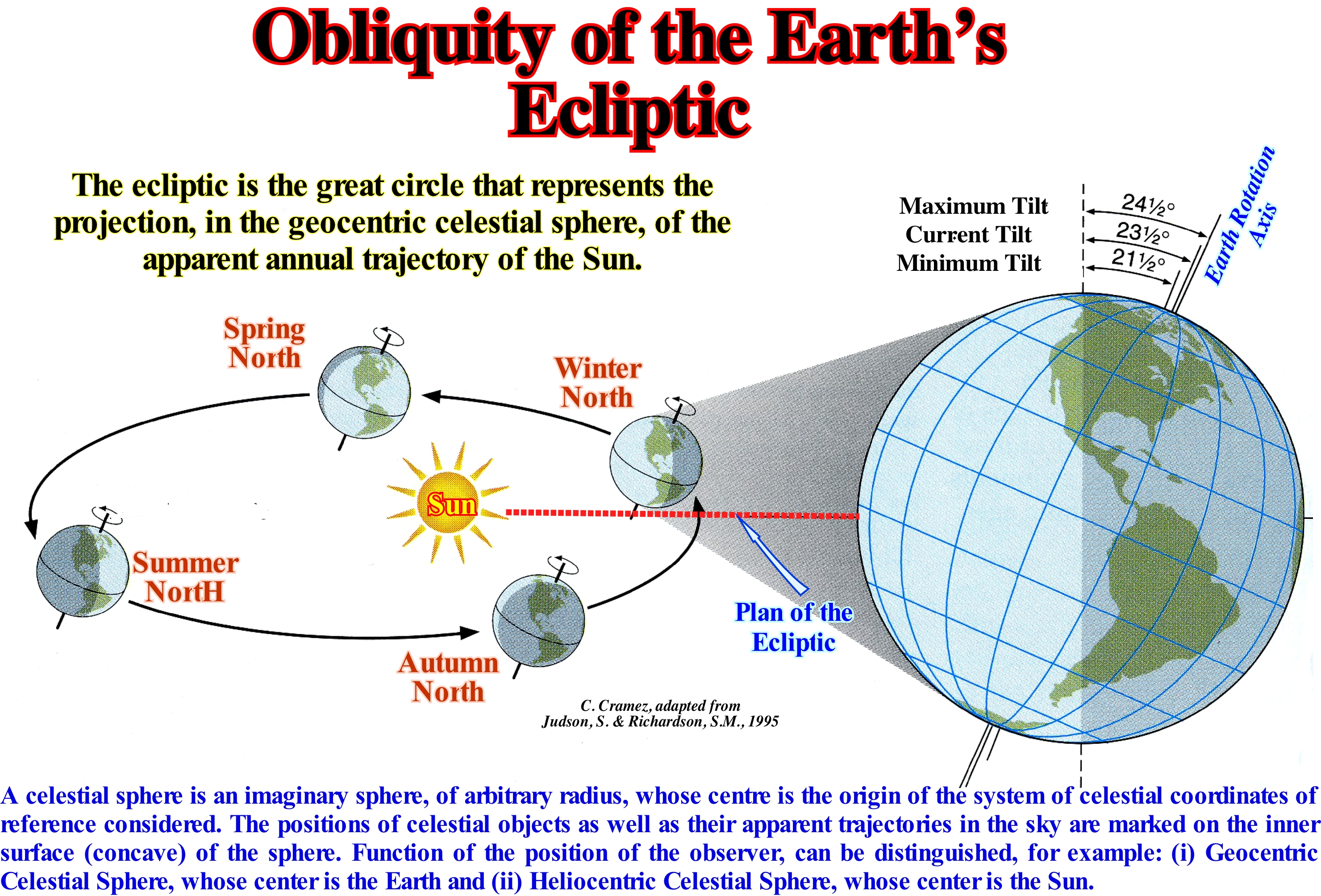 Probably, following a collision between Earth and an asteroid, the Earth rotation axis is not perpendicular to the plane of its orbit. The Earth equatorial plane is not parallel to the equatorial plane of its orbit around the Sun (ecliptic). The Earth equatorial plane makes an angle about 23° 26' with the plane of the ecliptic, which determines the obliquity of the ecliptic. The intersections of the Earth equatorial plane and the plane of the ecliptic with the celestial dome are the celestial and ecliptic equators. The line of interception of the two planes defines two points of intersection, diametrically opposite, which are the equinoxes. The obliquity of the ecliptic is the angle between the Earth rotation axis and the plane of the ecliptic, in which the Earth rotates around the Sun. The obliquity refers to the fact that the angle is oblique,i.e., it is not a right angle or multiple of it. At present time the obliquity is about 23.5° if the angle is measured between the Earth rotation axis and the perpendicular to the plane of the ecliptic. This inclination of the Earth rotation axis, with respect to the plane of the orbit varies with time, due to the gravitational influence of the Sun, Moon and other planets. The obliquity of the ecliptic, for a given year, can be, simply, calculated from the following formula: 23° 27' 8,26" - 0,4684 (t-1900) seconds, where "t" is the year for which the obliquity is desired. The obliquity varies from a maximum of 24.5° to a minimum of 21.5 °, all 41,000 years. The Earth rotations axis moves in a similar way as the axis of a whipping-top. The axis moves towards different points of the firmament during a cycle of 26,000 years. This cycle is reduced by a small oscillation of the plane of the Earth's orbit in the opposite direction. These movements together produce a lag or precession of the spring and autumn equinoxes in every 23,000 years. The hemisphere that is currently tilted towards the Sun receives, each day, more solar energy and sunlight, which reach the Earth's surface closer and more vertically, that is, the Earth receives more energy per surface unit.