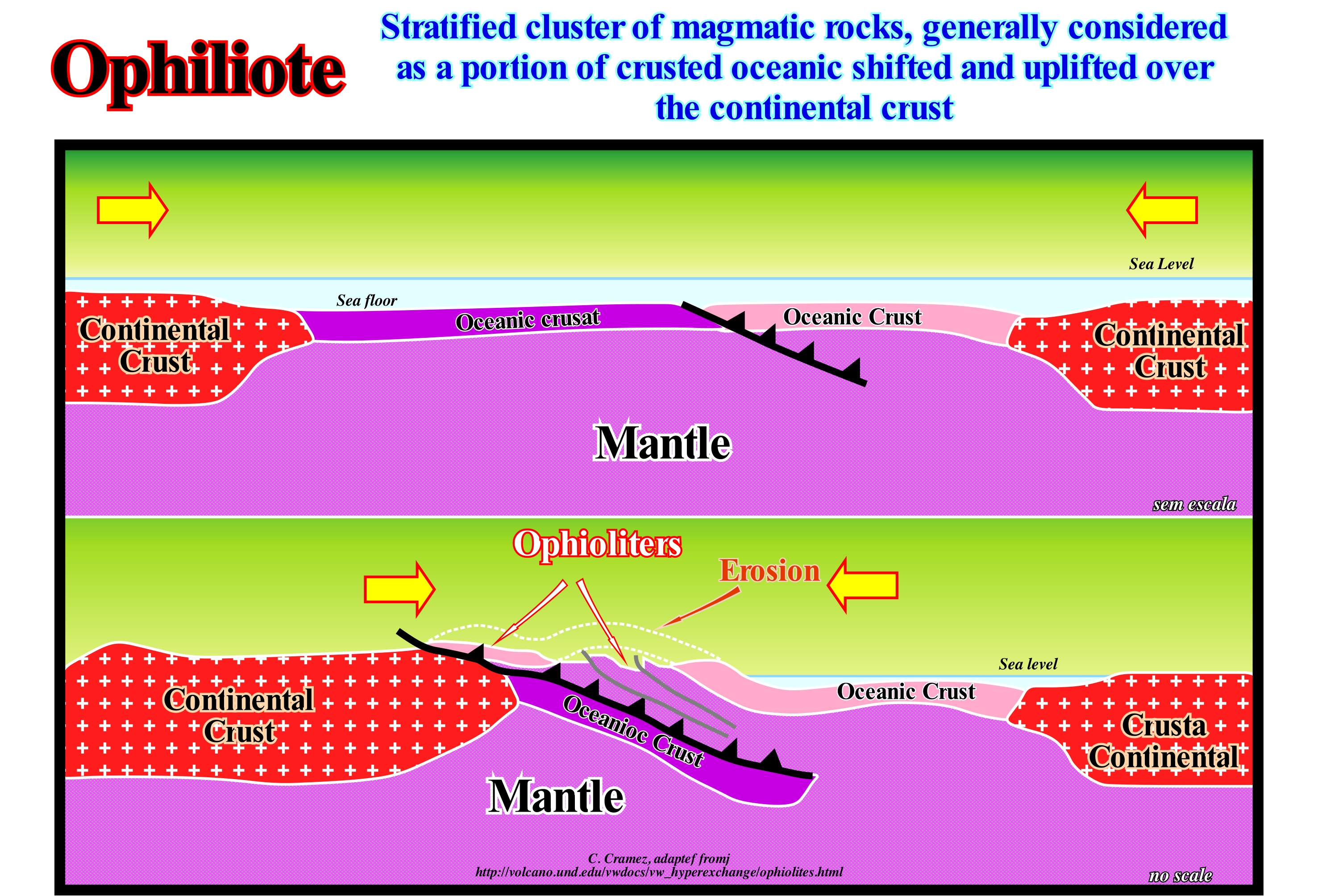 (*) The expression sheeted dykes is used to denote dykes covered by pillow lavas, whose formation can be summarized as follows: (i) During the stretching of the lithosphere of a supercontinent, in the thinnest part of the continental crust, magma is injected into the fractures that developed above the magma chamber ; (ii) The magma then cools and solidifies forming dikes between the magma chamber and the surface ; (iii) Continued stretching of the continental crust facilitates the injection of new dikes (cause or effect) among the oldest forming a volcanic sequence that from a given moment becomes predominant - it is the break-up of the supercontinent and the individualization of two new lithospheric plates ; (iv) If the breakup occurs in a continental or subaerial environment, when the magmatic material reaches the surface, it flows into the continent forming the so-called Seaward-Dipping Reflectors (SDRs) ; (v) As soon as the expansion centres are submerged, due to the weight of the successive volcanic flows, the dikes reach the sea floor and the volcanic material solidifies forming lavas with a more or less round shape that the geoscientists called pillow-lavas ; (vi) It is this association of dykes, more or less, vertical covered by pillow-lavas that geoscientists call sheeted dykes.