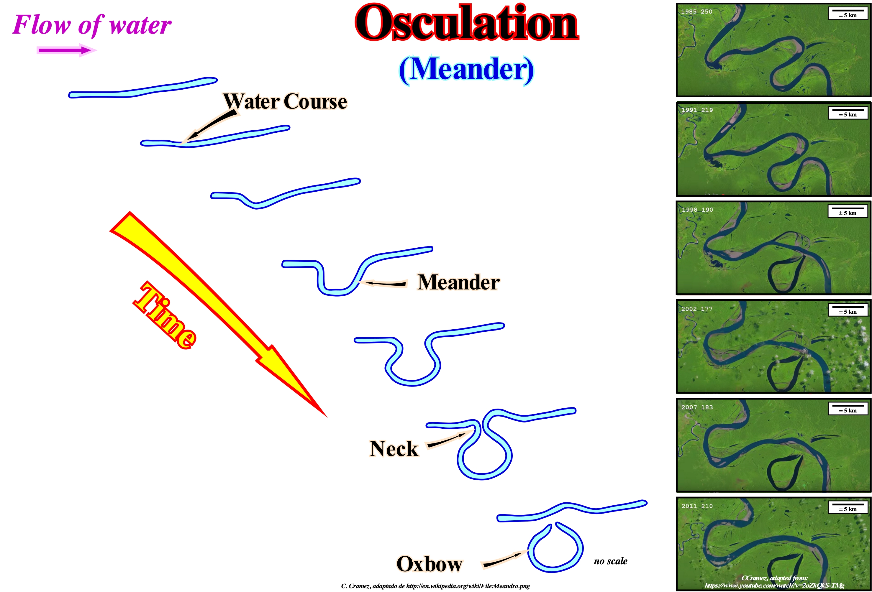 A meander, whether it is incised (or valley meander, that is, when the river and valley zigzag at the same time) or alluvial plain meander, is always inclined to accentuate. The main stream is diverted to the outer side of the meander, i.e., it approaches the concave edge (when viewed from the flow channel). In a series of meanders, the current approaches the right and left margin, describing curves larger than the axis of the apparent river bed and tends to exaggerate the curves, since where the speed is maximum where the erosion is stronger. The concave margin is more eroded than the convex margin, in which the current is much slower and thus leaves its load beginning to build a point bar, which accentuates the curvature. In one meander, there is erosion and deposition at the same time. Therefore, in terms of sequential stratigraphy one can not speak of unconformity (relative sea level fall). By this process the concave margin becomes abrupt, while in the convex margin, which is lower, the sediments deposit. By virtue of their accentuation, two neighbouring meanders can be cut out in two different ways: (i) Overbanking, that is, when during a flood the whole plain is flooded and the stream takes a shorter rectilinear path instead of (ii) Oscillation or contact, when the exaggeration of the curvature removes the peduncle (base of the meander), the old meander is transformed into a channel abandoned, in which sometimes a lake is formed like those illustrated in this photograph (Rio Madre de Dios, SE of Peru). This last process brings into contact two points of the course of the river, which were previously at a certain distance and at different levels. This can create a water fall that can be maintained for a certain time if the rock is relatively hard. At the same time as the meanders are exaggerated, they migrate downstream, which, over time, can transform incised meanders into false alluvial plain meanders.