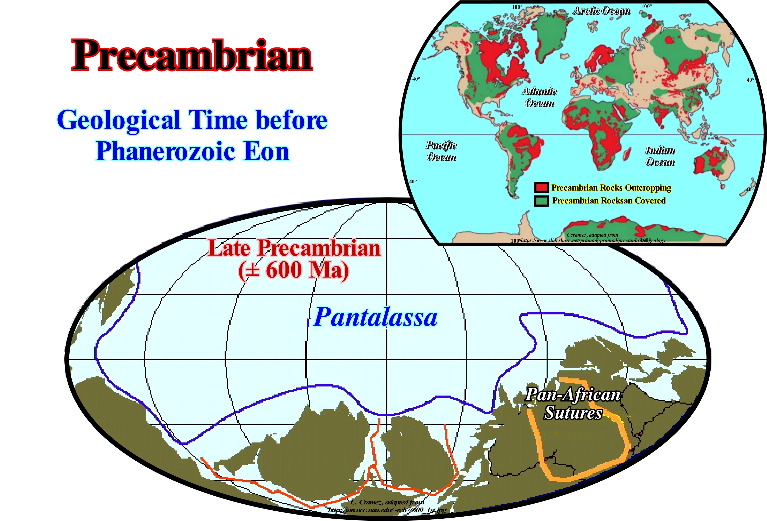 Earth formed at about 4.5 Ga (4.5 billion years ago), but almost 4.0 My (4.0 billion years) passed until the first animals appeared. It is this interval of time that the geoscientists call Precambrian. Some geoscientists avoid this term and prefer to consider, prior to the Phanerozoic, three Eons (Harland et al., 1982): (i) Proterozoic ; (ii) Archean and (iii) Priscoanian. But the names of the periods and epochs that compose these eons do not have international status and vary from one geoscientist to another. The paleogeographic sketch illustrated in this figure (Late Precambrian ± 600 Ma), for certain geoscientists, corresponds to the paleogeography of the Vendian Period, which is part of the Rifean era of the Proterozoic eon. Anyway, speaking of the Precambrian as a mere time-interval is misleading because it encompasses about 7/8 of Earth's history. During this time interval the most important geological and biological events of the Earth's history occurred: (i) Earth formed ; (ii) Life appeared ; (iii) The first lithospheric plates formed and began to move relative to each other (plate tectonics) ; (iv) Eukaryotic cells (also called eukaryotes) have appeared and evolved ; (v) The atmosphere was enriched in oxygen and (vi) The multicellular organisms, including the first animals appeared. At the end of the Precambrian, almost the entire continental mass was agglutinated and formed the supercontinent Pre-Pangea or Rodhinia, which, as shown above, was located almost, entirely, in the southern hemisphere. The great ocean that surrounded the Pre-Pangea was the Panthalassa. Sea level was low, since volume of ocean basins was very large, because most oceanic mountains (oceanic ridges induced by oceanic expansion) were swallowed by B-type subduction zones. The volume of water, in all its forms, has been considered constant since the Earth's formation (around ± 4.5 Ga).