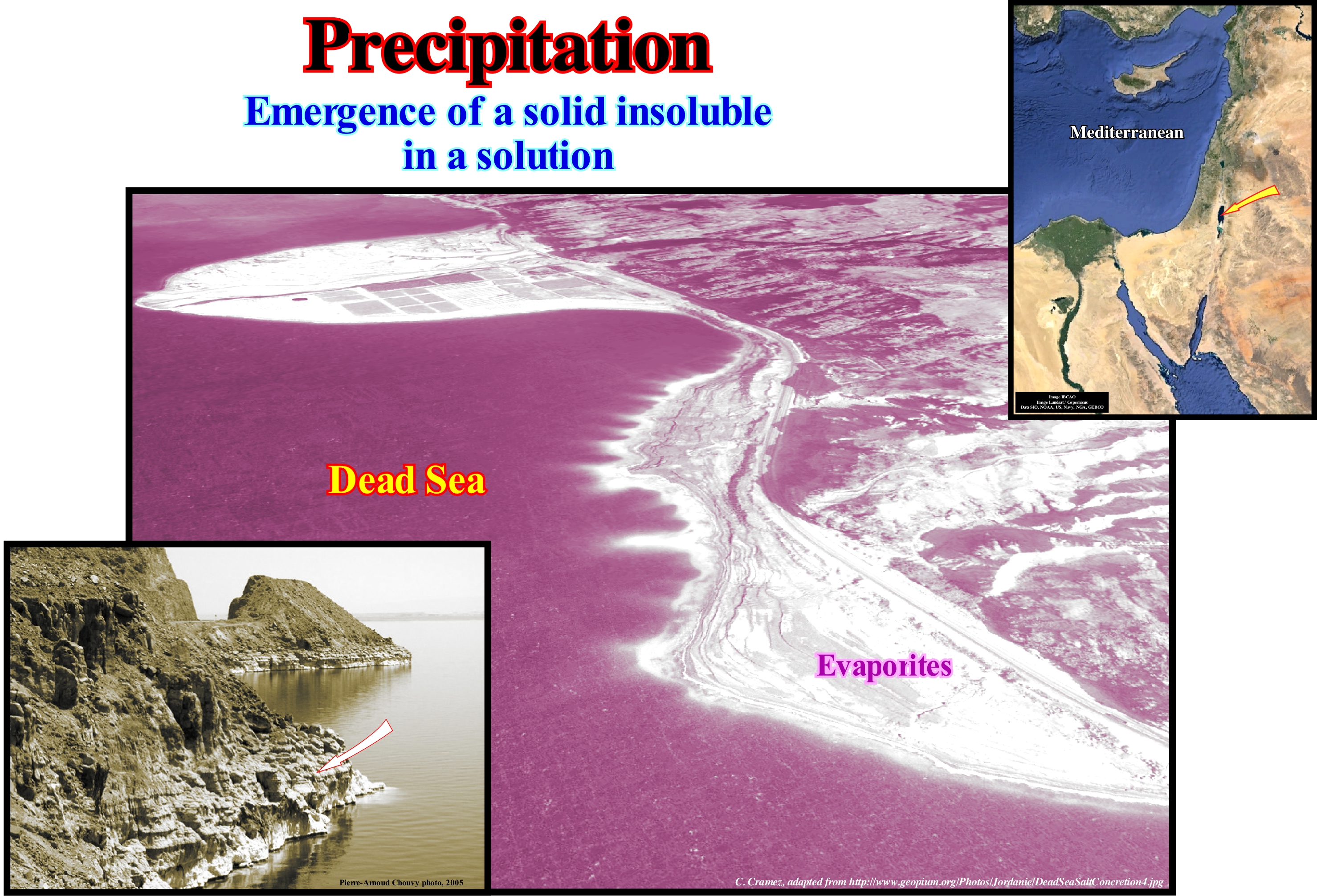Precipitation is the formation of a solid during a chemical reaction. The solid formed in the chemical reaction is called a precipitate. This can occur when the insoluble substance, the precipitate, is formed in the solution due to a chemical reaction or when the solution has been supersaturated by a compound. The formation of the precipitate is a sign of chemical change. Most of the time, the formed solid exits the phase and sinks to the bottom of the solution (however it will float if it is less dense than the solvent, or form a suspension). Such a reaction is useful not sedimentology and has many industrial and scientific applications whereby the chemical reaction can produce a solid which will be collected from the solution by filtration, decantation or centrifugation. An important stage of the precipitation process is the beginning of nucleation (the process by which nuclei are usually formed in solution; the term nucleus as used herein is defined as the smallest aggregate of the solid phase of atoms, molecules, or is formed during a precipitation and is capable of growth spontaneously). The creation of a hypothetical solid particle includes the formation of a surface, which requires energy based on the surface energy ratio of the solid and the solution. If such energy is not available, and no suitable nucleation surface is available, supersaturation occurs (solution containing more dissolved material than could be dissolved by the solvent under normal circumstances). This photograph illustrates the deposition of evaporites by precipitation in the Dead Sea. The sedimentary textures of halite suggest that it is usually deposited rapidly in the form of large transparent crystals and that impurities are introduced when ambient conditions change and halite deposition stops momentarily. In shallow water, halite precipitates at the bottom of the brine in the form of a crystalline crust that on average is no more than an inch thick.