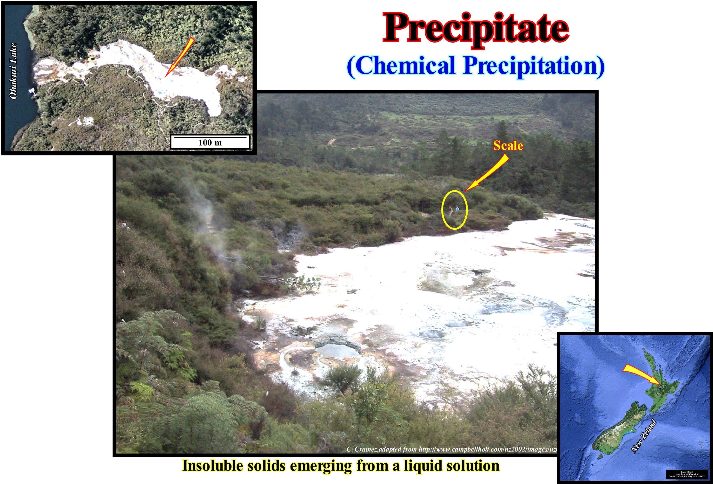 A precipitate is a solid which forms from a solution. A common example is the mixing of two clear solutions: (1) Silver nitrate (AgNO3) and (2) Sodium chloride (NaCl). The precipitate forms because the ClAg solid is insoluble in water. This is true for all precipitates, which are solids insoluble in aqueous solutions. Sometimes the house pipes are clogged by precipitates of magnesium and calcium oxides deposited in the pipes. This can happen with hard water (with salts dissolved in more than 5%). Another example of precipitates are the kidney stones, which are almost always calcium ions and oxalates. This is why it is often suggested that a good way to avoid kidney stones is to drink plenty of water because this increases the solubility of the precipitate, that is, of the stones. Rocks formed by precipitated material, such as certain carbonates, evaporites, concretions, etc., are, easily, distinguished from other sedimentary, metamorphic or igneous rocks, as suggested in this figure which illustrates the Orakei Korako thermal area, near Lake Ohakuri, which is, probably, one of the best thermal areas in New Zealand and the world. The light spots correspond to enormous masses of precipitates that exhibit very varied colours, which contrast with the colour of the surrounding rocks. A mineral can precipitate from a solution of water in the pores or other openings of the rocks either by a chemical reaction with the surrounding rocks, either by a change of pressure or temperature or even just evaporation. The quartz veins that sometimes cross the igneous rocks are common products of a mineral precipitate. In the same way many concretions, which are geological structures still poorly understood and often confused with fossil eggs, turtle shells or bones, are geological phenomena very common in all types of sedimentary rocks, either in sandstones, shales, siltstones, and limestones) appear to form as minerals precipitated in fractures and cavities or as sedimentary constructions at successive levels around a nucleus such as a shell or a pebble.