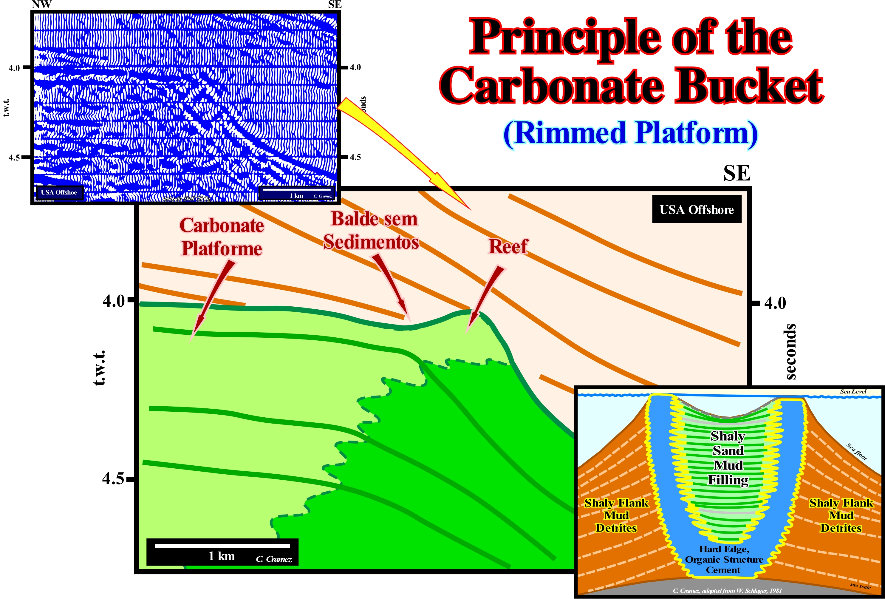 The architecture of the growth of a rimmed carbonated platform resembles the geometry of a bucket or inverted cone trunk, with the mouth wider than the bottom. The carbonate platform is sustained either by the rigid reef-like borders or by the rapid cementing of the shallow sands or by the filling of unconsolidated sedimentary particles of the lagoon or the tidal plain. According to W. Schlager, three basic concepts have to be taken into account in carbonate sedimentation: (a) Carbonates are, mainly, of organic origin ; (b) Carbonates build structures resistant to sea waves and (c) Carbonates undergo an intense diagenetic change, since the original minerals are metastable. Five main types of carbonate platforms are, generally, considered: A) Rimmed Platforms ; B) Ramp Platforms ; C) Epeirial (or epíric) platforms ; D) Isolated Platforms ; E) Dead or Drowned Platforms. Rimmed platforms are characterized by the presence of reefs or calcareous sand from shallow (carbonated sandbanks covered by shallow sea water) on the edge of the platform and sands clay in the lagoon or on the open platform. This type of platform forms in calm waters and its extension varies between 10 and 100 km. Ramp Platforms, in which the carbonated sands of the shoreline pass, at the base of the ramp, to clay sands and deep-water muds, are platform in which the reefs are rare and the width of the ramp can reach 100 km. Epeirial (or epíric) platforms are characterized by the presence of tidal surfaces and protected lagoons. The width of an epeiric platform can reach 10,000 km. Isolated Platforms. the facies (lithologies) are very controlled by the orientation of the prevailing winds. These platforms have sandy reefs and bodies, such as the rimmed platform, in the windward margin (the margin facing the side from where the wind blows), but in the leeward margin (margin in direction to where the wind blows), the sediments are more muddy. An isolated platform can reach 100 km wide. Dead or drowned platforms are below the photic zone (where there is insufficient light for photosynthesis, i.e. when glucose (C6H12O6) is obtained from carbon dioxide (CO2) and water (OH2) through the energy of sunlight). The most well known carbonate platform geometry is associated with tropical manufacturing processes, where carbonate platforms can be subdivided into three main sedimentary environments: A) Reef, which is the part of the carbonate platform created in situ by sessile organisms ; B) Internal Lagoon (part of the platform behind the reef, which is characterized by shallow and calm waters with sediments composed of fragments of reefs and hard parts of organisms or terrigeneous sediments when the reef is epicontinental) and C) Reef Slope that connects the reef to the basin and acts as a sink for the excess carbonate sedimentary particles, although most of the sediment produced in the lagoon and the reef is transported by various processes and accumulated on the slope. Besides this principle, in Geology there are many others, among which we can mention: (i) Principle of Composition, a rock represented by fragments in another rock is older than the rock that contains them ; (ii) Principle of Original Lateral Continuity, the sedimentary layers settle down in lateral continuity ; (iii) Principle of Original Horizontality, the sedimentary layers deposit horizontally (not totally true) ; (iv) Principle of Intersection, the most recent dyke move the oldest dykes ; (v) Principle of Intrusion, an igneous intrusive rock is younger than the rock it penetrates ; (vi) Principle of Superposition, in a slightly deformed sedimentary series, the oldest layers are at the base and the most recent layers above ; (vii) Principle of Ochkam, plurality should not be invoked without necessity ; (viii) Goguel's principle, during the deformation, the volume of the sediment remains. more or less, constant ; (ix) Walther's Principle, in conforming strata, vertically, succeeding facies occur, laterally, in adjacent environments ; (x) Dextrological Principle, if a reference system rotates clockwise the deflection (Coriolis effect) is to the left of the object, in the direction of motion ; (xi) Principle of Uniformitarianism, geological changes are due, mainly, to the same processes and continuous changes that are observed today: "The Present is the key of the Past" ; (xii) Principle of Fossil Succession, the distribution of fossils in rocks is not unpredictable, it follows a definite vertical sequence ; (xiii) Principle of Catastrophism, changes that occurred on Earth were due to the occurrence of major natural disasters ; (xiii) Principle of the Continental Drift, the continental masses have a small density and, for this reason, floated on the dense masses of ocean, moving and changing the surface of the planet ; (xiv) Principle of Plate tectonics, it is not the continents that move, but the lithospheric plates that contain these continents, etc.