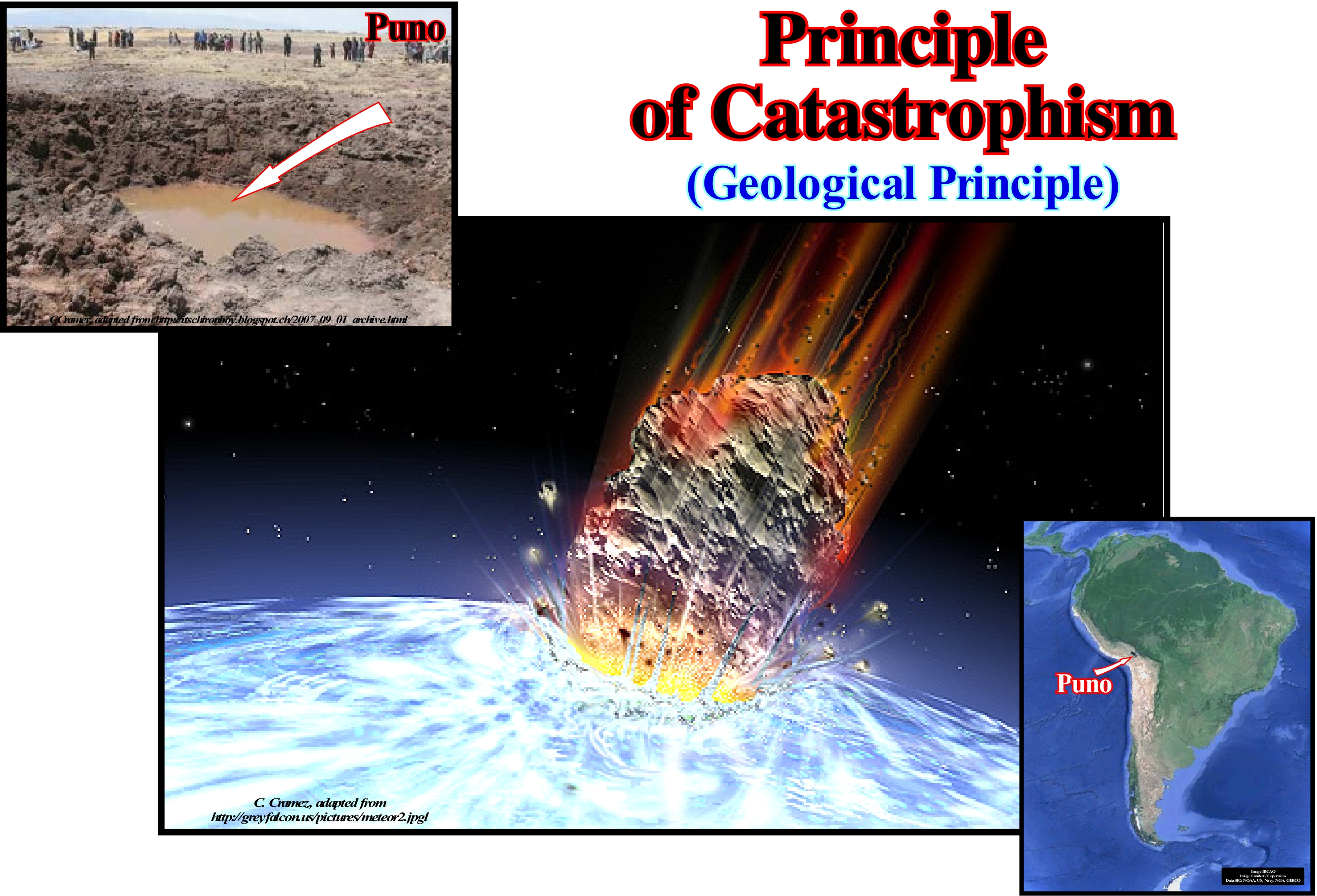 Before 1850, most humans thought that Earth was, relatively, young and that the processes and forms of relief occurring on Earth were the result of catastrophic events (such as Creation and the Flood) that occurred very rapidly (principle Catastrophism). However, detailed observations of the processes taking place on Earth led certain geoscientists such as James Hutton and Charles Lyell to advance the hypothesis that the processes that can be observed today are the same ones that have operated throughout the history of the planet. This allowed them to advance the concept of Uniformitarianism, often referred to as "The Present is the key to the Past." The most modern way of asserting this principle is the conjecture that the laws of nature have operated in the same way over time and that all geological processes must obey the laws of nature (laws of physics and chemistry). Initially one of the most difficult problems of applying this principle to Earth was the hypothesis that the rates of all geological processes had been the same over time. It is now known the Earth is much older (4.5 billion years) than was thought even in the nineteenth-twentieth centuries and that in the early days of its history it was much warmer than it is today. Thus, it is likely that the rates of some geological processes have changed over time. It has also been recognized that there may be rare catastrophic events that can cause very rapid changes on Earth. As these catastrophic events occur, infrequently, it is difficult to observe their effects, but it seems that they follow the laws of nature. As suggested in this figure, a meteor* collided with the Earth to the south with the Peruvian city of Puno, in the region of Carangas on September 16, 2007, causing a crater about 15 meters deep. This photograph was taken two days after impact.