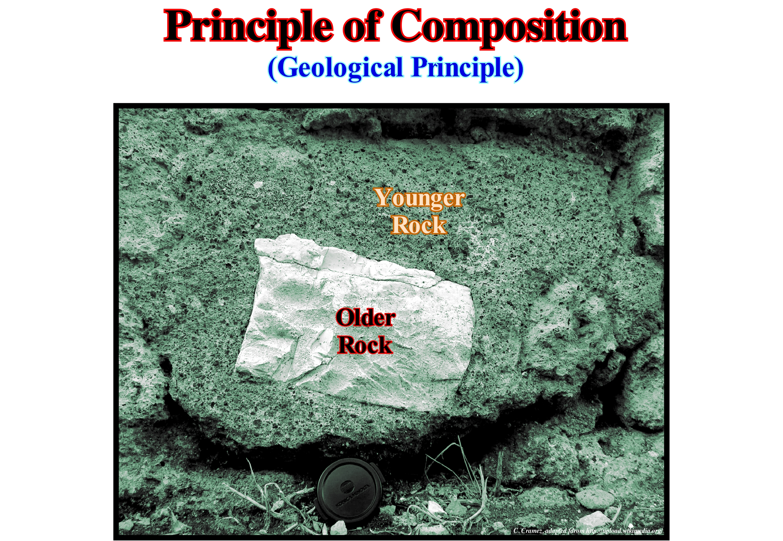 This principle says a rock is younger than its constituents. It applies to all types of rocks. A granite rock, for instance, is younger than the inclusions (xenoliths*) that it contains. A conglomerate is younger than its pebbles, which are, often, fragments of much older rocks. A volcanic rock, as illustrated in this figure (lava of Mount Vesuvius, Pompeii, Italy), is, always, younger than the xenoliths it contains, i.e., in this case, the limestone rock from which the block has been trapped in the lava. The limestone rock formed several tens of millions of years before the block was engulfed in lava. Although this geological principle is always valid for rocks, it is not, necessarily, true for minerals. A rock may contain minerals younger than it, since metasomas are very frequent in rocks that have undergone an important metasomatism**. In addition to this geological principle there are others, such as: (i) Principle of the Original Lateral Continuity, which says: the sedimentary layers deposit in lateral continuity ; (ii) Principle of the Original Horizontality, which states: the sedimentary layers deposit horizontally ; (iii) Principle of Intersection, which says the most recent dyke displace the oldest dykes ; (iv) Principle of Intrusion, which says an igneous intrusive rock is younger than the rock it penetrates ; (v) Principle of Superposition, which states: in a series of non or slightly deformed sedimentary layers, the oldest layers are at the bottom and the most recent ones above ; (vi) Principle of Fossil Succession, which says: the distribution of fossils is not unpredictable, it follows a definite vertical sequence ; (vii) Principle of Goguel, which says: during the deformation, the volume of the sediment is more or less constant ; (viii) Walther's Principle, which states: facies that succeed, vertically, in conforming strata, succeed laterally in adjacent environments ; (ix) Dextrological Principle, which says: if a reference system rotates in a clockwise direction the deflection (Coriolis effect) of an object is to the left ; (x) Principle of the Carbonated Bucket, which says: the growth of an edged platform is determined by the growth of the edge; (xi) Principle of Uniformitarianism; (xii) Principle of Ochkam, etc.