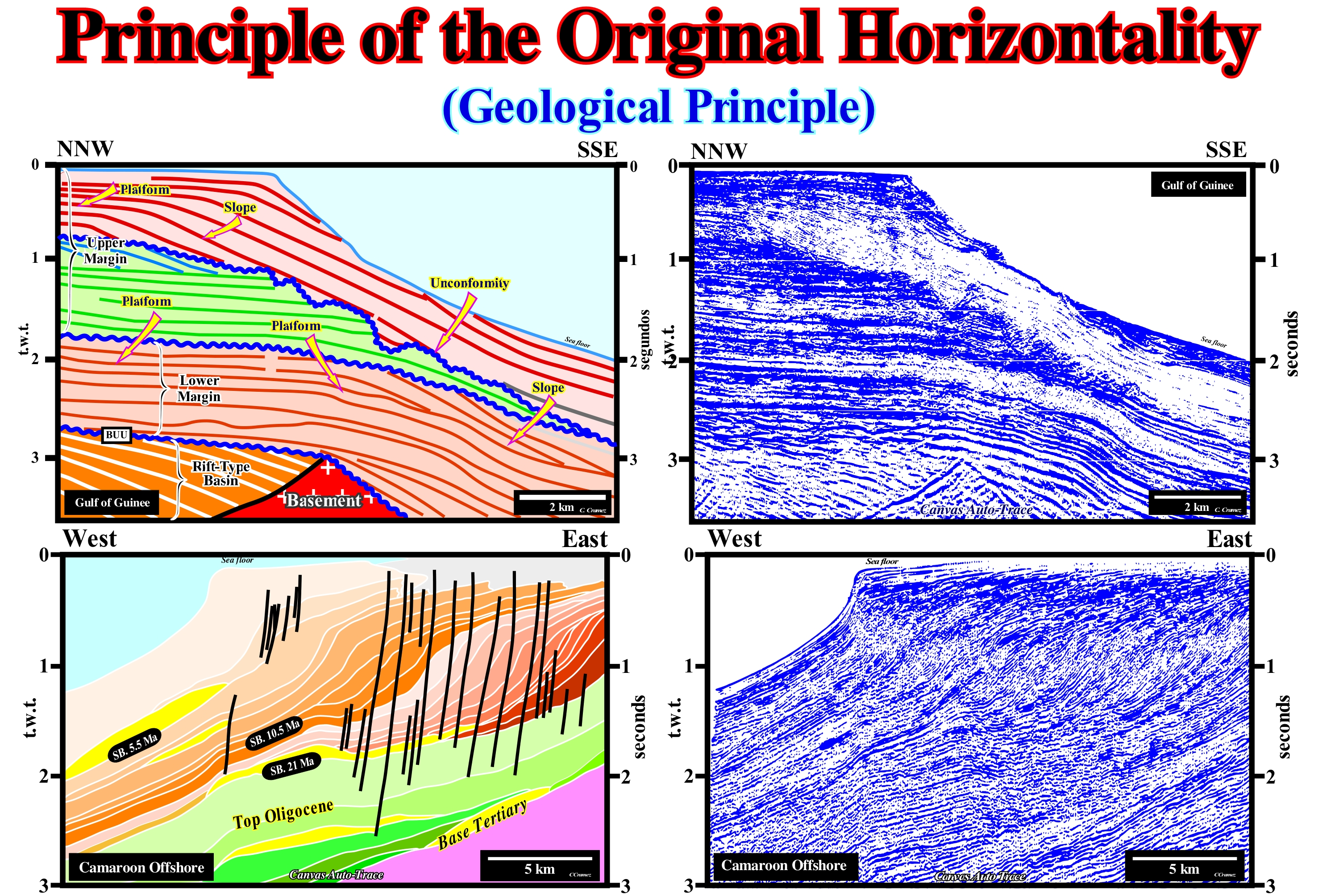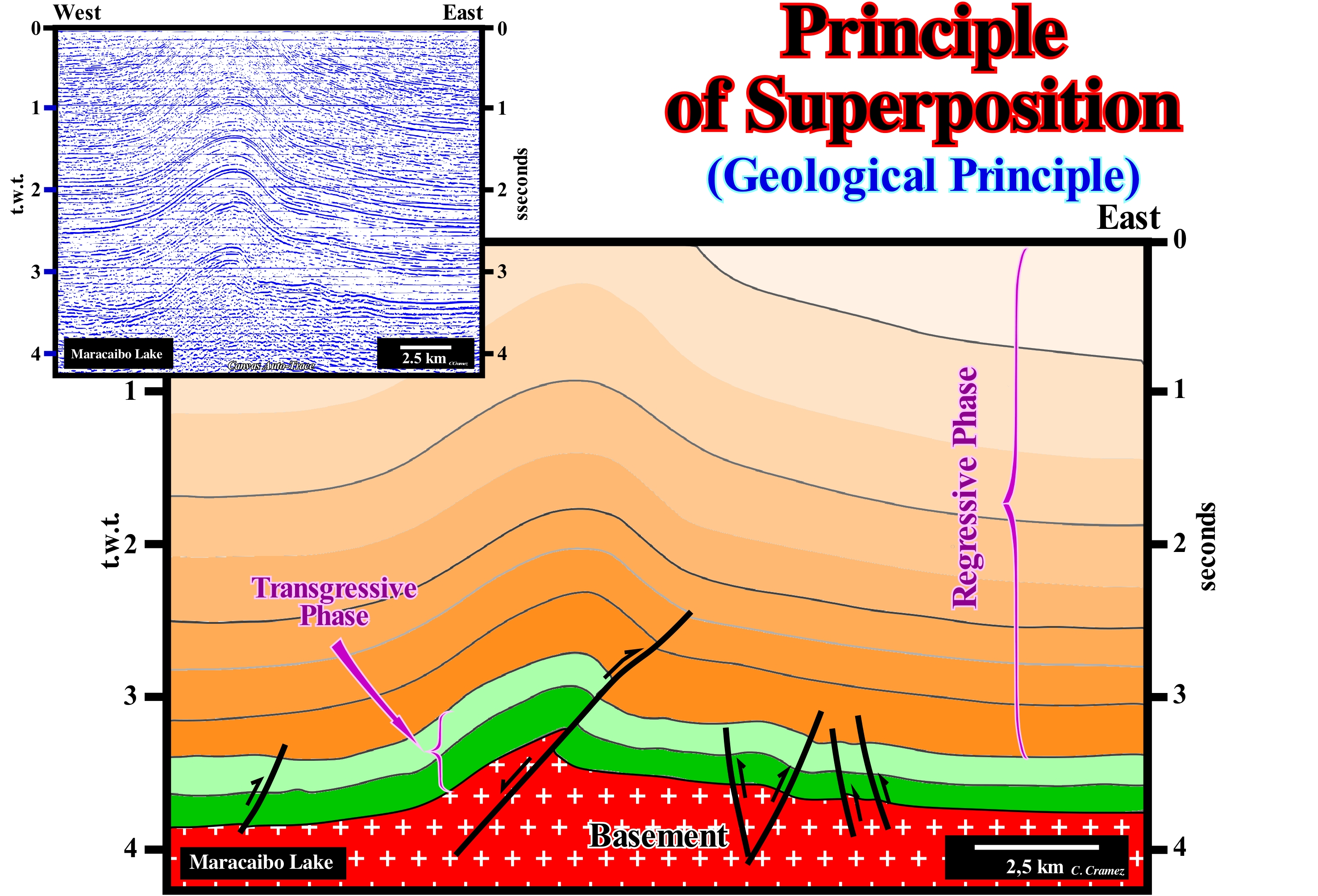 This principle is one of the three great geological principles advanced by Steno*: "At the moment in any one stratum was deposited, all the matter that rested on it was fluid, therefore, at the moment in which the lower stratum was deposited, neither stratum existed". Steno was one of the first scientists to oppose the church in defense of geology. It was the young Danish doctor named Niels Stenson, considered the" father of stratigraphy ", but known by the Latinized name Nicholas Steno (1638-1686) who arrived in Florence, Italy at the invitation of Grand Duke Ferdinand II (http://ufrr.br/lapa/index.php?option=com_content&view=article&id=%2095). The original superposition principle is one of the three principles of Nicolaus Steno. As illustrated on this tentative geological interpretation of a Canvas auto-trace of Maracaibo Lake (Venezuela) seismic line, the principle of superposition is more than evident in regions not deformed by shortening. When sediments are, greatly, shortened, reverse faults may form and older sedimentary intervals may overlap the more recent intervals, as can be seen in the lower part of the proposed reverse failure in the central part of this tentative interpretation. However, it can be said in regions where the sedimentary shortening is small, the principle of overlap advanced by Nicolas Steno in the 17th century is valid for all sedimentary deposits, with a particular restriction on terraces. In fact, in a succession of terraces (each of which is formed by a flat or slightly inclined surface called a step, bounded on the one hand by a slope with a steeper slope), that they are fluvial, marine, lacustrine or glacial, the most recent terraces are deposited at a lower altitude than the older terraces. Besides this principle, in Geology there are many other principles or hypotheses, among which we can mention: (i) Principle of Composition: a rock represented by fragments in another rock is older than the rock that contains them ; (ii) Principle of the Carbonated Bucket: the architecture of the growth of a fringed carbonate platform resembles the geometry of a bucket or inverted cone trunk ; (iii) Principle of Original Horizontality: the sedimentary layers deposit horizontally (not totally true) ; (iv) Principle of Intersection: the most recent filaments move the oldest filaments ; (v) Principle of Intrusion: an igneous intrusive rock is younger than the rock it penetrates ; (vi) Ochkam's Principle: plurality should not be invoked without necessity: "Pluritas non est ponenda sine necessitate"; (vii) Goguel's Principle: during the deformation, the volume of the sediment remains more or less constant ; (viii) Principle of the Original Lateral Continuity: the sedimentary layers settle in lateral continuity ; (ix) Walther's Principle: in conforming strata, vertically succeeding facies occur, laterally, in adjacent environments ; (x) Dextrological Principle: if a reference system rotates clockwise the deflection (Coriolis effect) is to the left of the object, in the direction of motion ; (xi) Principle of Uniformity: geological changes are due mainly to the same ongoing processes and changes that are currently observed ; (xii) Principle of Fossil Succession, the distribution of fossils in rocks is not unpredictable, it follows a definite vertical sequence ; (xiii) Principle of Catastrophism: changes that occurred on Earth were due to the occurrence of major natural disasters ; (xiii) Principle of the Continental Drift, the continental masses have a small density and, for this reason, floated on the dense masses of ocean, moving and changing the surface of the planet ; (xiv) Principle of Plate Tectonics: it is not the continents that move, but the lithospheric plates that contain these continents ; (xiv) Principle of Neocatastrophism: admits Uniformitarianism as the main guide, but does not exclude that occasional catastrophic phenomena have have contributed to any changes in the land surface; in other words, Neocatastrophism associates catastrophic ideas with Uniformitarianism to explain certain phenomena such as the extinction of dinosaurs, etc.