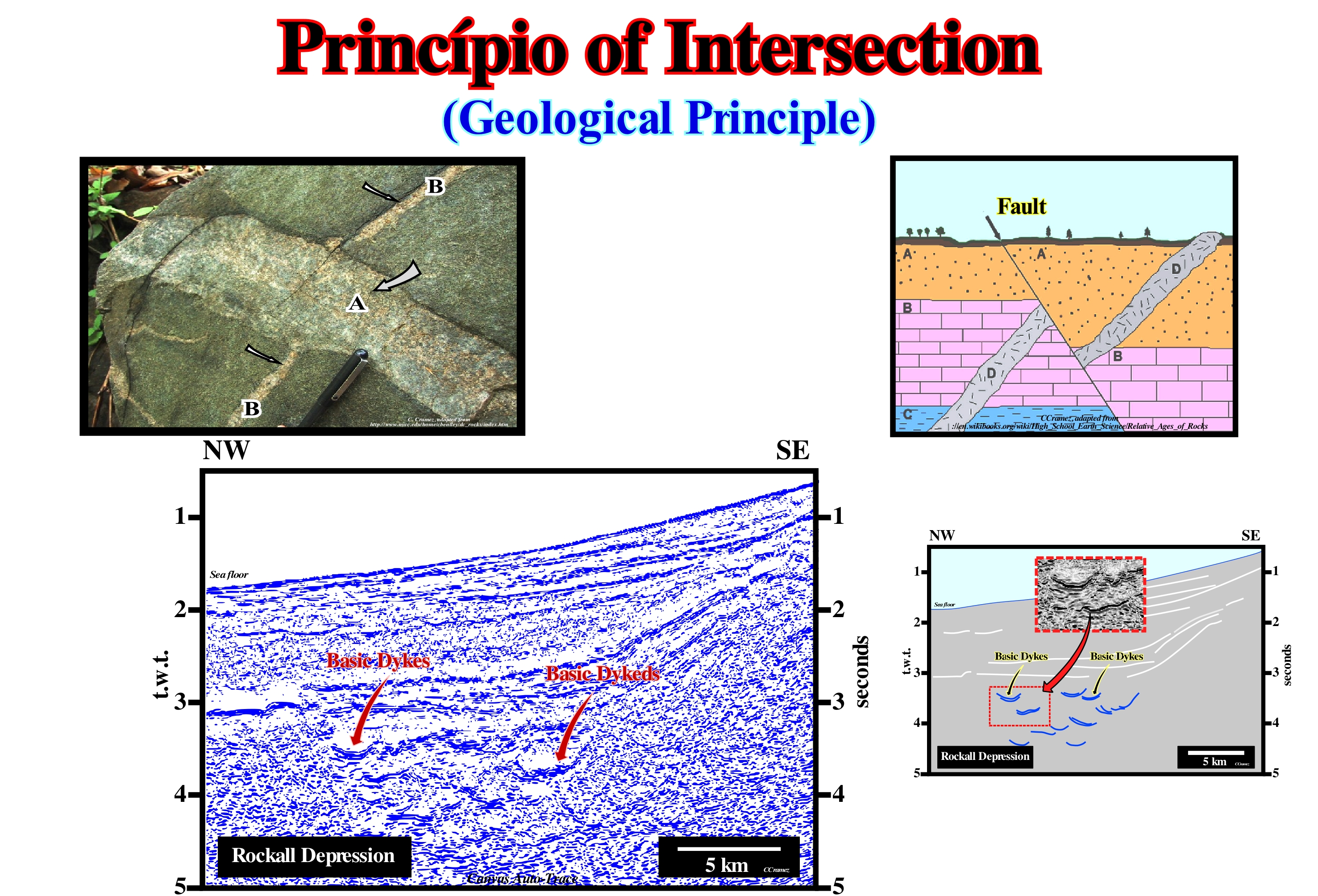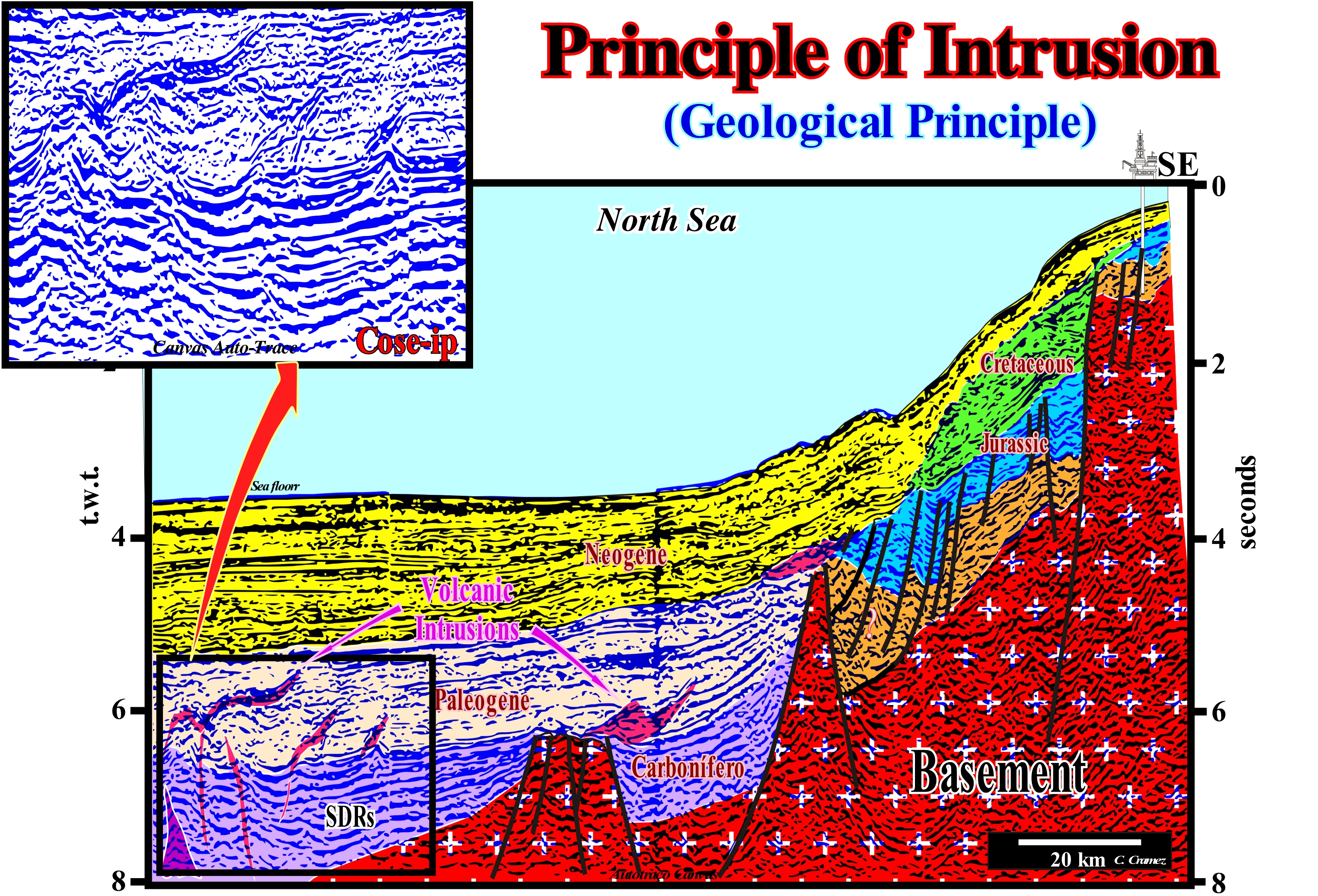 This principle indicates that the relative age between two igneous rocks or between an igneous rock and a sedimentary rock can be deduced by the geometric relations between them. Indeed, as illustrated on this tentative interpretations of a Canvas auto-trace of Rockwall depression (offshore of England) regional line, it is evident that the volcanic intrusions are posterior to the rocks they cross, even if they are of volcanic origin. Besides this geological principle there are other principles in the geology of which the most important are: (i) Principle of Composition: a rock represented by fragments in another rock is older than the rock that contains them ; (ii) Principle of the Original Lateral Continuity: the sedimentary layers settle down in lateral continuity, they thin themselves until they disappear or end by downlaps or onlap against the edges of the original depositional sectors ; (iii) Principle of Original Horizontality: the sedimentary layers deposit horizontally ; (iv) Principle of Intersection: the most recent filaments move the oldest filaments ; (v) Principle of Superposition: in a non or slightly deformed sedimentary rocks, the oldest layers are at the base and the most recent layers successively up ; (vi) Principle of Fossil Succession: the distribution of fossils in rocks is not unpredictable, it follows a definite vertical sequence ; (vii) Goguel's principle, during deformation, the volume of the sediment is, more or less, constant ; (viii) Walther's principle, vertically succeeding facies in the conforming strata follow, laterally, in adjacent environments ; (ix) Dextrological Principle, if a reference system rotates in the clockwise direction an object and deflected (Coriolis effect) to the left in the direction of motion ; (x) Principle of Carbonated Bucket: the growth of an edged platform is determined by the growth of the edge ; (xi) Principle of Uniformitarianism: geological changes are due mainly to the same ongoing processes and changes that are currently observed ; (xii) Principle of Ochkam: plurality should not be invoked without necessity, "Pluritas non est ponenda sine necessita", etc.