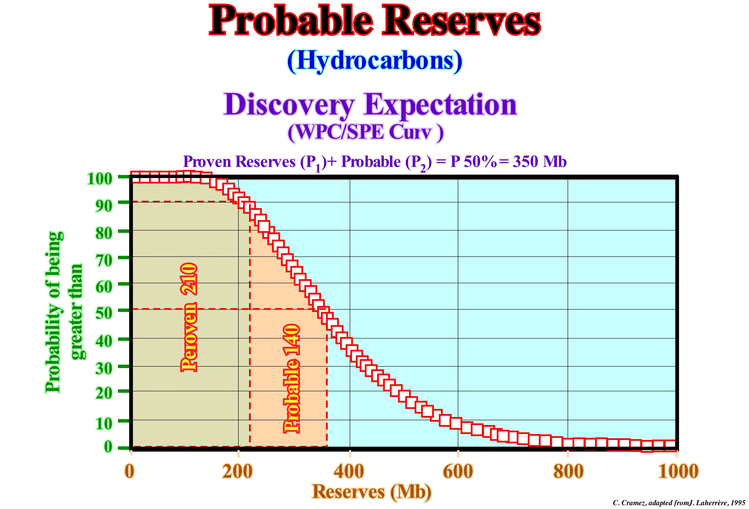 The probable reserves are the quantified estimates of hydrocarbons (crude oil, natural bitumen, natural gas, natural gas liquids) in addition to proven reserves, which from a certain date, the geological and engineering analysis of a certain data numbers suggested a probability of existence and, possibly, are not commercially recoverable under present economic or technological conditions. Probable reserves are less certain than proven reserves. In this context, it is reasonable to expect that the probability of recovery of the amount estimated as probable and proven reserves ranges between 40 and 60%. In this graph, probable reserves determined on the basis of geological maps or seismic maps of the or reservoir-rocks represent about 140 million barrels (140 Mb) for a 50% confidence level. The set of proved reserves (P1) plus probable reserves (P2) is 350 Mb. J. Laherrere (1999) says that when one speaks of reserves, one can not forget that: (i) They are the total of future production (expected) ; (ii) They are uncertain until the last day of production ; (iii) They are confidential ; (iv) There is a conflict between the method of calculation deterministic (1 value) and probabilistic (3 values) ; (v) Probabilities are subjective and poorly understood ; (vi) Only the expected values can be added ; (vii) Only fashion values can be multiplied ; (viii) There is no consensus in the definitions, since the publication of reserves is a political act and depends on the image that the company announcing it wants to give ; (ix) There are internal reserves (geoscientist, engineer, economist, etc.) and external reserves (for bankers, taxes, stockholders, etc.) ; (x) There are initial reserves and reserves remaining at a certain date ; (xi) Undeveloped reserves should be considered as initial (which a large part of small oil companies forget).
