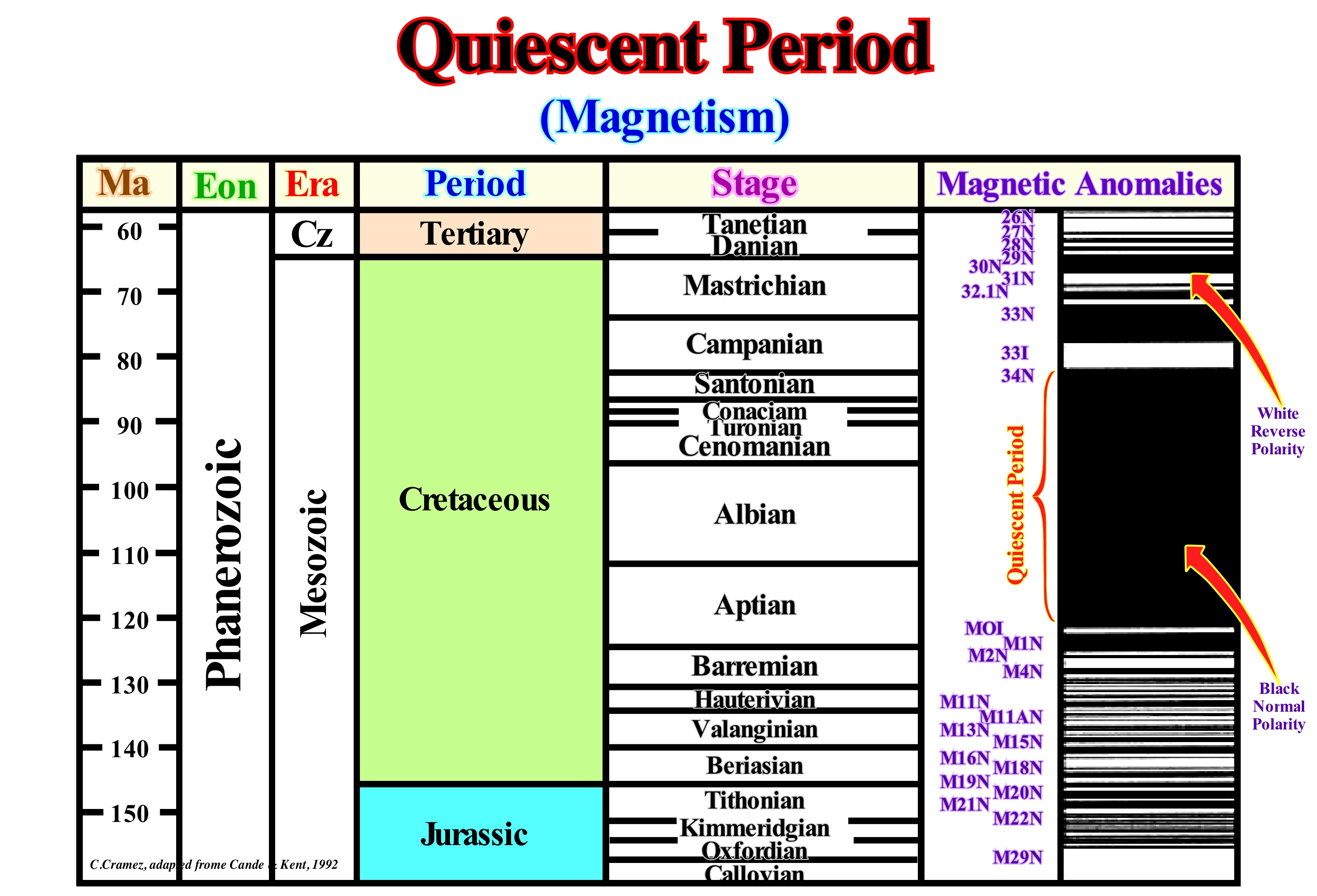 In this figure is illustrated the geological time in millions of years (Ma) of a part of the Phanerozoic Eon, mainly, of the Mesozoic Era. A part of the Tertiary period, the entire Cretaceous and an Upper Jurassic are represented, as well as, the respective Stages (do not confuse stage with age ; stage is a chronostratigraphic division, i.e., of rocks, whereas age is a geochronological division, that is, a time-division). In the magnetostratigraphy (last column) are drawn the time-intervals during which the polarity of the Earth's magnetic field was normal (N in black) and inverse (I in white). In the Cretaceous, during the intervals of the Campanian and Barremian stages, normal polarity (as at present) remained constant for a long time. Throughout geological history, the Earth's magnetic field has, often, been inverted, with the north pole becoming the south pole and vice versa. Reverse polarities appear at, more or less, regular intervals of thousands or millions of years for reasons which, until now, no one has clearly understood. The long intervals of time in which the magnetic polarity remained constant are designated by the geoscientists as quiescent periods or magnetic calm periods. This magnetic stability seems to be related to the eruption of a superplume (ascension, in the mantle and even in the Earth crust, of enormous quantities of magma, probably originated near the core-mantle interface) that occurred at about 120 Ma (Barremian) and released into the atmosphere, via the volcanoes associated with it, a large amount of carbon dioxide (CO 2). This superplume seems to have not only induced ocean expansion and dispersion of the continents, but also seems to have been the main cause of the rapid acceleration of the expansion velocity (oceanic spread), which tripled during the Middle Cretaceous. With the super-plume eruption, the inversions of the Earth's magnetic field stop for about 40 Ma, that is to say, that the magnetic field remained normal. A single period as long as this one of magnetic stability, but with inverse polarity, occurred during the Carboniferous (between the Late Pennsylvanian and the Early Mesozoic).