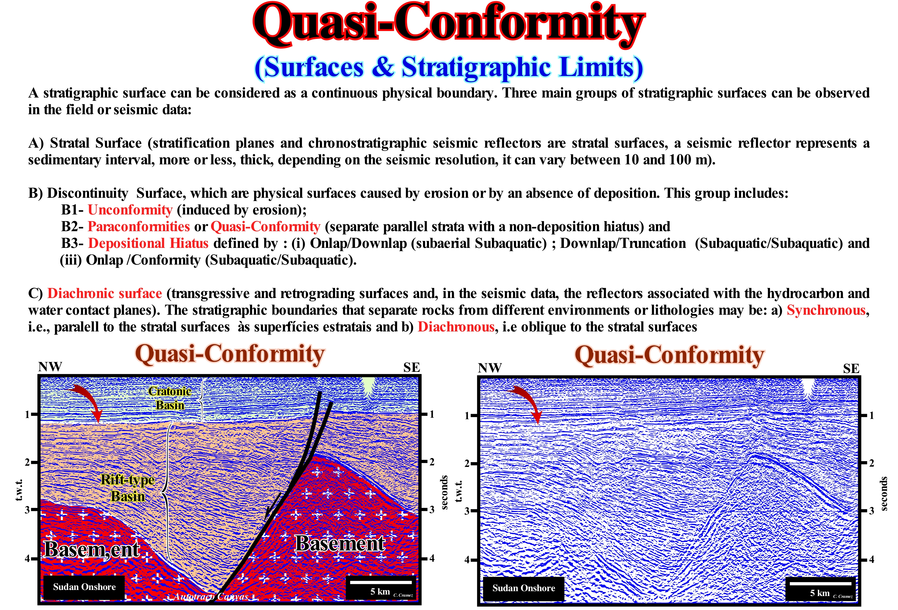 The Sudan onshore corresponds to the stacking of three types of basins from the classification of the sedimentary basins of Bally and Snelson (1980). Theoretically, on a seismic line of this onshore, the geoscientist in charge of interpretation must find, from the bottom up: (i) Basement that, generally, corresponds to a Paleozoic or Precambrian folded mountains belt ; (ii) Cretaceous rift-type basins and (iii) A Mesozoic / Cenozoic cratonic basin. The rift-type basins developed during the lengthening of the small supercontinent Gondwana, probably, in association with a thermal anomaly (isotherms uplift), which induced a differential subsidence, which caused the formation of halfgraben structures in the continental crust. The cratonic basin is, probably, associated with the thermal subsidence created by the cooling of the lithosphere mantle, i.e., by an isotherms subsidence. It can be said lithospheric lengthening (differential subsidence) and isostatic compensation induce a thermal anomaly under the thinned lithosphere or the opposite, cause or effect, which is the thermal anomaly that produces the lengthening and that the thermal anomaly begins to cool, the increase in density presses the lithosphere downward, causing a thermal subsidence. Thermal subsidence occurs exponentially and much more slowly than rapid differential subsidence, as it tries to maintain isostatic equilibrium while the asthenosphere rises, i.e., it cools (the differential subsidence of the lithosphere ceases since thermal subsidence begins). On this tentative geological interpretation of a Canvas autotrace of a detail of a seismic line of this onshore, the interface separating the rift-type basins from the overlying cratonic basin (sag phase for certain geoscientists) can be considered as a quasi-conformity. Seismically, there appears to be no rupture in sedimentation between the two basins basins, although at the SE end toplaps may be brought into evidence, but the reality is, very different. The rift-type basins, which correspond, in this particular case, mainly to lacustrine rocks rich in organic matter (potential source-rocks), which, geometrically corresponding to halfgrabens, were formed due to the continental crust extension. A sediment lengthening can only be achieved by normal faulting, which is, more or less, synchronous with sedimentation. This implies a differential subsidence, which is clearly visible by the increase in sediment thickness against the normal fault planes bordering the halfgrabens. The cratonic basin corresponds to a total change in the type of subsidence. As stated above, during the development of the cratonic basin, subsidence was thermal. Geoscientists still do not know if it is a thermal anomaly (sawing and rising of the isotherms), which produces the lithosphere lengthening, or if it is the elongation that induces the rise of the isotherms. The interface between the two types of basin is marked not only by an important hiatus, but also by a relative sea level fall, since the subsidence induced by the lengthening of the crust no longer exists. The interface, probably, corresponds to an unconformity (erosional surface), but since the relative sea level began to rise, the deposition of the cratonic basin began. Do not forget that all stratal surfaces represent a hiatus. However, when the hiatus is significant, the surface is considered to be an unconformity, which always has a minimum hiatus, which is, often, located in the deep part of the basin. At the level of a sequence-cycle, it is this minimum hiatus that is most appropriate for dating unconformities, i.e., the age of relative sea level fall*.