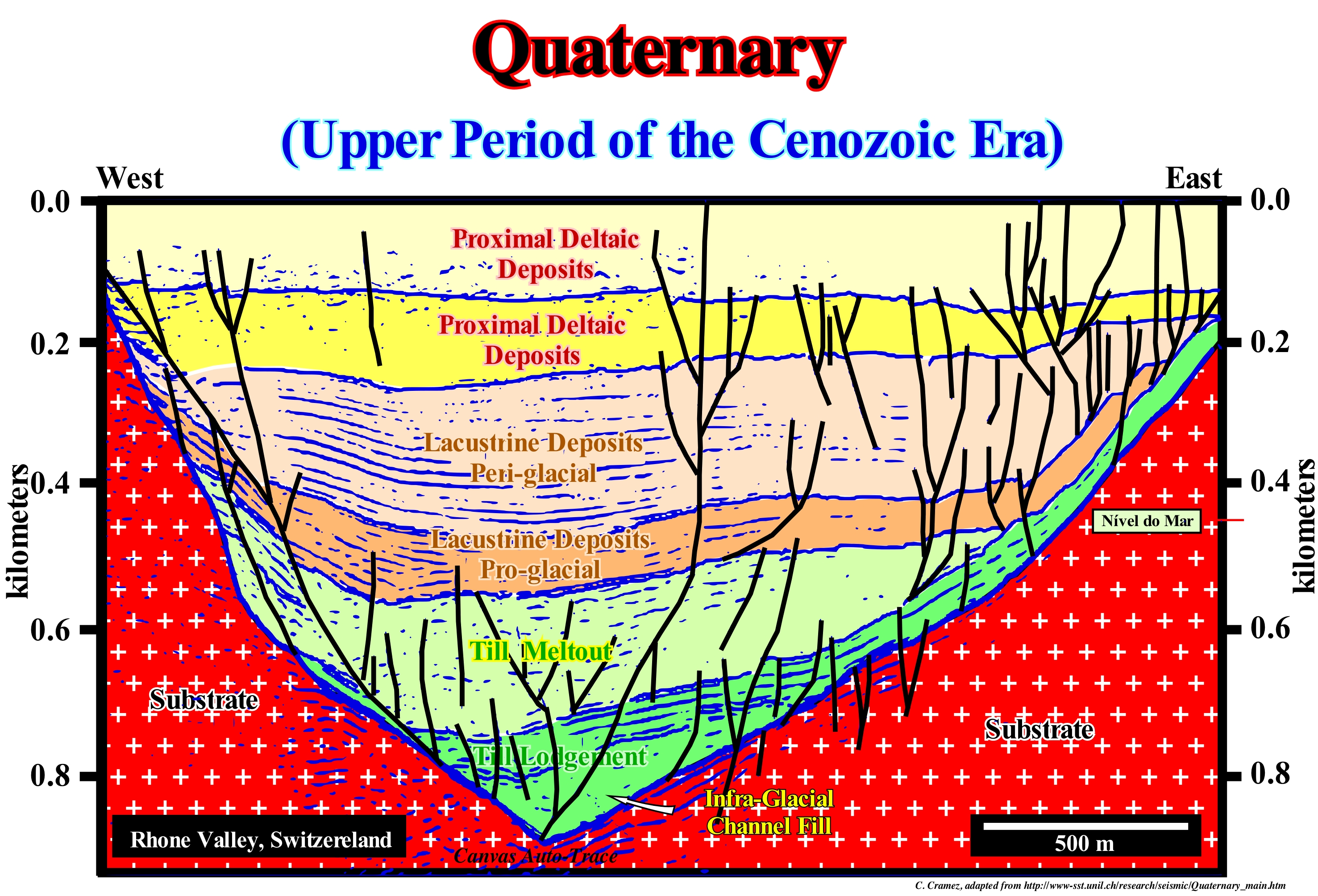 The Quaternary, that is, the last 1.8-1.6 Ma of the Earth's history, represents, more or less, the period of man's existence. In geological terms, this short period of time, which symbolizes about 0.04% of the Earth's history, is irrelevant from a paleontological point of view and, in tectonic terms, represents less than 100 km of oceanic expansion. The most important geological events of this system are certainly: (i) The emergence of the Bosphorus and Skagerrak straits (strait between Norway, SW Sweden and the Jutland peninsula linking the North Sea and Baltic Sea), the closure of which during the glacial epoch transformed the Black and Baltic Sea into great freshwater lakes, before being flooded by the transgression induced by deglaciation ; (ii) The closure of the Bering Strait, between Asia and North America ; (iii) The flooding of the Scablands in North America, etc. In general, as illustrated in this tentative geological interpretation of a seismic line of the "Geothermoval Martigny Project" (Switzerland), most of the Quaternary deposits are associated with the Würm glaciation and the post-glacial period. In this particular case, the Quaternary deposits filled an old glacial valley, whose base is now at about 400 meters below sea level. In this filling, from top to bottom, one can recognize: (a) Lake deposits, poorly individualized at the top of the seismic line ; (b) A proximal delta interval ; (c) Distal delta deposits; (d) Lacustrine, periglacial, well-stratified turbidite deposits ; (iv) Lacustrine pro-glacial deposits ; (v) "Meltout" till, that is, abandoned till by the melting of a debris-rich glacier, in which the debris have, practically, neither been transported nor deformed ; (vi) Lodge till (glacial debris agglutinated in a layer, more or less consistent, but deformed with the movement of the glacier) and (vii) The pre-Quaternary rocky substrate. In paleontological terms, the Quaternary is defined by the appearance of the Benthic foraminifera Hyaline Baltic in the Mediterranean Sea.