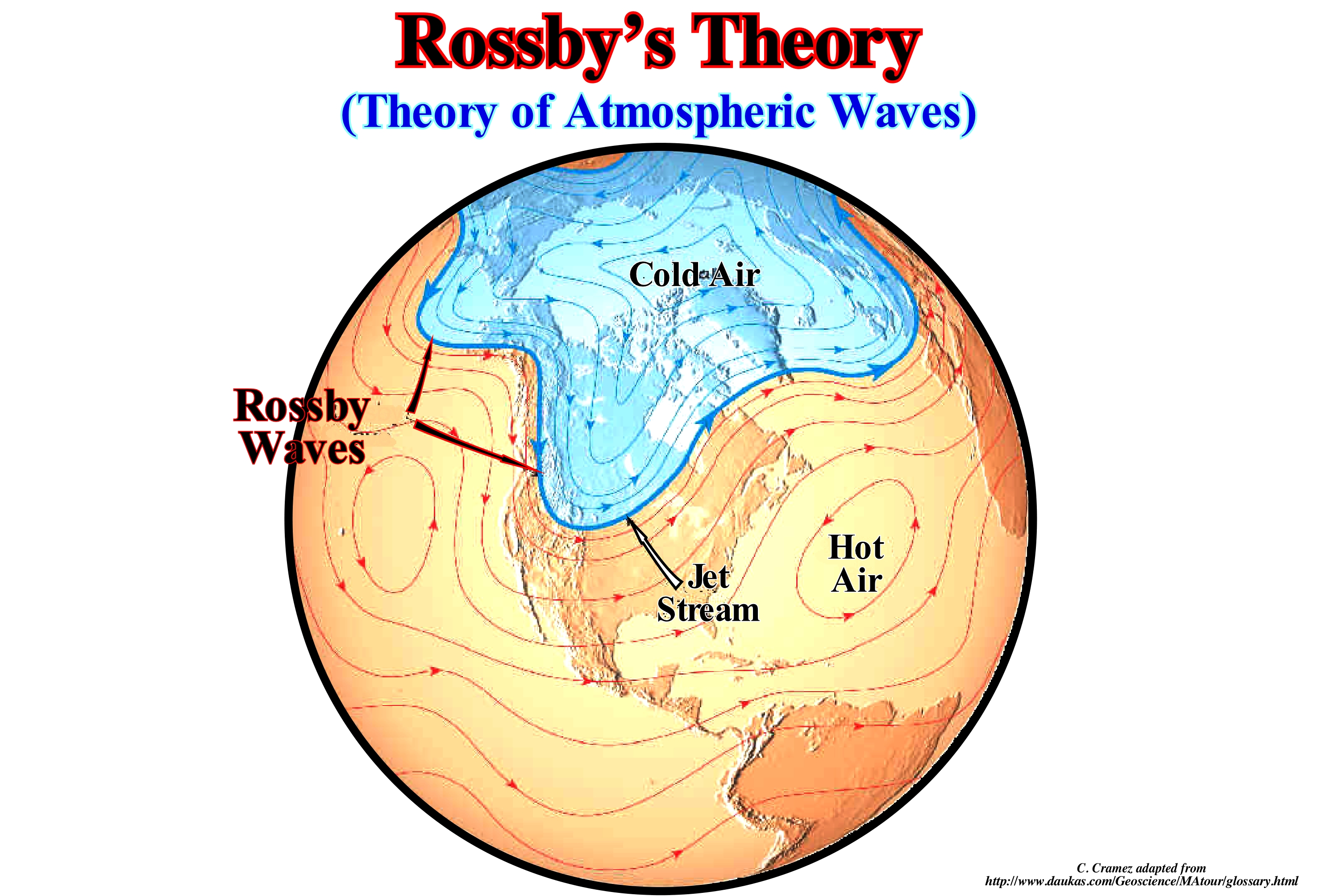 As illustrated in this figure, Rossby waves or planetary waves are giant meanders of fluid currents of planetary proportions. In planetary atmospheres, Rossby waves form due to the variation of the Coriolis effect with latitude. These waves were, initially, identified in the Earth's atmosphere in 1939 by Rossby, who explained their movement. Rossby waves are a subset of inertial waves. The special feature of Rossby wave identification is its velocity phase (the speed of the wave ridges) that always has a westward motion. However, the wave group velocity (associated with the energy flow) can be in either direction. Shorter waves, generally, have a group speed to the east, while longer waves have a group speed to the west. The terms "barotropic Rossby waves" and "baroclinic*" are used to distinguish their vertical structure. Barotropic Rossby waves do not vary in their vertical structure and have the fastest propagation speeds. On the other hand, baroclinic Rossby waves have a slower speed, with speeds of only a few centimeters per second or less. Rossby waves in the Earth's atmosphere are meanders of the large-scale jet stream. When a meander stands out, cold or hot air masses are isolated to form cyclones and anticyclones, which are responsible for the daily pattern of time in the middle latitudes. Rossby waves propagate from right to left (East to West) with a translation speed proportional to the wavelength (typically 3,000 km). However due to the general movement of the jet stream from west to east in the upper troposphere and mid latitudes, the small waves associated with baroclinic disturbances (cold fronts and extratropical cyclones) move from west to west. This, since the average speed of the west current is generally higher than the translation speed of the Rossby wave in the opposite direction.