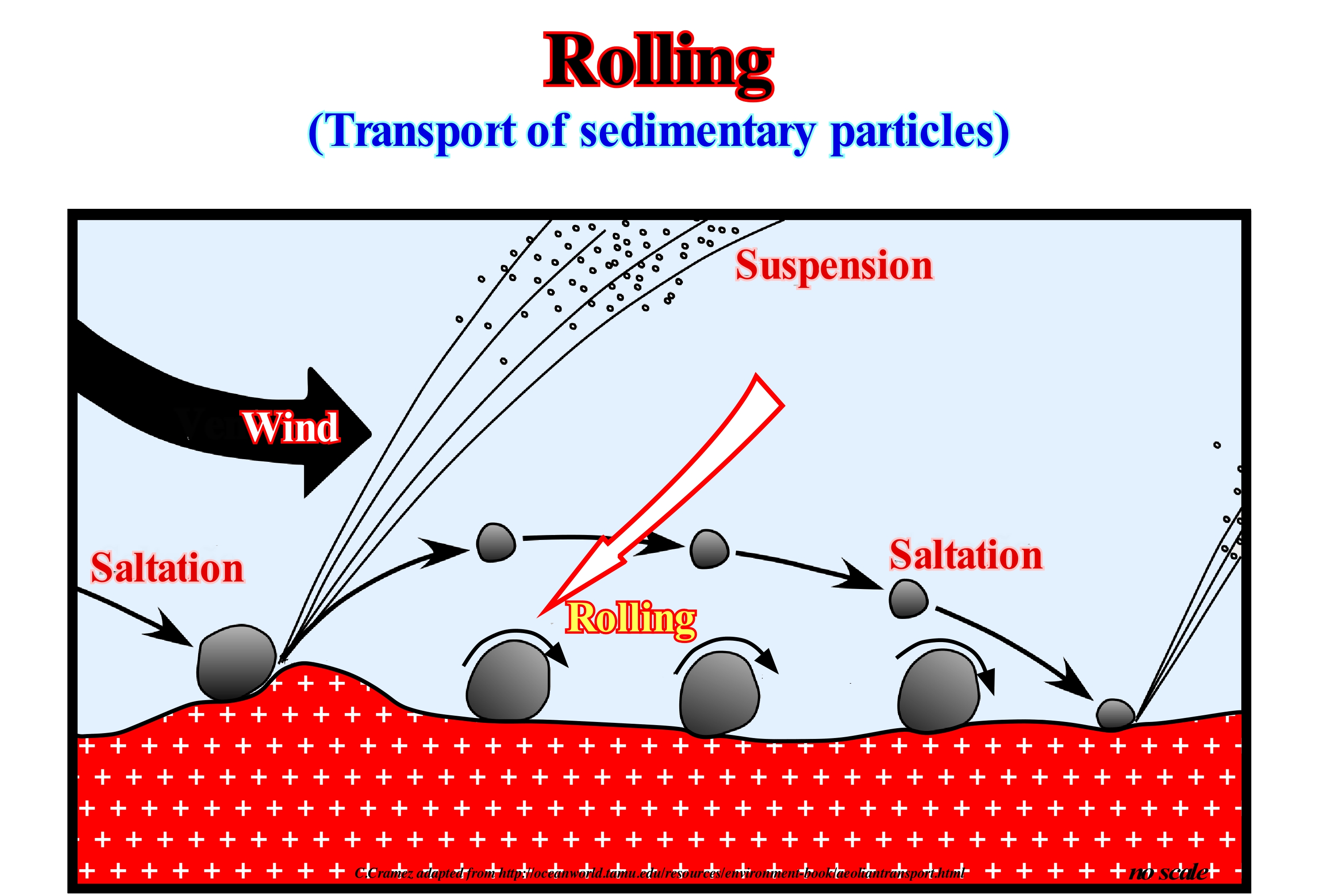 As shown in this figure, the sedimentary particles (detritus) carried by a water-course can be transported along the bed as bed loading either by sliding or rolling grain, in suspension or by saltation. Some sedimentary particles can, also be transported by flotation, at the top of the current near the surface. Rolling occurs when fairly large or elongated fragments are set in motion. The rolling will be favoured if a large grain moves on a relatively flat surface of smaller grains. There will be a much greater possibility for a grain to stop, if it is surrounded by or resting on grains of similar size to itself. All modes of transport of the base load (rolling, saltation, sliding and suspension) can coexist to a greater or lesser degree. They are, usually, associated with the development of different configurations on the surface of the sedimentary particles. These layer surface configurations, typically, occur as repetitive patterns at various scales. When fully developed, they reflect a balance between the current strength and the grain size of the sedimentary particle. A mixture of sedimentary particles and water, under suitable conditions, is capable of moving, under the action of gravity, as the mass flows. When a fluid flows at a small speed, the loose material it contains is displaced by rolling or dragging in the direction of the flow, i.e., that the particles are always in contact with the material-fluid interface. When the velocity of the fluid (water or wind) is greater, the lifting and momentum exerted by the fluid on the particles is sufficient for some of them to move away from the fluid-material interface and into the flow. Mass flows include a wide variety of processes, which are, theoretically, distinguished as distinct mechanisms in which sedimentary particles are supported within the flows. Flows that have a flow limit are considered as debris flows, of which the mud flows have a cohesion limit, while a grain flow has a friction limit. The fluid phase between particles is, usually, water, but in some flows it may be air.