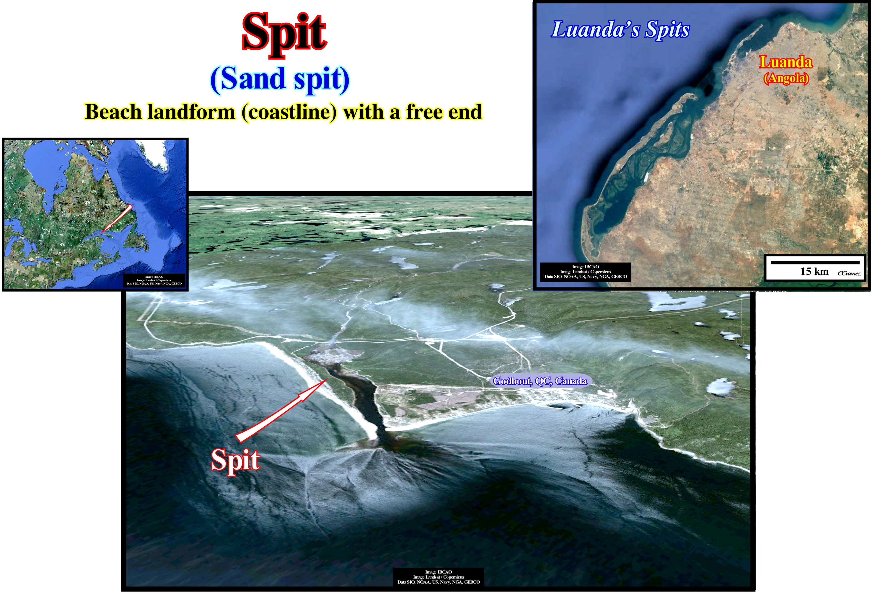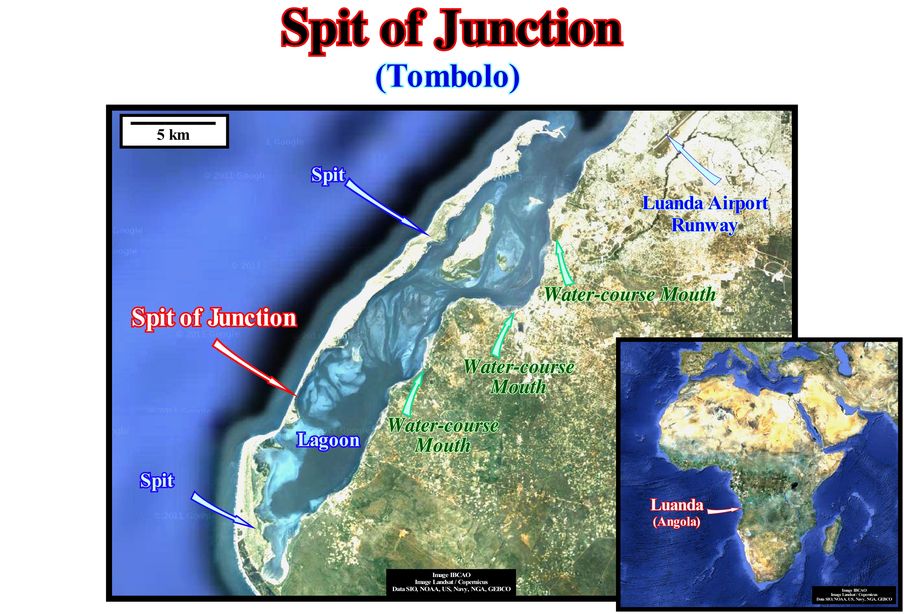 This photograph, which corroborates, perfectly, the geological model illustrated in the diagram, shows two small storm deltas, which, as its name suggests, were formed during a storm or during the equinoctial tides. Certain geoscientists also call this type of delta, wave delta. In the geological model of a storm delta, it recognizes: (i) The ocean with waves parallel to the shoreline ; (ii) A barrier-bar with the beach and frontal dunes ; (iii) The openings or passages (inlets) on the barrier-bar ; (iv) The intertidal plain (tidal flat), in which the storm deltas are deposited and (v) The lagoon. In the photograph it is well seen sea-waves waves propagate, perpendicularly, to the barrier-bar (or barrier island), which marks the outer limit of a lagoon. In these conditions, i.e., when the wave direction (crests line) is, more or less, parallel to the shoreline, it is unlikely that a significant beach drifting* (foreshore drift) current exists in this area. On the inner side of the barrier-bar, where there was, probably an old inlet (an entrance to the lagoon), there are at least two recent storm deltas formed by overflowing of the waves during a period in which the height of the waves was very great, as during storms, cyclones or tsunamis. It is very likely that the area where dwellings were built (left sector of the photograph) would also correspond to an old storm delta. The evolution and sedimentological characteristics of the overflow deposits associated with the cyclone Ivan (Florida, 2004) can be applied in general to all storm deltas. Thus: (i) The first response to an overflow of the sea waves on a barrier-bar is an important erosion of the longshore, beach and dunes ; (ii) The eroded sediments are transported and redistributed, mainly, on the inner side of the barrier-bar ; (iii) At the beach, deposits are limited by a basal erosion surface and seaward slope ; (iv) In the inner part of the barrier bar, the presence of vegetation beneath the overflow deposits suggests little or no erosion before deposition behind the frontal dune ; (v) At the lagoon platform (area near the shoreline), the deposits have a horizontal or sub-horizontal stratification ; (vi) As the water-depth increases, the deposits are thicker and characterized by sigmoid progradation towards the deepest part of the lagoon. According to Galloway, taking into account the dominant forces in the formation process, he classified the deltas into three main types: (i) Deltas dominated by the terrigeneous influx of the rivers; (ii) Deltas dominated by sea-waves and (iii) Deltas dominated by tidal activity and tidal currents. The river-dominated deltas are cut and have many distributaries with marshes, bays or tidal flats in the inter-distributary regions. They occur when the river current and sediment transport are strong and other effects, such as rework by waves or tides, are smaller. These deltas tend to form large deltaic lobes in the sea, which may have little more than the distributary channel, and have a natural marginal dikes (levees) exposed above sea level. Due to their resemblance to a bird's paws, they are often referred to in the geological literature as a "bird's foot deltas", as is the case of the deltas of Mississippi Building Delta. When much of the floodplain between the distributary channels is exposed above sea level, the delta displays a lobate form. Wave-dominated deltas are more regular, exhibiting curved and arched shapes with frequent beach ridges, such as in the Nile or Niger delta buildings, where the surf of the waves causes a mixture of fresh and salt water. The flow lose, immediately, its energy depositing all its load along the coast. Tidal-dominated deltas occur in areas with high tides or high speeds of tidal currents. Such deltas often resemble an estuarine bay filled with many elongated islands parallel to the main tidal stream and perpendicular to the shoreline, such as in the Brahmaputra and Mahakam delta buildings. The deltas of the Mississippi and Yukon delta building are, typically, dominated by the terrigeneous influx carried by the water-courses. The deltas of Senegal and the San Francisco delta buildings are dominated mainly by sea wave activities, while those of the Fly delta building are dominated by tides and tidal currents.