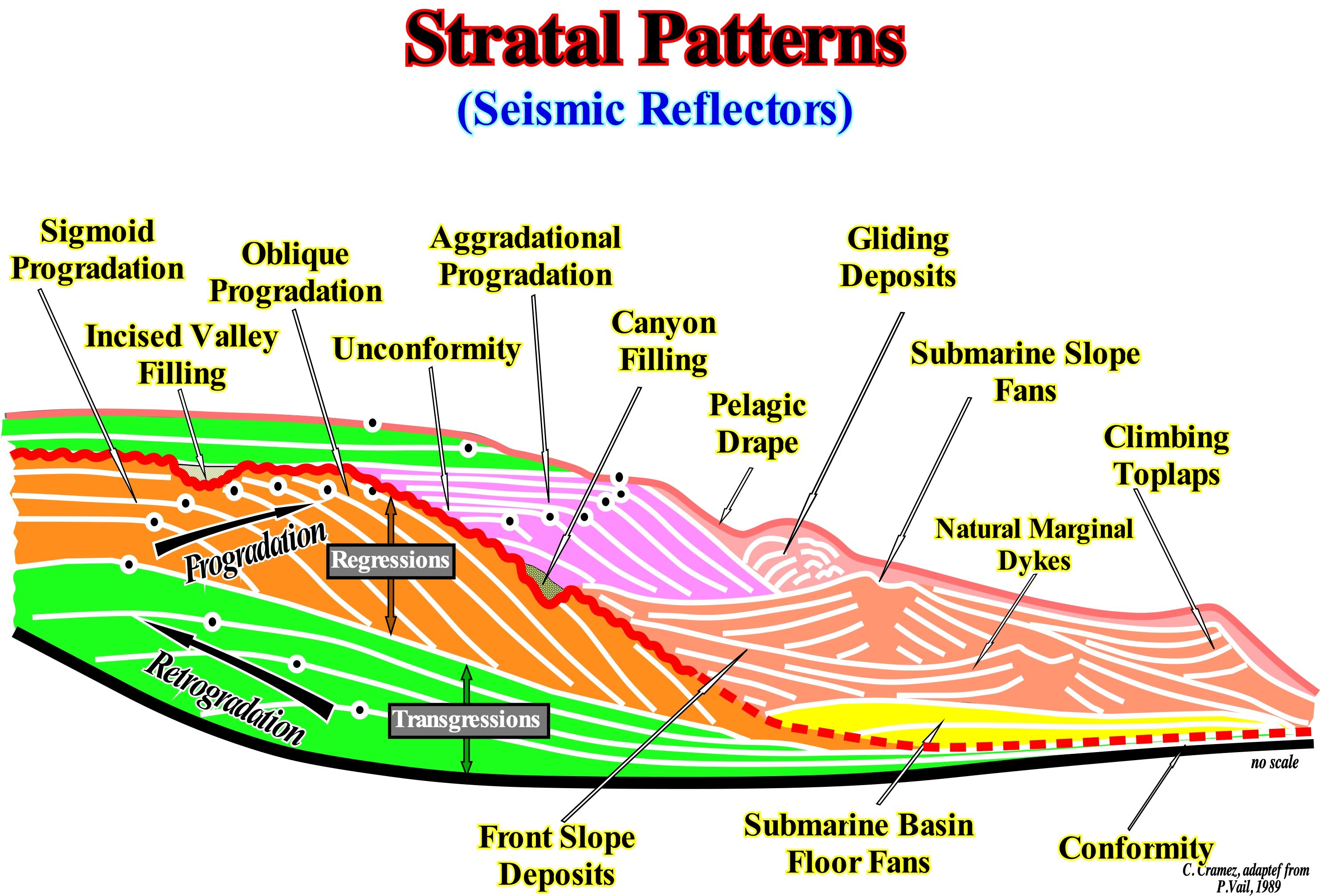 Most of the geometric configurations of the strata (or chronostratigraphic reflections) are illustrated in this sketch, in which two stratigraphic cycles called sequence-cycles (incomplete) are represented. The lower sequence-cycle is composed by the subgroups that form the highstand systems tracts group, that is, the transgressive interval (TI), coloured in green, and the highstand prograding wedge (HPW), coloured in orange. The transgressive interval (TI) which has, a retrogradational, globally, geometry is separated from the highstand prograding wedge (HPW), whose geometry is progradational, by a downlap surface. Along this surface, the hiatus due to non deposition increases seaward. These subgroups of sedimentary systems tracts are formed for sequence-paracycles induced by marine ingression (rises of the relative sea level, which is local and referenced either to the seafloor or to the base of the sediments, which is the result of the combined action of the absolute sea level or eustatic sea level, which is supposed to be global and referred to the Earth's centre and tectonics) without a relative sea level fall between them. No sedimentation occurs during marine ingression or eustatic paracycles as they are, sometime, termed, somewhat abusively, in sequential stratigraphy. The upper sequence-cycle, which is also incomplete, consists mainly of the the lowstand systems tracts subgroup of low-level sedimentary courts : (i) Submarine basin floor fans (SBFF), interval, coloured in yellow ; (ii) Submarine slope fans (SSF), light brown coloured interval and (iii) Lowstand prograding wedge (LPW), coloured in violet. A narrow transgressive interval (TI) culminates the upper sequence-cycle. The lower sequence-cycle shows, clearly, that the transgressive interval (TI) corresponds to the set of increasingly important marine ingressions and associated increasingly smaller sedimentary regressions (sequence-paracycles), which collectively create a retrogradational of the which certain geoscientists incorrectly call transgression. In fact, Cesare Emiliani (not to be confused with Emiliano Mutti) called the retrograding set of increasingly important marine ingressions and increasingly smaller sedimentary regressions, transgressions and not transgression. It could even be said that within a sequence-cycle, a 3rd order sedimentary transgression is a set of increasingly smaller 3rd order sedimentary regressions. The upper sequence-cycle, suggests that: (a) The turbiditic lobe that corresponds to the submarine basin floor fans (SBFF) has, in general, a parallel internal configuration ; (b) The natural marginal dikes (levees), which are part of the submarine slope fans (SSF), have a mounded configuration where the "gull-wings" structures are predominant (natural marginal dykes and filling of the depressions between them or submarine channels) ; (c) The lowstand prograding wedge (LPW), which by definition has a progradational geometry, fossilizes the lower unconformity of the cycle and fills the canyons associated directly or indirectly with unconformity (erosional surface) ; (d) Sliding deposits may lie at the base of the continental slope, defined by the lowstand prograding wedge ; (e) Incised valleys created by the significant relative sea level falls, responsible for the erosional surface that created the unconformity (sequence-cycle boundary), are filled by sediments from the upper part of the lowstand prograding wedge (LPW) ; (f) The transgressive interval (TI) implies and overall retrogradation of the depositional coastal break of the depositional surface (more or less the shoreline) ; and (g) sigmoid progradational are mainly frequent in the lowstand systems tracts subgroups and highstand prograding wedge (HPW), while in the submarine slope fans (LSF) complex progradations, with opposite polarity, are almost always preponderant ("gull wings" of P. Vail). The unconformity limit the sequence-cycles passes, laterally, and in depth (more or less at the level of the submarine slope fans) to the associated correlative deep-water paraconformity, on which the submarine basin floor fan (SBFF) are deposited.