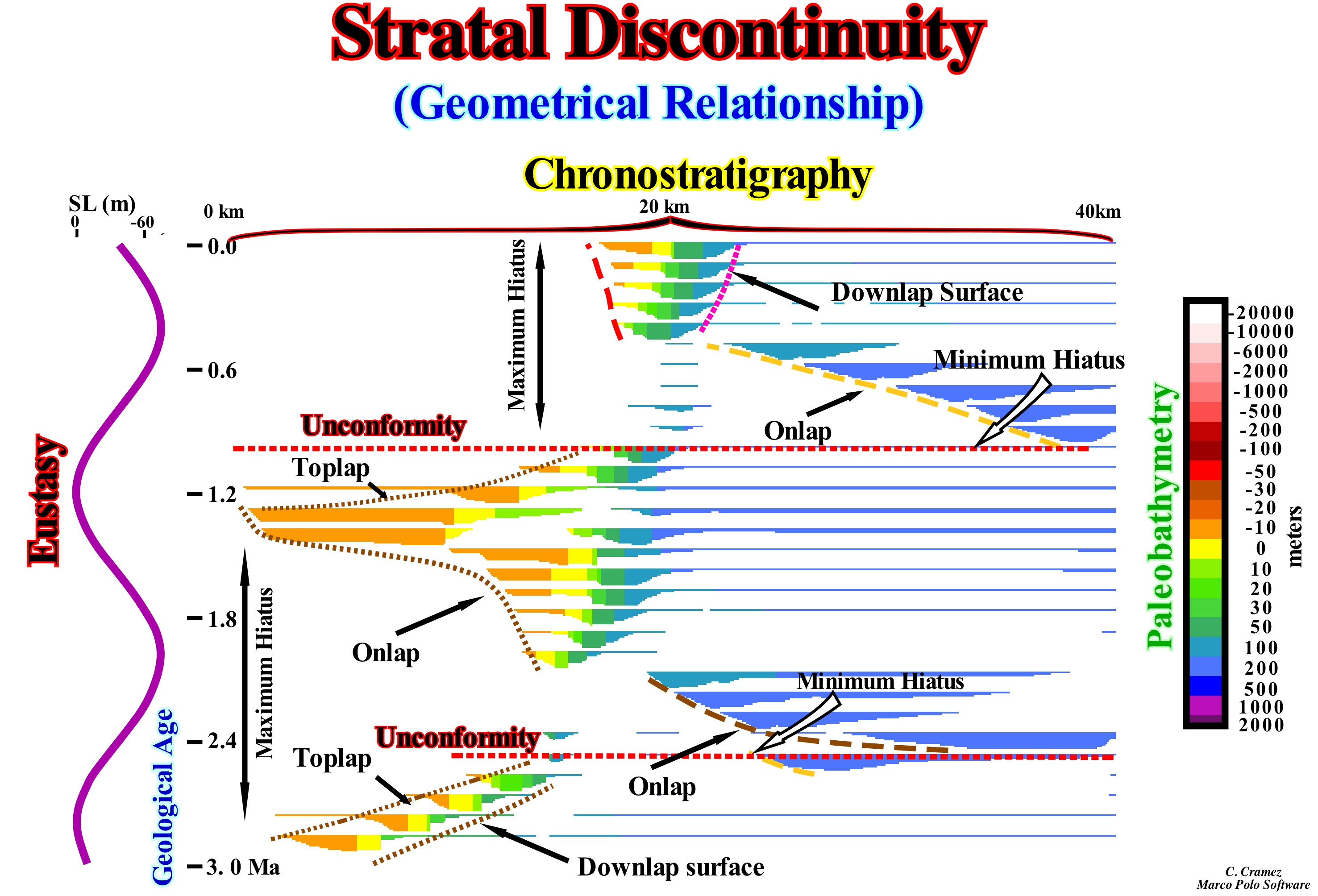 The discontinuities in the strata may be: (i) Unconformities, erosional surfaces induced by significant falls of the relative sea level*. which limit the stratigraphic cycles and, in particular, the sequence-cycles ; (ii) Disconformities** and (iii) Hiatuses by non-deposition (time intervals related to a sedimentation discontinuity due to non-deposition and/or erosion of already deposited layers). All these surfaces, when represented in a chronostratigraphic diagram, are generally composed of two subhorizontal segments separated by a slope. The age of the unconformities is given by the age of the minimum hiatus, which, in the great majority of cases, is located at the base of the slope or abyssal plain, where there is, practically, a continuity of sedimentation. The limit of a stratigraphic cycle, such as the lower boundary of a sequence-cycle, corresponds to an erosional surface (unconformity), which represents an old hiatus created by erosion (at least upstream of the basin edge). Within a sequence-cycle, a more recent hiatus than the one associated with the lower unconformity, which limits it, is generally a hiatus by no deposition. In this chronostratigraphic diagram are represented: (i) Eustasy (variations of the absolute or eustatic sea level) ; (ii) The Terminations of Reflections (lapouts) ; (iii) Stratal discontinuities, i.e., onlaps, downlaps and toplaps ; (iv) Hiatuses ; (v) Unconformities and (vi) Paleobathymetry (bathymetry of the marine environment in which the sedimentation of a particular lithological unit occurred, which characterizes the time of geological history in which it took place). The main downlap surfaces (which within the sequence cycles limit the transgressive intervals, TI, from the highstand prograding wedge, for instance) and the onlap surfaces are, easily, identified, since the first incline continentward, in this case to the left, but prograde to the right, that is, seaward. Onlap surfaces, which fossilize the unconformities, dip to the right (seaward), but encroach the continent (left). The toplaps are recognized under the unconformities, but move to the right (seaward), unlike the onlaps. The maximum and minimum hiatus are, easily, recognized, which allows a, more or less, correct dating of the unconformities (minimum gap). Paleobathymetry increases seaward (right). The onlap surfaces, in deep water, suggest submarine basin floor an slope fans. The only way to date, more or less, correctly an unconformity is to date the submarine basin floor fans associated with the relative sea level fall that caused the erosional surface (unconformity), which means that in all In other cases, the dating error is very large. A good dating of a submarine basin floor fans (SBFF) requires a well core containing the pelagic layer, which usually covers each turbidite layer, since it is the only one that can contain the fossils not only representative of the sedimentary environment, but age of deposition as well.