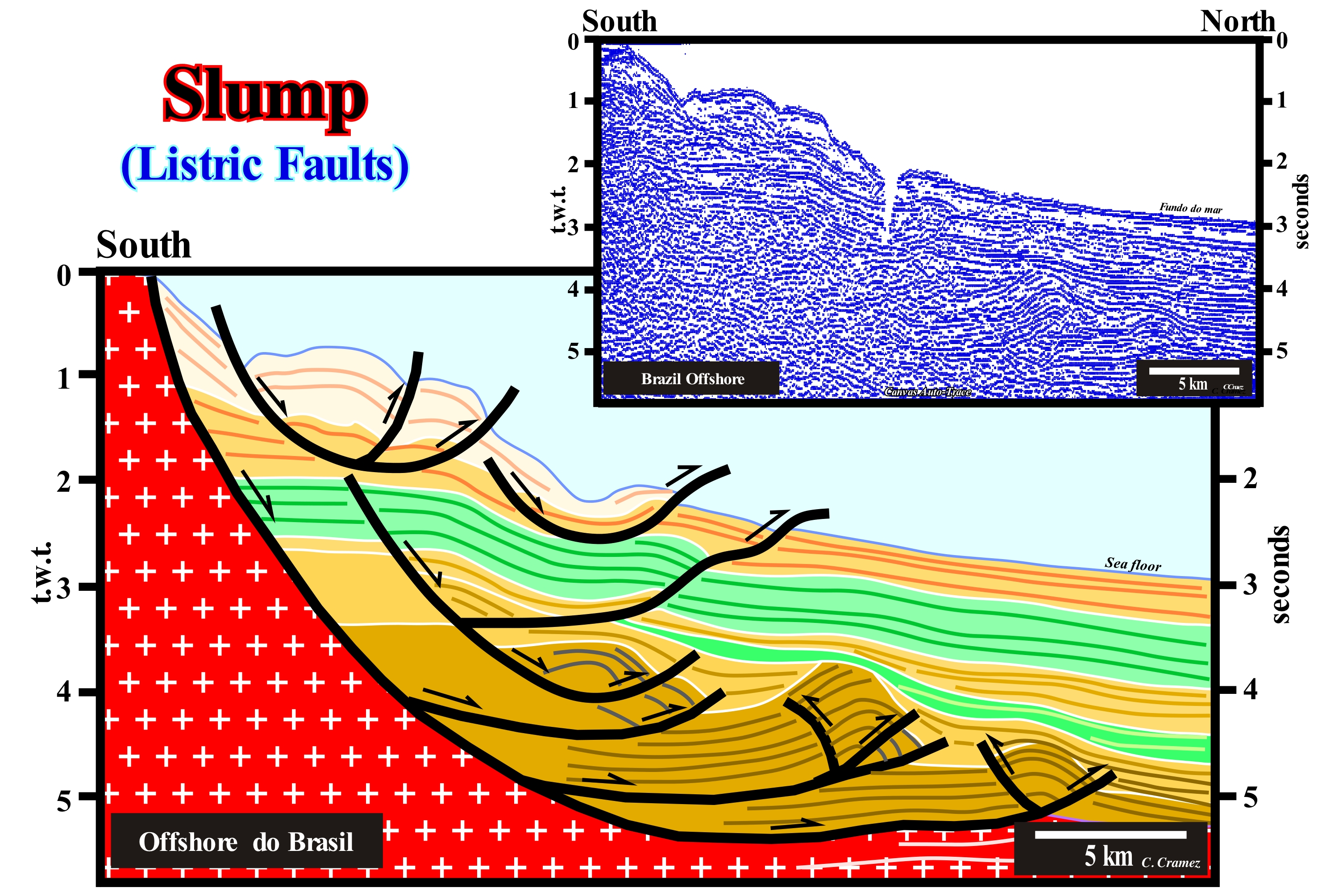 On this tentative geological interpretation of an offshore seismic line from the north Brazil (Barreirinhas offshore), the compressional structures, visible in the continental slope sediments of the lower seismic intervals, were created by a local compressive tectonic regime, defined by a particular ellipsoid of the effective stresses . This compressional regime, characterized by a horizontal σ1 (major axis of the ellipsoid), was induced as a counterpart to the gravitational landslides observed upstream and which are associated to an extensional tectonic regime defined by an oblong (σ1 vertical) ellipsoid of the effective stresses (sum of the geostatic pressure, hydrostatic pressure and the tectonic vector). The faults associated with these landslides are listric faults (from the Greek "listron" meaning "spoon"), i.e., upstream, the fault planes have a normal fault geometry (lengthening), while at the bottom, they have a reverse fault geometry (shortening). At the bottom of the fault plane, there is an excess of sediment and, to satisfy the new volume conditions (Goguel's Law), the sediments are forced to shorten (compression) forming anticline structures and/or reverse faults. In nature, there is just one way to lengthen the sediments (extensional tectonic regime). It is done by normal faults (with fault plane parallel to the ellipsoid's mean axis of effective forces, σ2). On the contrary, there are two ways in which sediments shorten, when subjected to a compressional tectonic regime. The first is the formation of anticline and syncline structures (cylindrical or conical). The second is the development of reverse faults. The folds (anticline/syncline) form first. The inverse faults are formed when the shortening produced by folding is insufficient. The formation of a compressional tectonic regime in response to an upstream extensional tectonic regime, as illustrated above, is formed just when the confining pressure is weak, which means that from a certain depth of burial (under a large sediment thickness), their formation is unlikely.