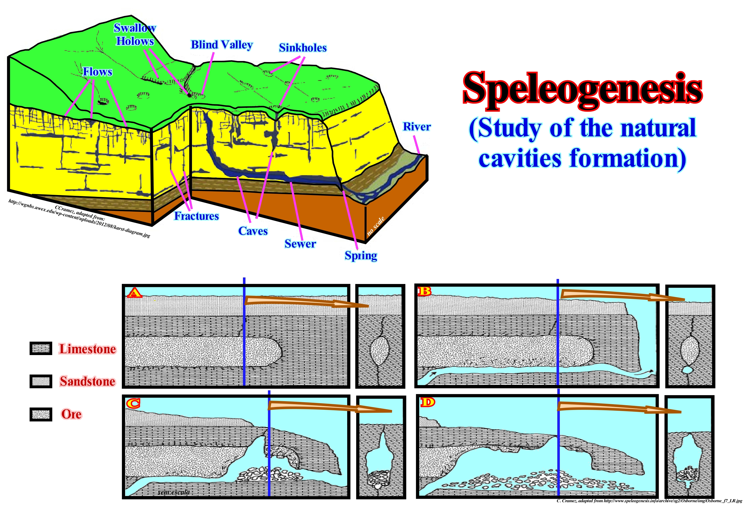 Several mechanisms of formation of a sinkhole are possible: (i) Gradual removal of the soluble parts of a rock (usually limestones) by infiltration of water ; (ii) Collapse of the roof of a cave ; (iii) Lowering of the water table (level at which water pressure equals atmospheric pressure), etc. Sometimes, under the opening of a sinkhole you can find a cave, and even rivers such as the Cedar sinkhole (National Park, USA). Sinkholes are often associated with karstic morphologies. In such regions, there may be hundreds or even thousands of sinkholes in relatively small areas such that the surface of the terrain is, totally, altered and no water stream is possible on the surface since all water flows in depth. Over time, the caves in the limestones increase in volume, the ceilings collapse forming sinkholes. These form very quickly and can have catastrophic consequences, destroying homes, cars, and other properties. Sinkholes are found very often in the Jura Mountains, as well as in Florida and, as illustrated in this photograph, also in the north of Spain. When the aquifers are shallow, sometimes, the sinkholes are filled with water and form lakes whose dimensions may be important. Unfortunately for centuries, sinkholes have been used to store garbage, which has, obviously, polluted groundwater and has very serious consequences for the health of the populations living in the affected regions. The sinkholes can be buried in the aquifer systems and fossilized by sediments, when the pressure of the aquifers helps to stabilize the sediment cover. However, if water is pumped for urban uses or irrigation, which often happens, the sinkholes reappear once the water table falls. The sinkholes that form on reefs and coral islands, which have great depths, are the "blue holes" of the divers.