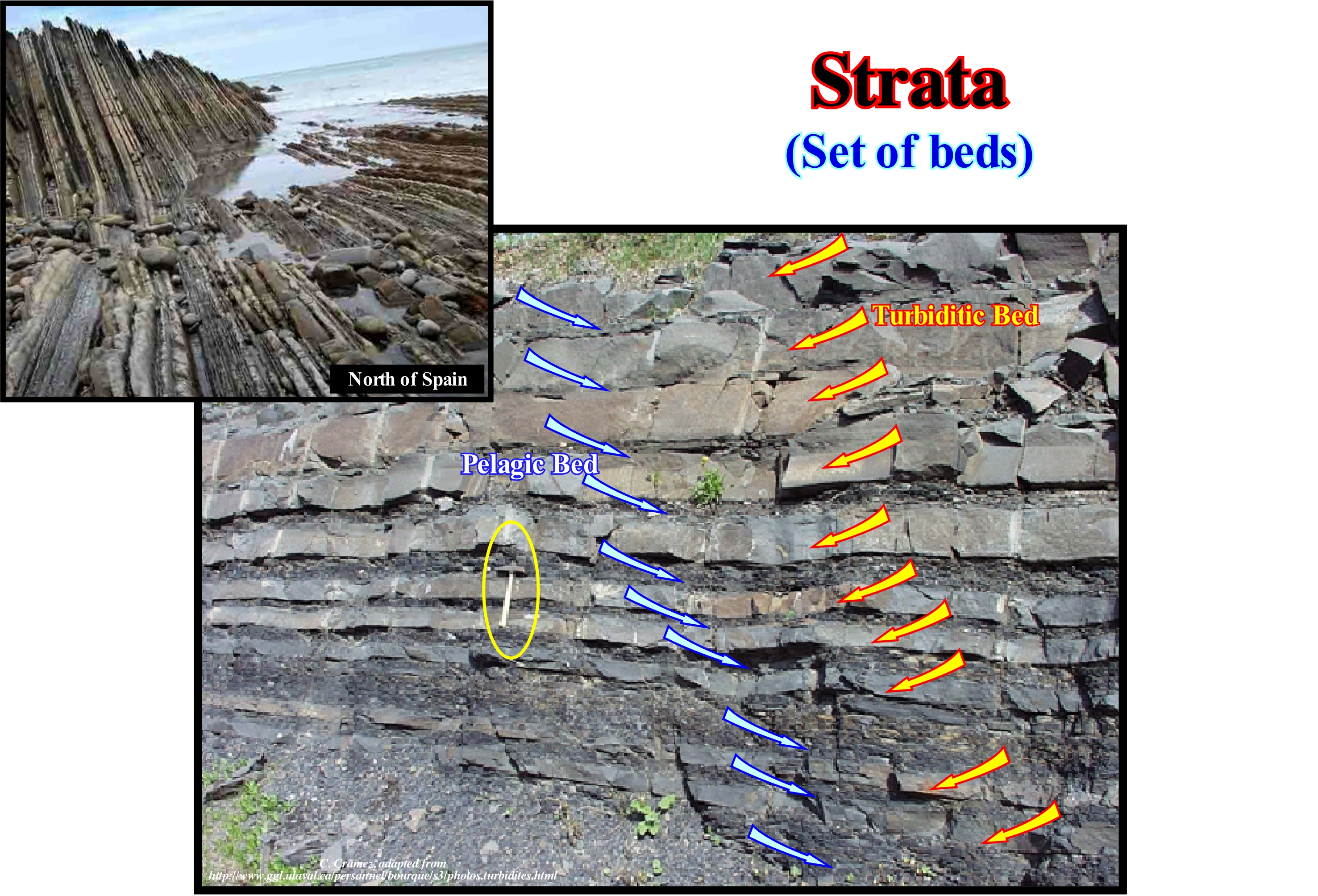 The beds of the sedimentary rocks are, in most cases, arranged in packets of similar strata superimposed between them. These bundles or packages are, more or less, distinguished by the lithology (limestone, sand, clay, etc.) and by the organization of strata (beds, more or less thin, alternating with others of different lithology) from the underlying packages (previous) or overlying packages (more recent). Such a set of layers of decametric thickness is called a set of beds (or strata), which are nothing else, than portions of packages of greater thickness (hectometre), which are called formations. The geological formations themselves oppose (by the nature of the rock and organization in strata) the neighbouring formations of the sedimentary column. The name of the formations, which is given to the successive bundles of strata, comes from the change of appearance of the layers, which differentiate them which is linked to a modification of the sedimentary deposition process. These changes are due to changes in the nature of the deposited rock ("facies *"), or in strata (stratonomy) or both (these groups of characters also serve as the basis for the definition of the different categories of formations). The stacking of the sedimentary layers of a region usually involves the stacking of several formations, which differ from one another by these two types of characteristics ("facies" and "Stratonomy"). The formations are often identifiable in the landscape due to the different influence they have on the relief and vegetation. Each formation has a name that is usually taken from the locale where it is well represented. In this photograph, each bed (stratum) represents a turbidite deposit, that is to say, the deposit of a turbiditic current The turbidites are formed of sand. The shaly beds between each of the sandy beds represent the fine material (shaly), which was deposited by decantation between each turbidite bed. A turbidite is deposited instantaneously, that is, in some hours, while shaly deposits represent deposition times of hundreds or thousands of years.
