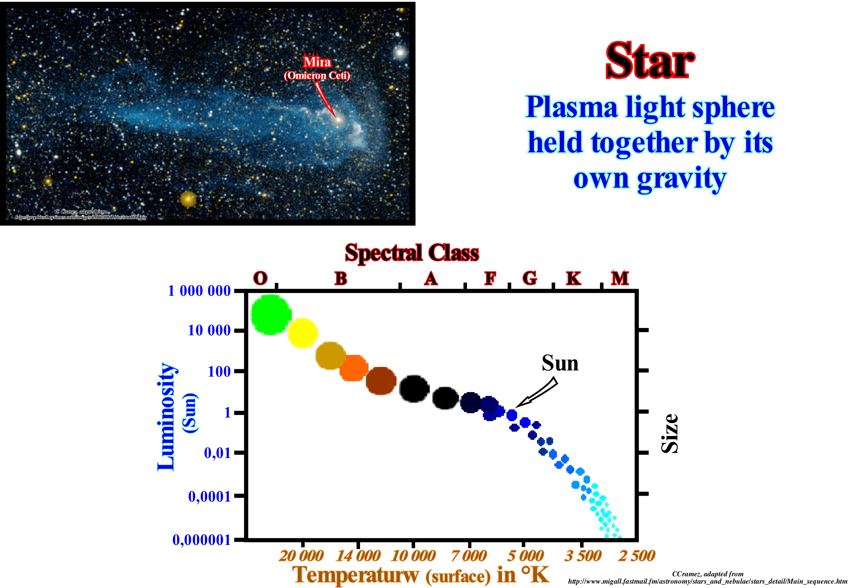 A star is a sphere of gas composed of 98% of hydrogen and of helium, and of 2% of heavy elements, which equilibrates under the action of equal and opposite forces: (i) The force of gravity, which compresses and (ii) The force of the radiation produced by nuclear reactions in the central part, which tends to blow it up. The sun has a mass of 2 x 10 33 grams and the masses of stars can vary between 0.1 and 100 times the Sun' mass. Stars form collisional systems composed of atoms and galaxies of self-gravitating star systems (evolving in their own field of gravity) consisting of stars, strictly non-colliding. A star turns on itself, more or less quickly. The sun, for example, makes a turn on itself in about a month. About 3,000 stars are visible to the unaided eye on a clear moonless night. About 100,000 stars can be seen using a small telescope. There are an estimated one hundred billion (100,000,000,000) stars in our own Milky Way galaxy, although some estimates range up to four times that many, much depending on the number of brown dwarfs and other very dim stars. A typical galaxy may contain anywhere between about ten million and one trillion stars*. Therefore, using a very rough estimate of a hundred billion galaxies in the observable universe, and the number of stars in our own galaxy as a reasonable average, there may be around ten billion trillion ( 1022) stars in the observable universe, or quite possibly anywhere up to 1024. (https://www.physicsoftheuniverse.com/how-many-stars-are-there.html) The photograph illustrated in this figure accompanied the announcement of the astronomers surprise when they discovered (Washington, August 15, 2007), that the Mira giant red star, which travels through the Milky Way with a velocity of about 130 km/s, has a turbulent tail (like a comet), which is more than trillion km long carbon, oxygen and other elements important for the formation of new stars, planets and life. This star was already known to astronomers of the seventeenth century (discovered in 1596 by David Fabricius), who called it Omicron Ceti (Whale) or Mira, for its characteristic of changing brightness every 11 months. At present, it is the reference of a whole class of stars, since, as stated above, modern astronomers have discovered that it has a huge tail, like that of comets, whose length is equivalent to 13 light years. This discovery was made using the ultraviolet images of the GALEX satellite ("Galaxy Evolution Express"). Astronomers think billions of years ago the star Mira was similar to the Sun. However, over time, it began to swell and became a variable giant red, which becomes, periodically, bright enough to be seen by the eye naked. Its size has increased 600 times in relation to the Sun and it is pulsating (losing a large amount of surface material). The fluorescence** of ultraviolet light suggests that the tail material of this giant star travels at a speed of about 130 km per second. The amount of material forming the tail is estimated to be about 3,000 times the mass of the Earth. About 400 light years from the constellation of the Whale, the star Mira is currently not very bright to be seen with the naked eye, but it will be visible again soon. About eighty-five percent of the stars generate energy by fusing hydrogen in their nuclei. Stars with more hydrogen in their nuclei fuse it faster and shine brighter. When the size or brightness of these stars are plotted against their spectral temperature or class, they align perfectly. These stars are called Main Sequence Stars. Geoscientists use a sequence of letters to organize stars into temperature or spectral classes: O, B, A, F, G, K, M. Type O stars are the hottest, brightest, and shortest. M-type stars are cooler, weaker, and live longer.