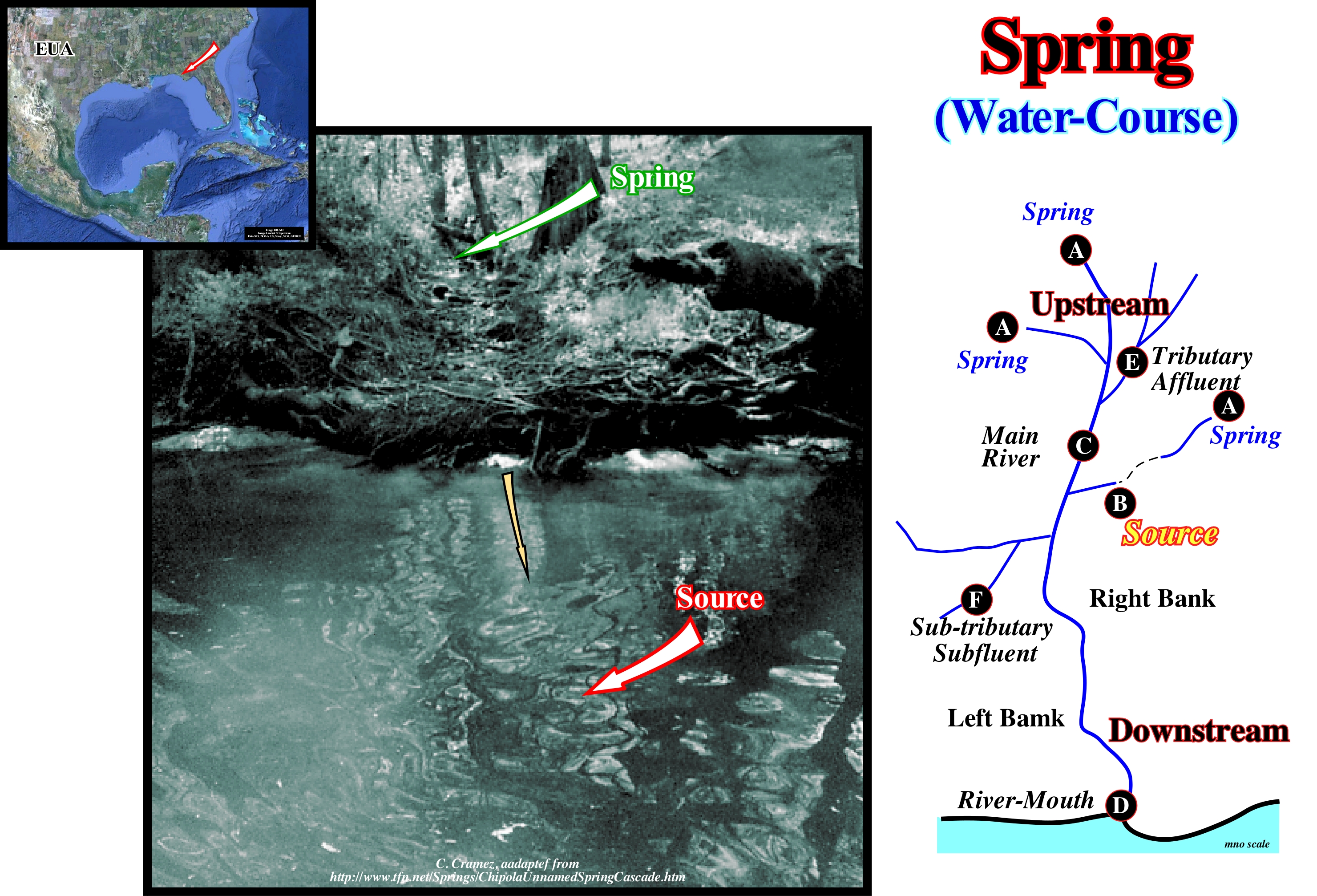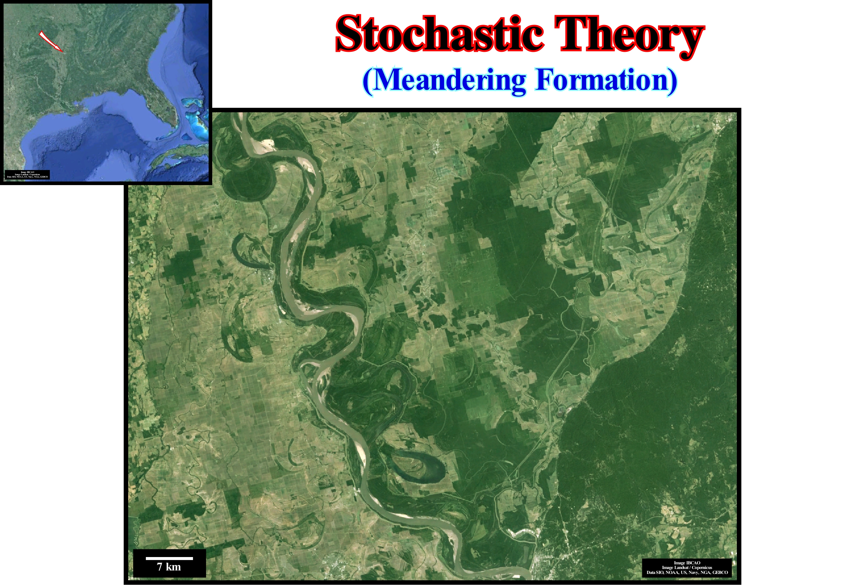 A meander is a sharp curve of a river that runs in its alluvial plain and that changes shape and position with variations of greater or lesser energy and fluvial load during the seasons. The meanders are frequent in alluvial plains, but occur more narrowly, in other conditions as on horizontal sedimentary terrain (valley meanders). The channel of the river, constantly,, changes position along the alluvial plain, through a, more or less, continuous process of erosion and deposition along its banks, which is why the meander is often called a wandering meander. The outer margin of a meander (the centrifugal margin of the stream) presents ravines that are, progressively, eroded. In the inner margin deposition, mainly, of sand occurs. This process accentuates the curvature of the meander that forms, eventually, an entire loop creating a truncation at a point where the fluvial stream begins to flow, leaving the old meander abandoned and closed with a U-shaped lake. Three theories have been advanced to explain the formation of meanders: (i) Stochastic Theory ; (ii) Equilibrium Theory and (iii) Geomorphological or Morphothectonic Theory. According to stochastic theory, as its name suggests, a meander is interpreted as the result of occasional fluctuations, in the direction and direction of the runoff, due to the presence of obstacles in the riverbed. This theory is based on the fact that given an artificial, flat and sloping surface, rains run on slides, but even then, the adhesion of the water to the surface and the cohesion of the droplets produce fillets in a random manner. The natural surfaces are rough and eroded. The result of all physical factors, which act at random, are non-rectilinear channels, which become, progressively, sinuous. In equilibrium theory, the meanders decrease until the current gradient strikes a balance between soil erosion and current carrying capacity (both water and deposits). A descending mass of water must renounce the potential energy it had, since it has the same velocity at the end as at the beginning. It is eliminated by interaction with the bedding material. The shortest distance, that is, a straight-line channel, gives the highest energy results per unit length, which further changes the channels, creating more sediment and the liking of the stream (silting). The presence of meanders along the course allows adjusting the length to achieve an energy balance per unit length at which the current carries all the sediment it produces. Finally, in Morphotectonic theory, the tectonic structures of the terrain, especially the folds and faults, are the main responsible for the formation of the meanders. The percentage of meanders or sinuosity index of a watercourse is a way of quantifying the amount of intricacies of a river or any other watercourse (https://en.wikipedia.org/wiki/Meander). This index is calculated by dividing the length of the water course by the length of the valley. A perfectly rectilinear river has a sinuosity index of 1, which means that the length of the river is equal to the length of its valley. The higher the index (> 1) the more sinuosity or meanders the river has. The sinuosity index is calculated from a map or aerial photograph, measuring the distance between two points below (reach), which must be at least 20 times the average channel width. The length of the current is given by the thalweg, the length plus the range (length of the valley below), while the lowest value of the ratio is the length is below (air distance between the two points that determine the range). The sinuosity index plays a role in the mathematical descriptions of watercourses. The sinuosity index can be precise, since the valley (not the river) does not always have meanders; for example, the length of the valley below is not identical to the range. In this case, the valley index is the valley meander ratio, while the channel index is the meander channel ratio. The sinuosity index of the channel is the length of the channel divided by the length of the valley and the standard sinuosity index is the index of the channel divided by the index vale. Distinctions can become even more subtle. The sinuosity index also has a non-mathematical utility. Water-courses can be classified into categories according to these indices; for example, when the index is between 1 and 1.5 river is winding, but if the index is 1.5 and 4 the river has meanders. The index is a measure of water velocity and sediment load, which will be maximum when the index is 1 (rectilinear water-course).