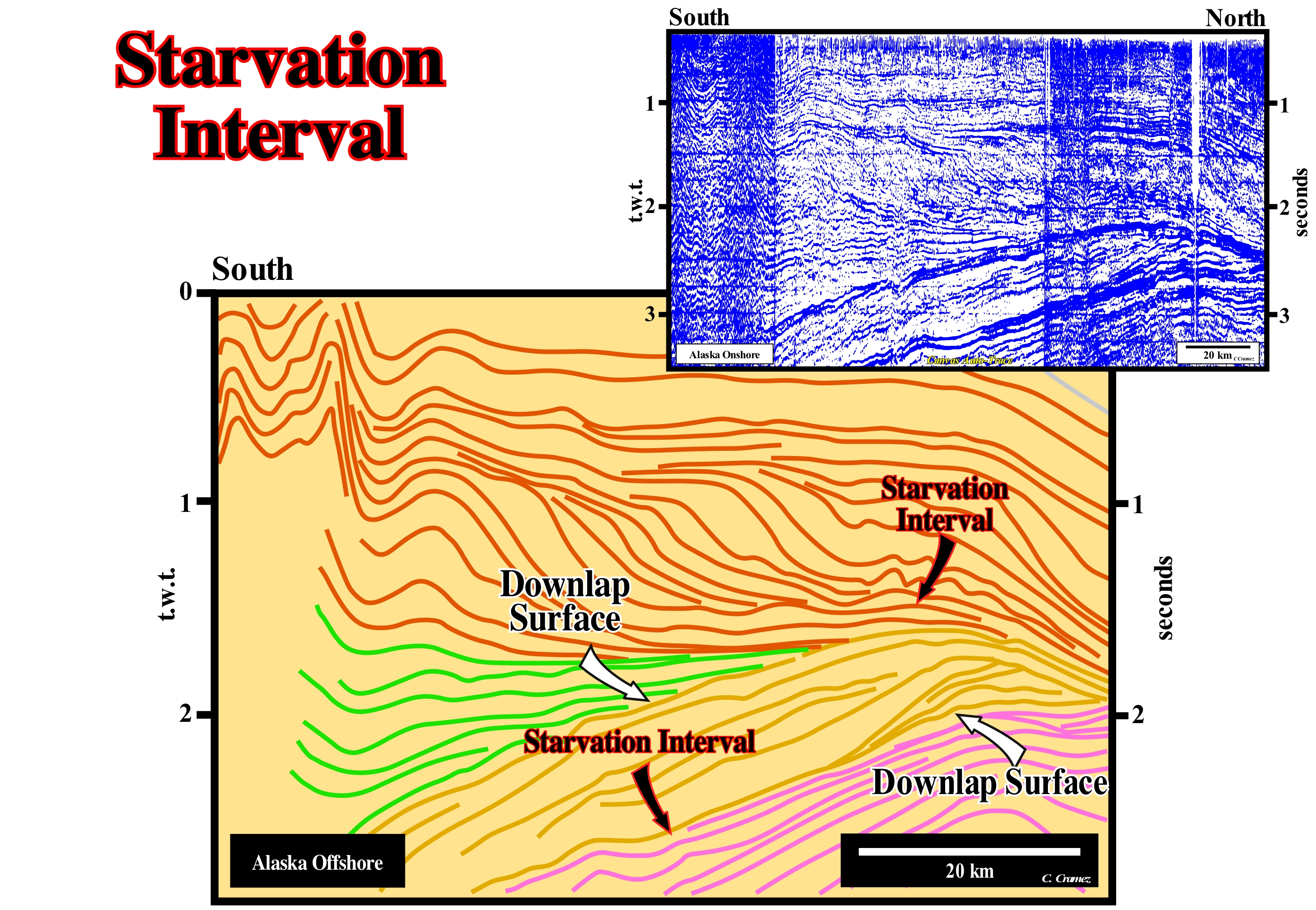 On this tentative geological interpretation of a Canvas auto-trace of an Alaska regional seismic line, two downlap surfaces, which dip in opposite directions, are very noticeable. They are defined by downlaps with opposite polarity (vergence) and characterize a condensed stratigraphic interval, whose condensation increases basinward. The downlap surface, along which the downlaps are oriented southward (condensation and hiatus increase) suggests an old continent to the north and an ocean to the south. On the contrary, the upper downlap surface and the progradations that define it have a northward polarity, which suggests an old continent to the South and an ocean to the North. It may be said that this tentative interpretation illustrates the collision between two continental divergent Atlantic-type margins (formed in a geological, globally, extensional context, that is, in association with the formation of new oceanic crust and outside of the Mesozoic/Cenozoic megasuture) or, in other words, a collision between two continents. In this particular case, the sea between the continental masses was the Cretaceous Interior Sea (Niobraran Sea or Inner Sea of North America). This sea was created when the Pacific and North American plates collided (Farallon plate subduction under the North American plate during the Cretaceous), creating the Rocky Mountains to the West. As during the Cretaceous, globally, absolute (eustatic) sea level (global sea level referenced to the Earth's centre) was high, waters of the north (Arctic Ocean) and the South (Gulf of Mexico) joined in the lowlands of the continent, forming a Niobraran sea that grew and decreased along the Cretaceous. This large inland sea that existed during the Middle Cretaceous and Terminal period, as well as, Early Paleogene, divided the North American continent into two land masses, Laramidia (West) and Appalachia (East). The first phase of the development of the Niobraran Sea began in the Middle Cretaceous, when the sea rose creating an arm of the Arctic Ocean that connected the West with North America, which created the Mowry Sea. In the south, the Gulf of Mexico, which was an extension of the Tethys Sea, merged with the Mowry Sea during the late Cretaceous to completely form the inland sea of North America (Niobraran). At its height, this sea stretched from the rocky mountains to the Appalachians (its width reached about 1,000 km for a length of 3,300 km) with a depth of 800-900 meters. At the end of the Cretaceous, the continuous survey of land has shrunk the sea which in the long run has completely withdrawn. This collision not only completely closed the ocean, which separated the divergent margins, but also produced a significant sedimentary shortening. The term collision used here has nothing to do with the transformation of kinetic or kinematic energy into deformation energy, as, for example, when a car strikes a wall. In the theory of plate tectonics, kinetic energy plays no role. Sediment deformation is not associated with any type of shortening. It is, above all, the loss of resistance to the deformation of the sediments in certain zones of the lithospheric plates that induces the deformation. In other words, sediment deformation under the action of tectonic forces affecting the entire lithospheric plate occurs when, locally, the sediments lose resistance to deformation either by a local increase in temperature or by a local increase in pressure. As suggested on this tentative interpretation, shortening seems more important in the overriding lithospheric plate (divergent margin located in the South) than in the descending (plunging) lithospheric plate. The identification and depth of the condensed intervals is very important in petroleum exploration, since they suggest the most likely location of the marine source-rocks. This tentative suggests that, in this region, there are, certainly, two levels of potential marine source-rocks, with different maturation of organic matter. The organic matter of the potential source-rocks of the lower level, probably, reach the oil window, which is, certainly, not the case for the organic matter of the potential source rocks associated with the base surface of the upper progradations.