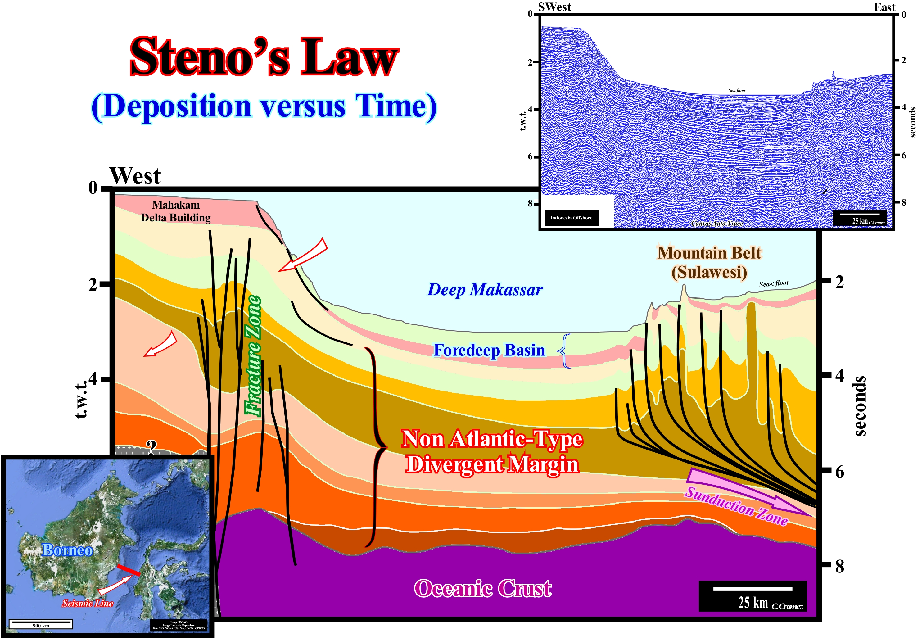 Steno's law implies that most sediments settle down, more or less, horizontally (Principle of original horizontality of Steno). Normally, when the sedimentary rocks are tilted, they are not in their original position. They were either elongated, by a tectonic regime in extension (formation of normal faults), or shortened, by a compressional tectonic regime (formation of folds and inverse faults). As illustrated in this tentative interpretation of a Canvas auto-trace of a regional seismic line across the Strait of Makassar (between the island of Borneo and the Celebes islands), it is clear that the law of original horizontality must be applied very carefully, even taking into account of the seismic pitfall introduced by the lateral variation of the water depth (the seismic waves travel more slowly in the water than in the sediments). Along all chronostratigraphic lines or along all deposition surfaces there are at least four slope breaks: (i) Bayline Break*, between alluvial and fluvial sediments ; (ii) Depositional Coastal Break, more or less, corresponding to the shoreline (mainly in the seismic line due to seismic resolution), which is located between the sediments of the coastal/deltaic plain and the prodelta ; (iii) Continental Edge Break (upper slope of the continental slope) between the sediments of the platform and the continental slope, which may or may not coincide with the basin edge(depending on whether the basin has a continental shelf or not and (iv) Basal Continental Slope Break between continental slope and abyssal. The clastic sediments of the prodelta and the continental slope do not settle horizontally, but with a certain inclination (generally between 1-3°) basinward. Presently, sequential stratigraphy tells us that within a sequence-paracycle sediments always have a progradational geometry, since during the stability period of relative sea level following a relative sea level rise (eustatic paracycle), the shoreline moves seaward. On this tentative interpretation, in the area of the Mahakam building delta, the eastward slopes of the sediments underlying the foreland basin are original, that is, they are contemporaneous with sedimentation. The sediments correspond to continental slope deposits. On the contrary, in the Sulawesi mountain belt, the dip of the sediments are posterior to the deposition. They result from the shortening, which continues today, as compressional structures affect the sea floor. Note that the Mahakam building delta is a stacking of deltas, whose thickness varies between 30 and 50 m. Do not confuse the continental slope bordering the continental edge with a prodelta. Seismically, at the level of sequence-cycle (prior to the melting of the Quaternary glacial caps and glaciers) the basin had no continental shelf and the shoreline coincided with the continental edge as far as the proceeds arrived. On the geological interpretation of seismic lines, in addition to Steno's law, other law or geological principles must always be used: (a) The Goguel's law, which says during deformation, the volume of sediment remains, more or less, constant (this law is approximate since it accounts for the volume reduction induced by the decrease in porosity in depth and by the dissolution phenomena which can in some cases reach about 30% of the total volume ; ( b) the J. Walther's law, that says that in continuity of sedimentation, a lateral succession of depositional systems is also vertically, that is to say, if laterally, seaward, is the sequence a, b, c, vertically, and from the bottom up, there will be c, b, a ; (c) Original Horizontality Principle, which says that the sedimentary layers are deposited horizontally ; (d) Original Continuity Lateral Principle, according which sedimentary layers deposited in lateral continuity pinchout or terminate by downlapping or onlapping against the edges of the original deposition sectors ; (e) Intrusion Principle, which says that the relative age between two igneous rocks, or between an igneous rock and a sedimentary rock, can be deduced by the geometrical relations between them: "An intrusive igneous rock is younger than it penetrates" ; (f) Ochkam principle, which says that plurality should not be invoked without necessity ("Pluritas non est ponenda sine necessitate"), etc., etc.