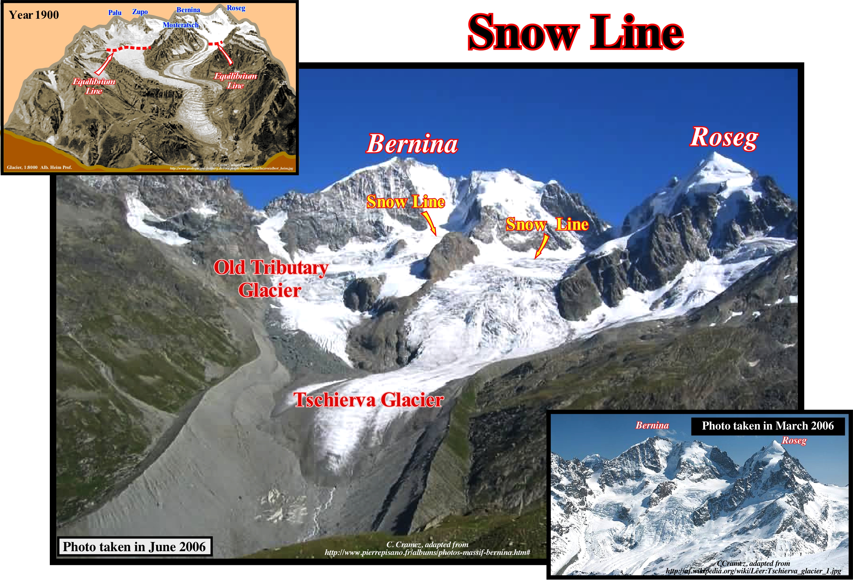 The smaller picture, taken in the French Alps, confirms the conjecture advanced by many geoscientists that a large part of the slopes are made up of a mixture of, relatively, large rock fragments and much finer sedimentary material, which certain geoscientists call taluvium. In this particular case, the rock fragments show a convergence to the base slope along gutters or drains that, deeply, furrowed the rocks (in this case limestone), which form the mountain slope. Sedimentary particles and rock fragments are, largely, transported by water, both during periods of heavy rainfall and during snow melting, when water flows along the slopes is frequent. In this image (Digne's Tableau in the French Alps, http://www.lmgc.univ-montp2.fr/MIDI/gal_alfredo/main2.html), it is important to note the uniform slope constructed by the granular deposits whose dip is close to the internal friction angle of the granular material (when wet). The main morphological characteristics of this slope type are: (i) The scar (upper arrow), which is the upper area where failure began and is the source of almost all sedimentary particles ; (ii) The carpet or slope, which is a long and relatively narrow row formed of rock debris in direction of the slope base (middle arrow) and (iii) The accumulation zone, which is located at the base of the slope and which is, more or less, connected with a secondary drainage channel. As can be seen also in this photograph: (a) The slides and flow of the material prevent the growth of vegetation along the slope ; (b) Limestone blocks, which are more resistant to erosion than shales or conglomerates, stabilize the overlying rocks constituting an obstacle to the sliding of material from the top of the slope, i.e., from the scar and (c) The active slope, which is located along a track, where the limestone blocks have been eroded or are missing. The rest angle of the rock particles and fragments, which make up the slope, corresponds to the maximum dip angle that the slope can have. In general, it is about 30° and, as stated before, this angle is, more or less, constant along the carpet of taluvium (or talus). Similarly, on the northern slopes of the Valais Alps (Rhone valley, not far from the town of Sierre, in Switzerland) the three zones that make up an alluvial or dejection fan (alluvial fan, i.e., deposit of detrital material, poorly selected and poorly worked, which forms at the foot of the mountains where the thalweg of the valleys find a flatter area), that is to say, the scar, the slope and the zone of accumulation are, easily, recognized. A huge debris flow activity occurs in the fans of the accumulation zones. Thus, for instance in the famous Loesch slope, in the Swiss Alps, not far from the fan illustrated in this figure, geoscientists* were able to evaluate the activity of the debris flows from the study of growth ring disturbances ** of centenary trees, which provide a complete record of past geological events and deposition phases in the accumulation zone. In fact they studied about 2,200 samples of tree growth rings, mainly Larix decidua Mill., Picea abies (L.) Karst and Pinus cembra asp., which allowed the reconstruction of 123 events since the sixteenth century (more or less, since 1566). The geomorphic mapping allowed the identification of 769 events related to old debris flow in the intermediate fan. Inventoried geological events (in an area of about 32 hectares) include 291 fans, 465 natural marginal dykes (levees) and 13 debris flow channels fills. At the base of more or less disturbed growth ring records, almost 86% of the fans identified on the current surface could be dated. Most of the dated material was deposited during the 20th century. Signs of events prior to the 20th century are often recognized in the surviving growth rings, but the material that caused the growth anomaly in trees has been completely replaced or eroded by more recent debris flow activity.