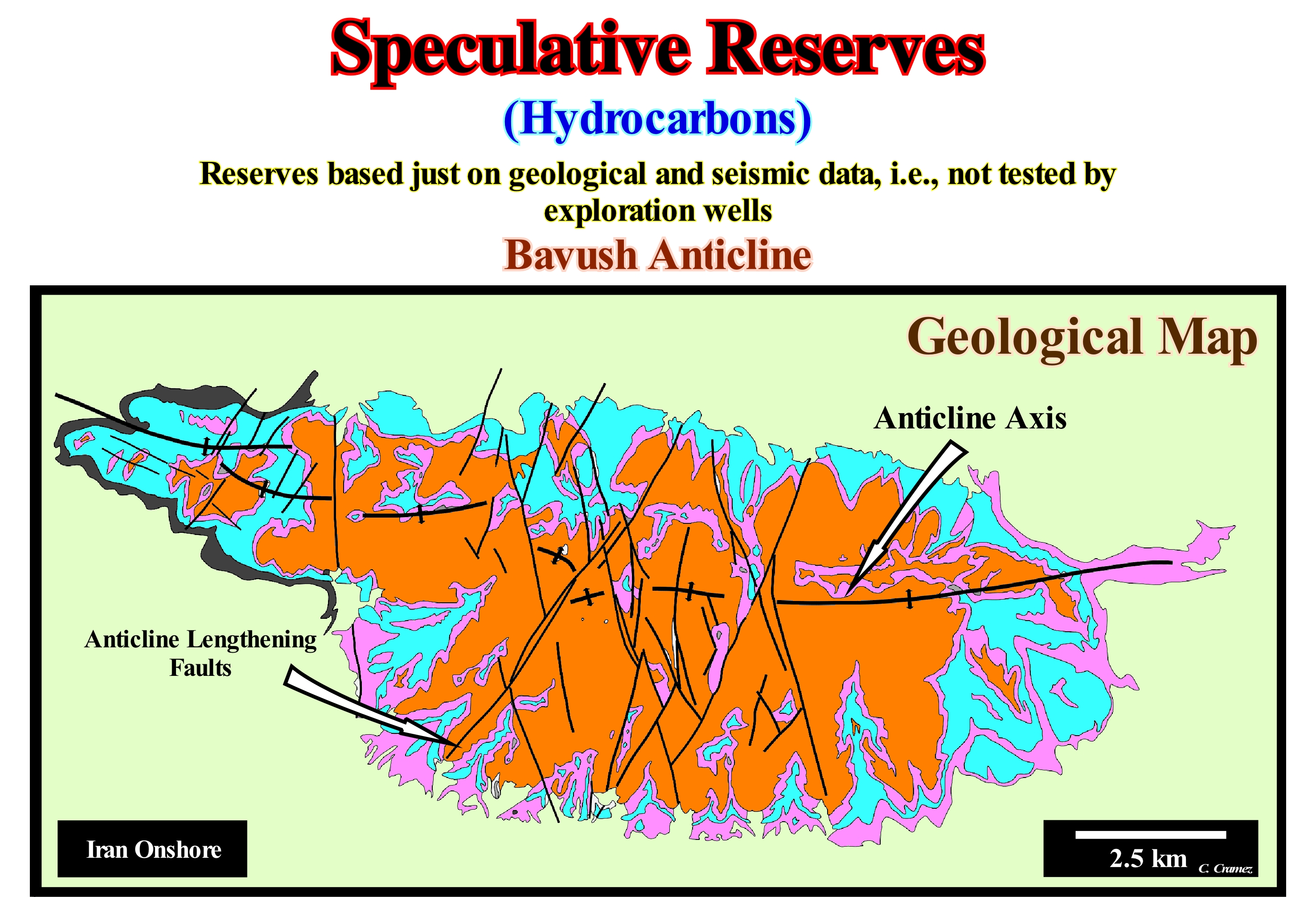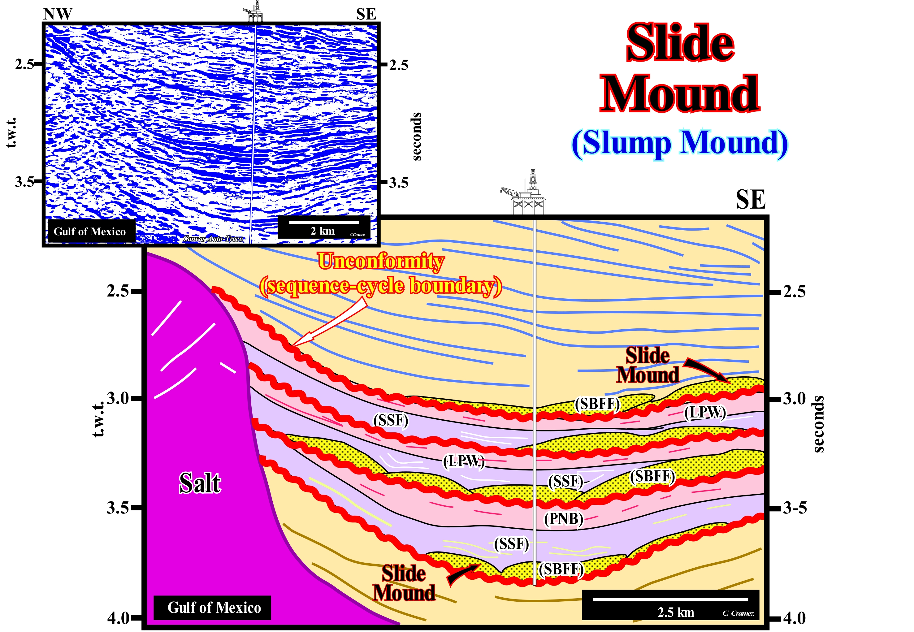 On this tentative geological interpretation of a Canvas auto-trace of detail of a Gulf of Mexico in seismic, where saliferous structures are frequent, a series of sliding mounds can be observed, in particular, in the so-called "minibasins", which are almost always surrounded by salt domes. The salt dome, which form due to the relative buoyancy of the salt when buried beneath other types of rocks, are mushroom-shaped rather than cylindrical-shaped structures, as many think (cylindrical shape is physical impossibility, since salt density is constant in depth, which is not the case for sediments), which have, generally, an overlying sealing rock. As can be seen from this tentative interpretation, these anomalies fossilize, partially, the lower limits of the sequence-cycles, that is, the deep-water correlative paraconformity of the unconformity visible upstream. These unconformities are, generally, readily recognized by the lapouts of the underlying and overlying reflectors, but also by the presence of submarine canyon fillings and incised valley fillings. Probably, the sliding mounds on this tentative interpretation correspond to submarine basin floor fans (SBFF) deposited in small basins created by the compensatory subsidence that accompanies the total or partial expulsion of the salt from the underlying salt horizon. These small basins are, generally, surrounded on all sides by either salt domes or salt walls (elongated, discordant diapiric salt structures, which form, generally, sinuous, more or less, parallel alignments). If the salt of the central part of a large and thick saliferous horizon, such as a salt mantle, begins to flow laterally, a great depression forms in the suprasalt sediments. It is in this type of depressions or basins of this type (denominated expulsion salt basins or evacuation salt basins), that form the slump anomalies illustrated on this tentative. In terms of sequential stratigraphy, it can be said that these anomalies may be associated with falls of the relative sea level (local sea level, referenced to base of the sediments or to the sea floor) induced by the combined action of absolute (eustatic) sea level (supposed global and referenced to the Earth's centre of the Earth) and by the diapiric uplift of certain parts of the salt horizon (P. Vail's turbidite depositional model). Although, the turbidite currents induced by slumps and instability failures developed under highstand geological conditions (E. Mutti's turbidite depositional model) can not be excluded. It is possible the vertical and upward movements induced by the diapirism* of deeper rocks have destabilized the sediments of the salt expulsion basins, and that the sediments have slipped, by turbidity currents, to the central part of the basin. In this example, the sequence-cycles, delimited between the red horizons (sequence boundaries that may be unconformities or correlative deep-water paraconformities), are incomplete. Highstand systems tracts groups (HSTG) were not deposited. The transgressive intervals (TI) and the highstand prograding wedges (HPW) are absent. Only the sediments of the lowstand systems tracts group (LSTG) were deposited. However, the three lowstand sub-groups are all represented. From bottom to top are recognized: (i) Submarine Basin Floor Fans (SBFF) ; (ii) Submarine Slope Fans (SSF) and (iii) Lowstand Prograding Wedge (LPW). The submarine basin floor fans (SBFF), coloured in khaki, have a mound configuration. The submarine slope fans (SSF), coloured in violet, have a wavy configuration with a "gull-wings" geometry (a central depression flanked by two fusiform bodies). The lowstand prograding wedge (LPW), coloured in pink, has an apparent parallel configuration, since, on perpendicular seismic lines, the internal configuration is progradational. In certain cases, due to salt conditions, in this type of basin, sliding mounds may also be associated with submarine slope fans (SSF).