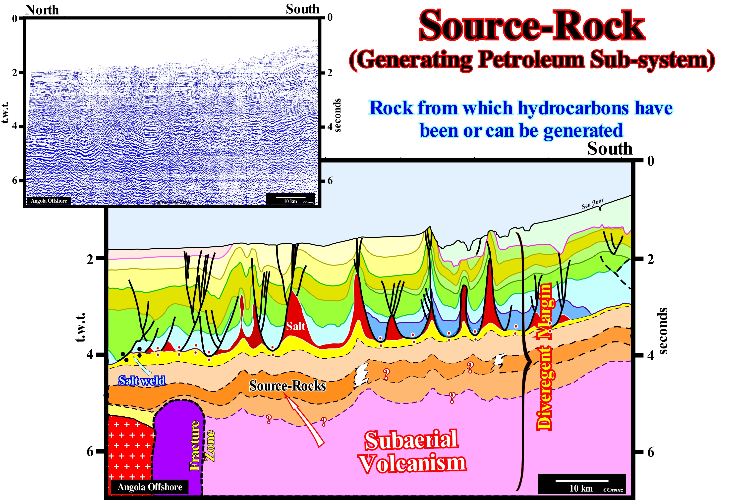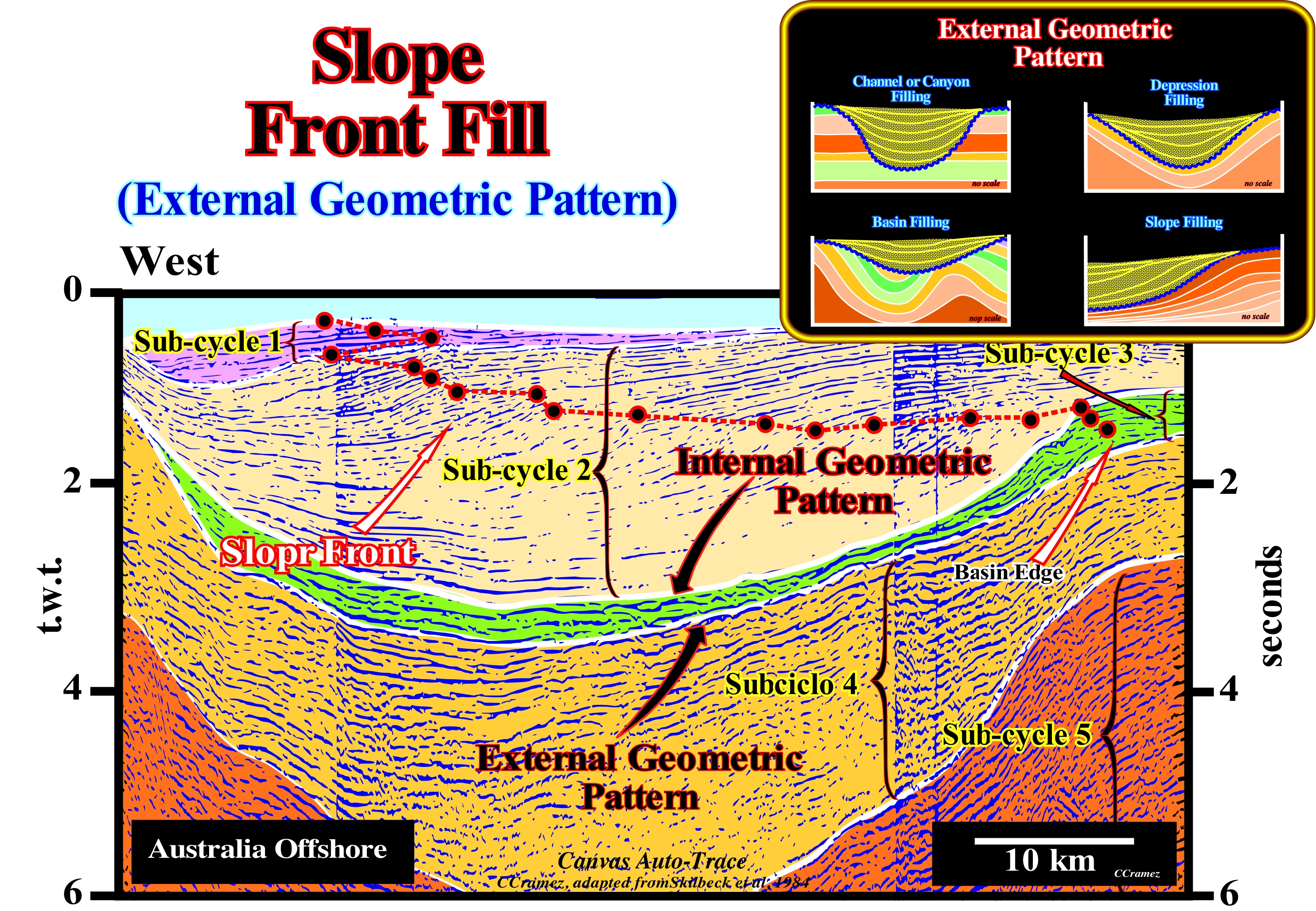 The western Australia offshore corresponds to the stacking of different basins of the classification of the sedimentary basins of Bally and Snelson (1980), which from bottom to top are: (i) A basement that corresponds, in most cases, to Paleozoic flattened folded belt ; (ii) Rift-Type basins that lengthening the Pangea supercontinent and especially its southern part, that is, the Gondwana small supercontinent, before the lithosphere breakup ; (iii) An Atlantic-type divergent continental margin, in which two sedimentary tectonic phases are distinguished: a) The transgressive phase with a retrogradational geometry, which is fossilized by the b) The regressive phase, whose geometry is progradational. These two sedimentary tectonic phases are separated by a downlap surface, in association with which marine rocks rich in organic matter were deposited, which are, probably, the main potential source-rocks of this offshore. This tentative geological interpretation of a Canvas auto-trace of West Australia offshore seismic line was made in continental encroachment subcycles induced by second-order eustatic cycles, whose time-duration varies from 3-5 My to 50 My and associated with changes in the tectonic subsidence rate (total subsidence, i.e., sediment thickness plus water-depth, decreased of the isostatic compensation effect, due to sedimentary overload, and increased by the compaction effect). The age differences between unconformities (erosional surfaces created by significant relative sea level falls) that separate the different encroachment subcycles must always be higher than 3-5 My and smaller than 50 My. On this tentative interpretation not only, the groups of sedimentary systems tracts can not be recognized, but it is very difficult to recognize in what periods the basin had or not a continental platform (shelf), which is, relatively, easy in a tentative interpretation made at the hierarchic level of a sequence-cycle. As illustrated on this tentative interpretation, the different unconformities were recognized, mainly, by the lapouts (reflection terminations) of the overlying reflectors (coastal and marine onlaps). In most cases, seismically, the reflection terminations of the reflectors underlying the dislocations are not very visible, but in some cases, toplaps (by truncation) are evident. In the last three continental encroachment subcycles (1, 2 and 3), the successive positions of the basin edge are easily recognized, as well as the filling of the continental slope front, particularly, in subcycle 2. The dip break of the lower unconformity of the subcycle 2 underlines the basin edge at the start of the subcycle. From this point, it is easy to see that the basin filling is progradational, i.e, the basin, downstream of the edge of the preceding subcycle, was filled by progradations that define the successive continental slopes. Taking into account the scales of the seismic line, and in particular the horizontal scale, it can be said that during subcycles 1, 2 and 3, seismically, the basin had no continental platform (no shelf). The successive basin edges, which here mark the continental edge, coincided with the outer limit of the coastal wedge or coastal prism of P. Vail. Under these conditions, it is very likely that in the distal part of most continental slope progradations shingled turbidites have been deposited (thickness less than the seismic resolution). This type of turbidite systems is more associated with instability of the basin edge than with significant relative sea level falls. Several relative sea level falls are visible within continental encroachment subcycle 2 (there are at least three coastal onlaps). However, they appear to have not been sufficiently important to change the geological conditions to lowstand geological conditional. Do not forget that at the level of a sequence-cycle, during the deposit of the lowstand systems tracts group, i.e., during the deposition of the subgroups: (i) Submarine basin floor fans (SBFF) ; (ii) Submarine slope fans (SSF) and (iii) Lowstand prograding wedge (LPW), the continental edge is not the basin edge. The basin edge is the last basin edge of the preceding sequence-cycle. However, during the deposition of the highstand systems tracts group (HSTG), i.e., during the deposition of the subgroups: (iv) Transgressive interval (TI) and (v) Highstand prograding wedge (HPW), the basin edge coincides with the continental edge, since the basin starts to has a continental shelf since the first transgressive surface.